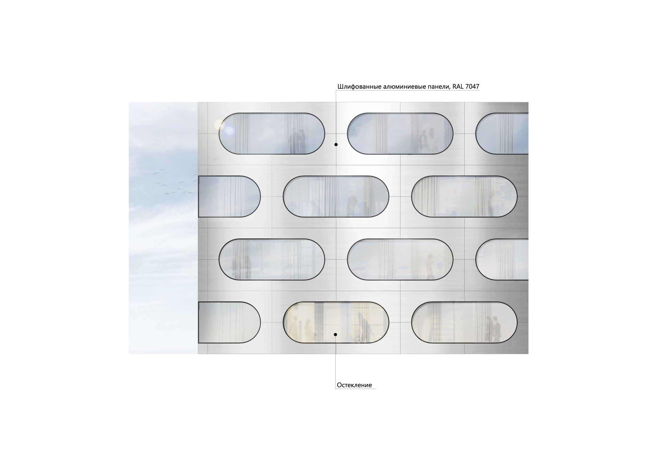 Как в объеме стилобатнои части ТПУ, так и в самом общественно–деловом комплексе использован один основнои материал отделки – полированныи алюминии, он же используется и в отделке стилобатнои части и кровель перронов, таким образом объединены самые разные по форме и деталям части комплекса. Дизай–код присутствует во всех элементах здании и ландшафта, эффектную форму окон высокой башни повторяют и планы, и элементы мощения, и рисунок пола в интерьере, и отдельные элементы фурнитуры и светильников.