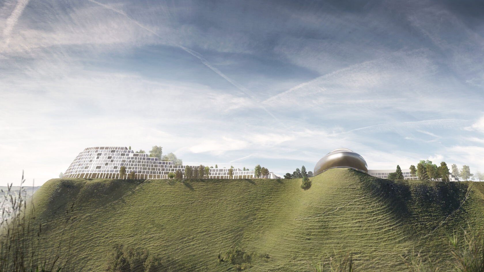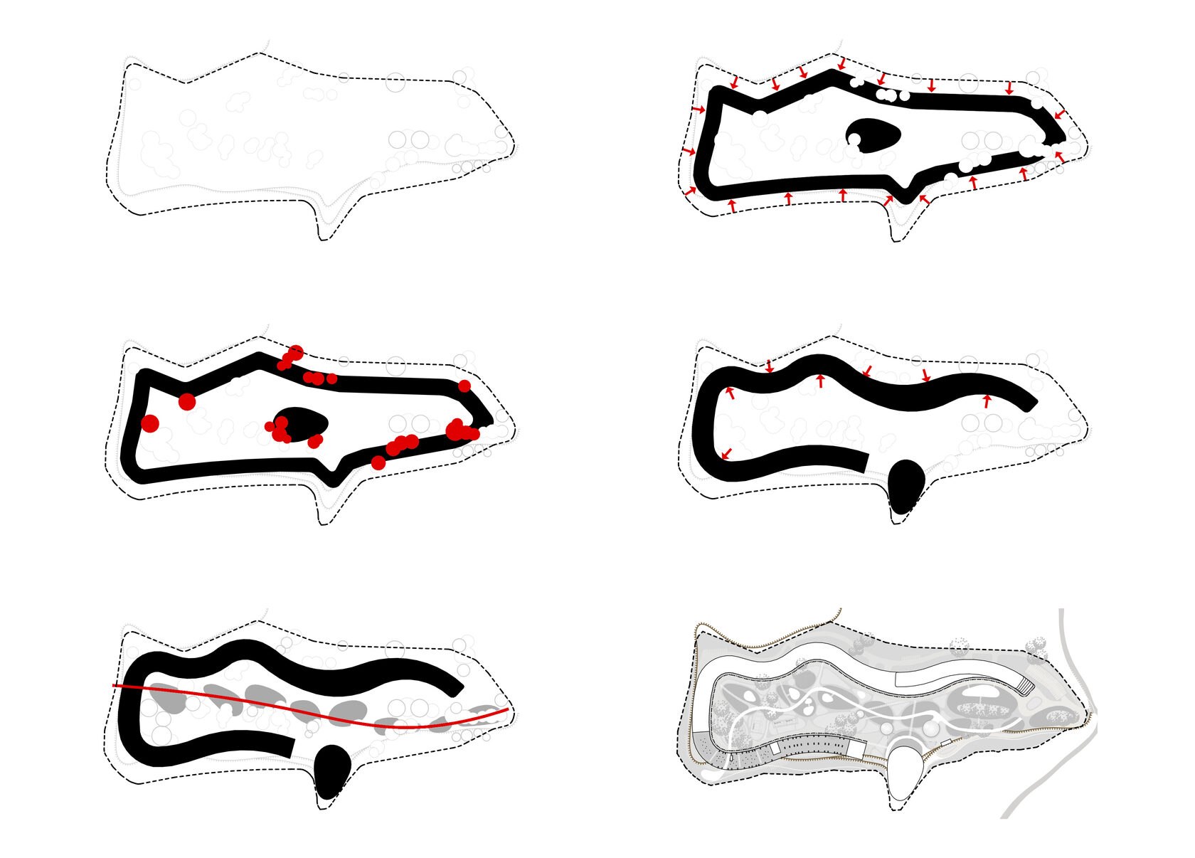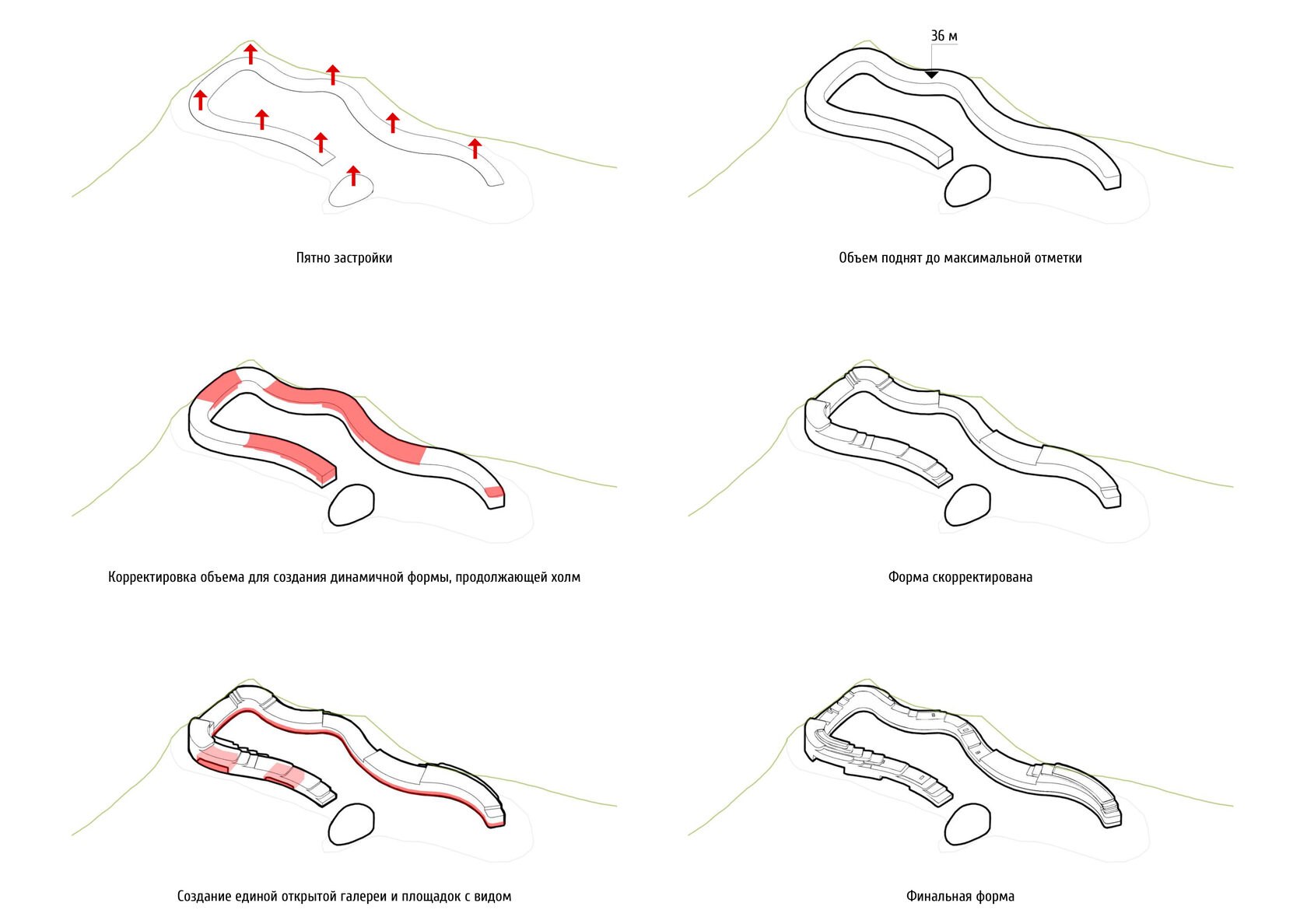 Участок расположен на естественном холме. Основная идея проекта – органичное включение в ландшафт и бережное отношение к природе. Архитектура основного объема комплекса продолжает естественные линии холма, а все здания расположены на участке с учетом сохранения максимального количества существующих деревьев. Концертный зал разместился на самом склоне, нависающая часть здания повторяет форму этой террасы и позволяет организовать смотровую площадку с живописным видом.
