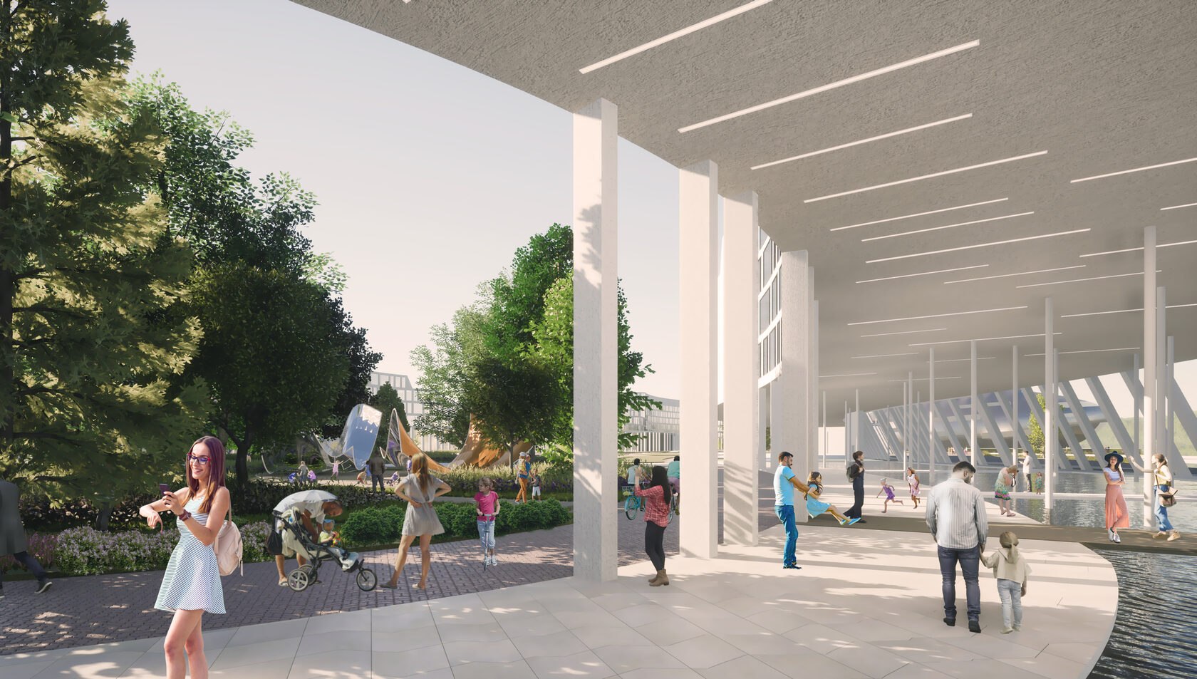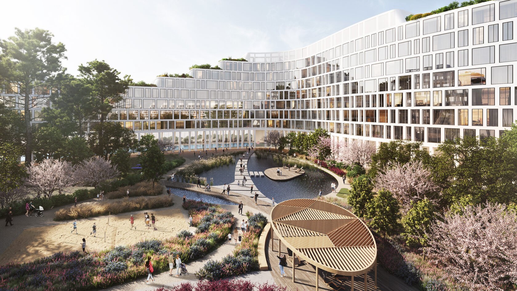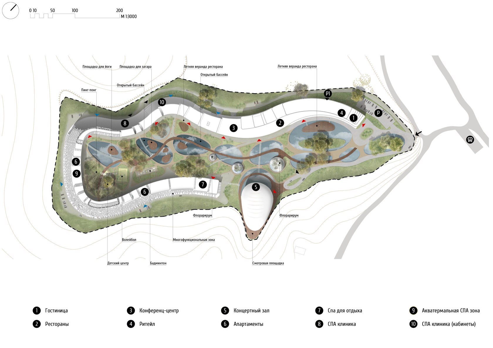 Благодаря полузамкнутой форме на территории образуется свой микроклимат с ботаническим садом и искусственными водоемами, которые формируют основную ось участка. Основной пешеходный путь проложен по этой оси. Также можно пройтись вдоль всего здания по галерее из которой можно попасть в спа, крытый бассейн, гостиницу, рестораны и медицинский центр. Входы в апартаменты запроектированы с внешней стороны здания.