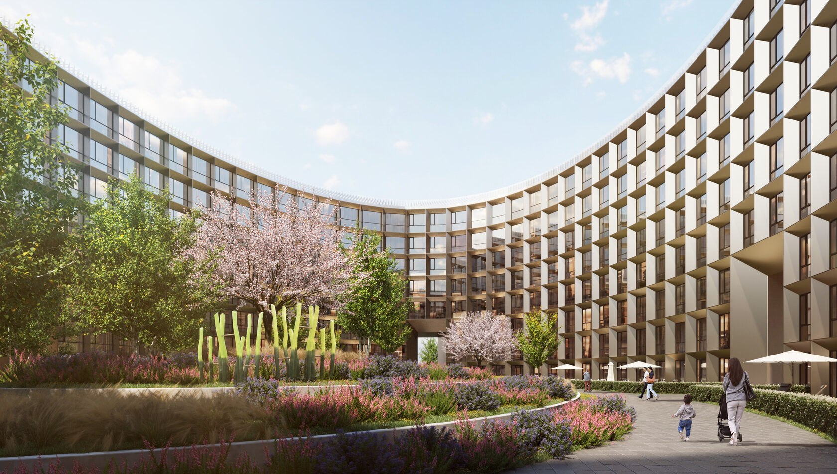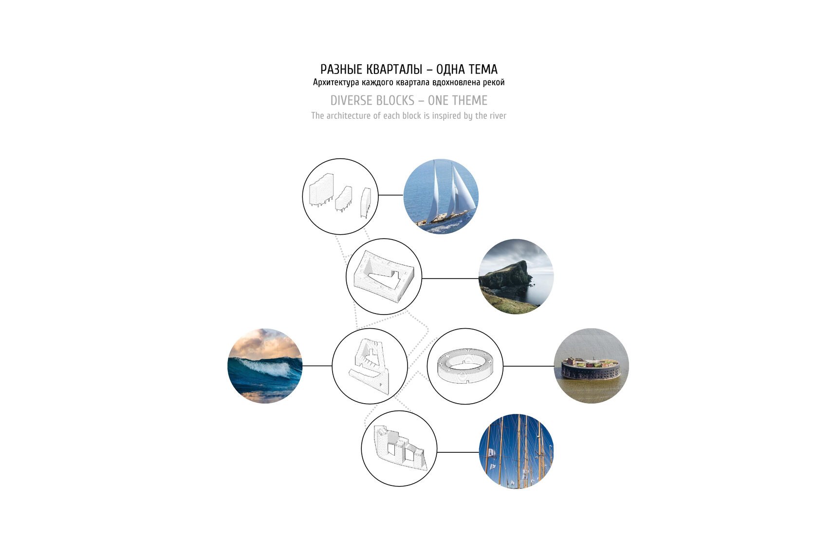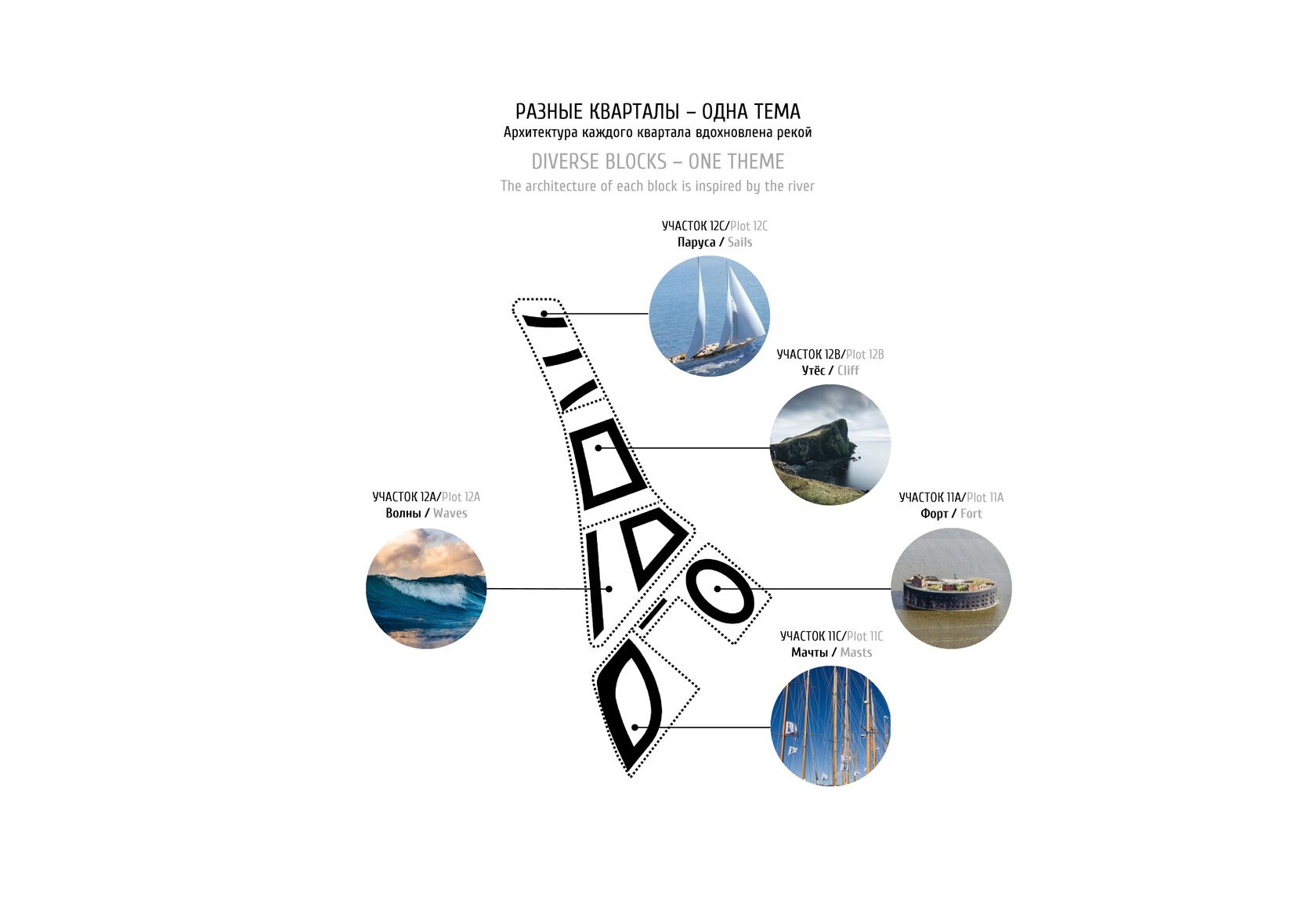 На шести участках размещаются дома квартального, секционного и башенного типа. На участках с башнями дворовое пространство формируется за счёт торговых и открытых прогулочных галерей в уровне 1-го этажа. Квартальные, секционные дома и башни на отдельных участках также решены по-разному, но все кварталы объединяет тема реки. Каждый дом вдохновлен речным образом и каждый с названием, которое объясняет эту идею.