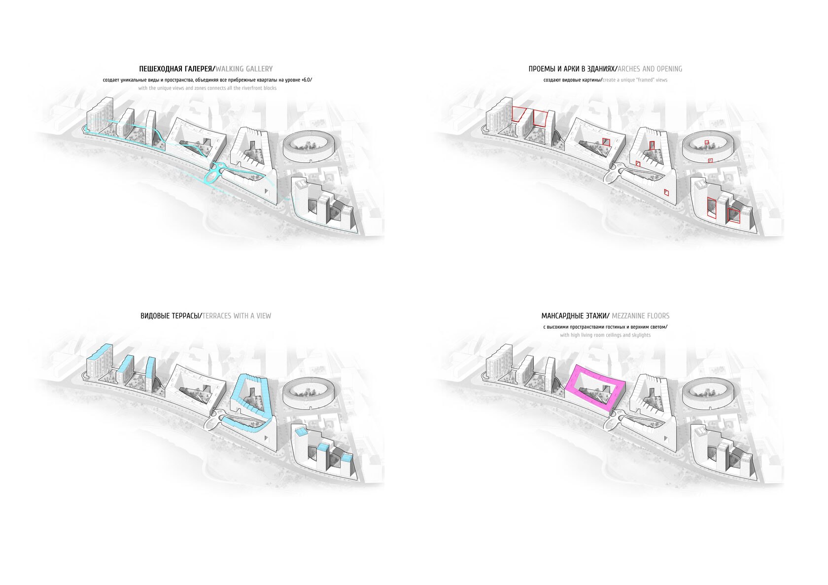 В конкурсном проекте предлагается продолжить тему разнообразной типологии зданий и проявить эту идею в кварталах на набережной.