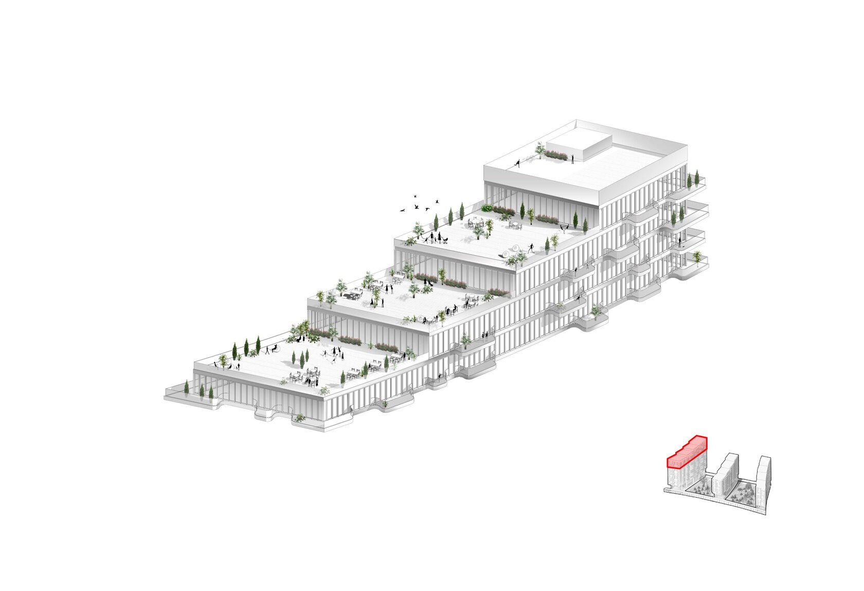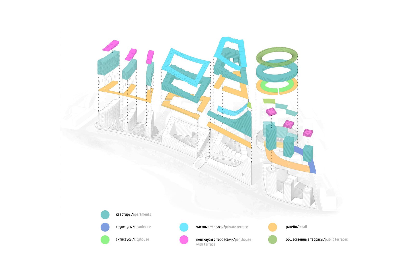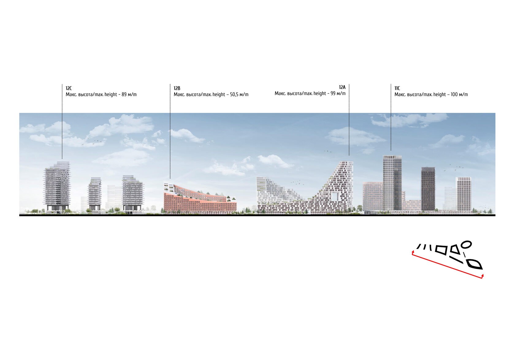 Террасированные дома переменной этажности и разновысотные башни создают волнообразный динамичный силуэт застройки со стороны реки. Террасированные дома, стоящие в глубине участков первой линии, также образуют волнообразную линию на втором плане. Благодаря такому решению на протяжении всего пути вдоль комплекса открываются живописные виды, непохожие друг на друга.
