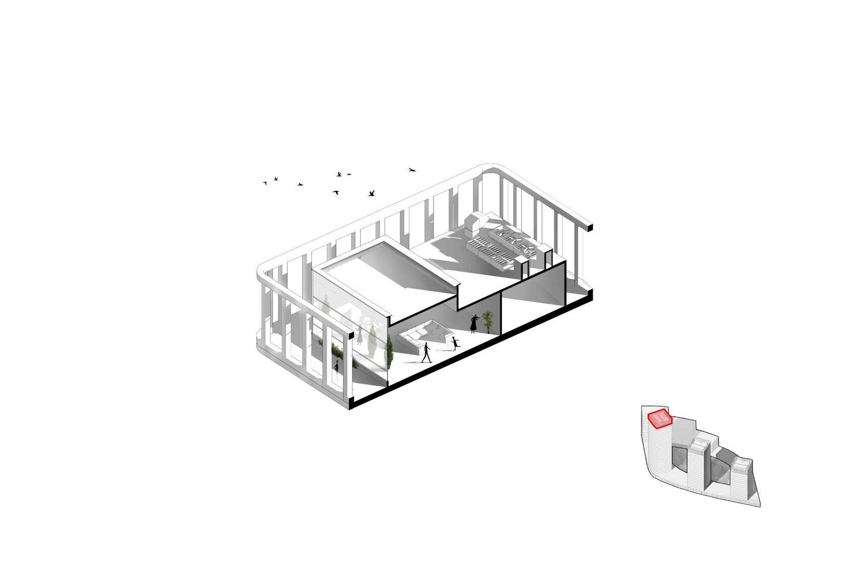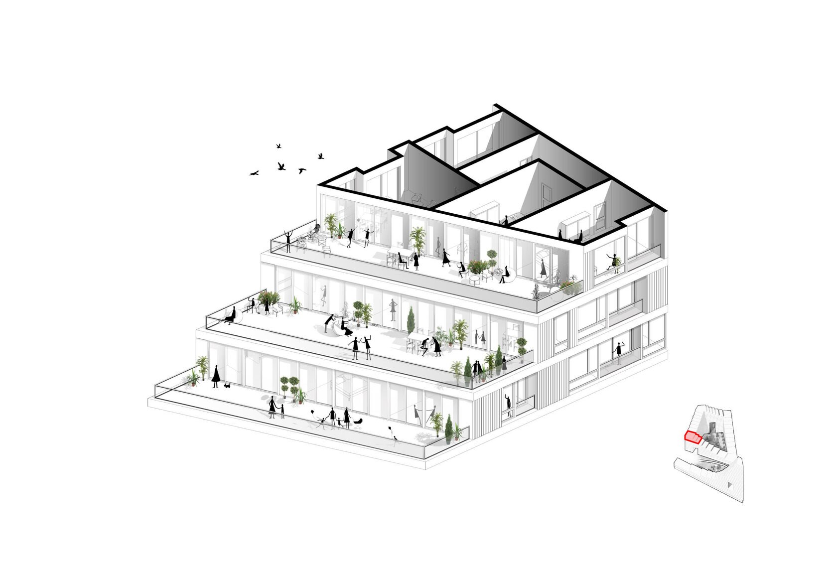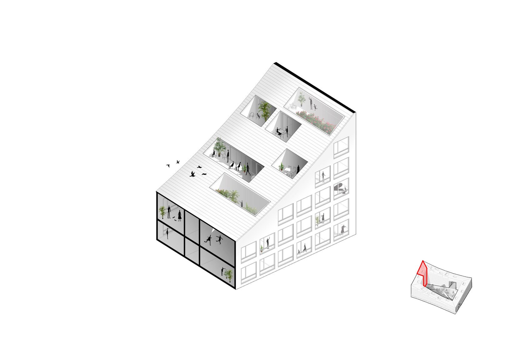 Террасированные дома переменной этажности и разновысотные башни создают волнообразный динамичный силуэт застройки со стороны реки. Террасированные дома, стоящие в глубине участков первой линии, также образуют волнообразную линию на втором плане. Благодаря такому решению на протяжении всего пути вдоль комплекса открываются живописные виды, непохожие друг на друга.