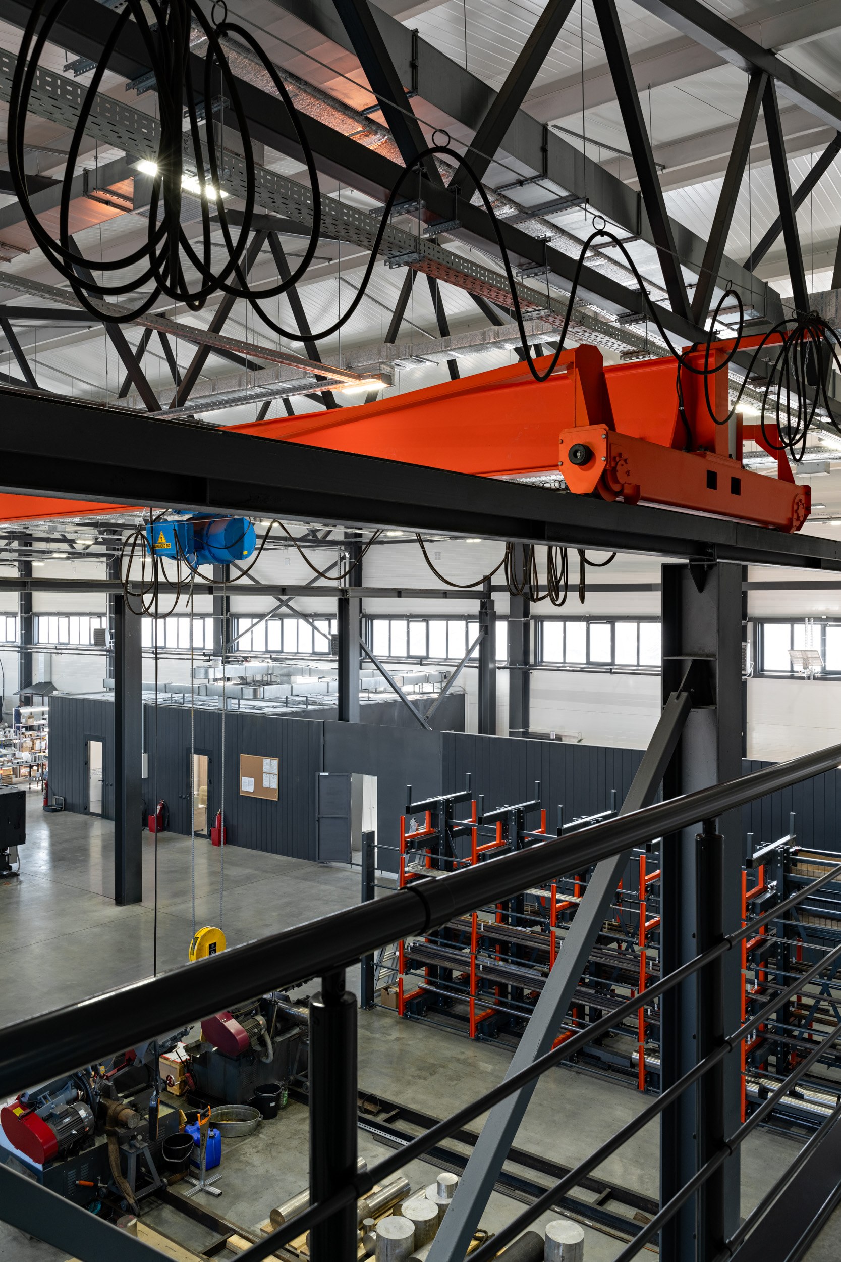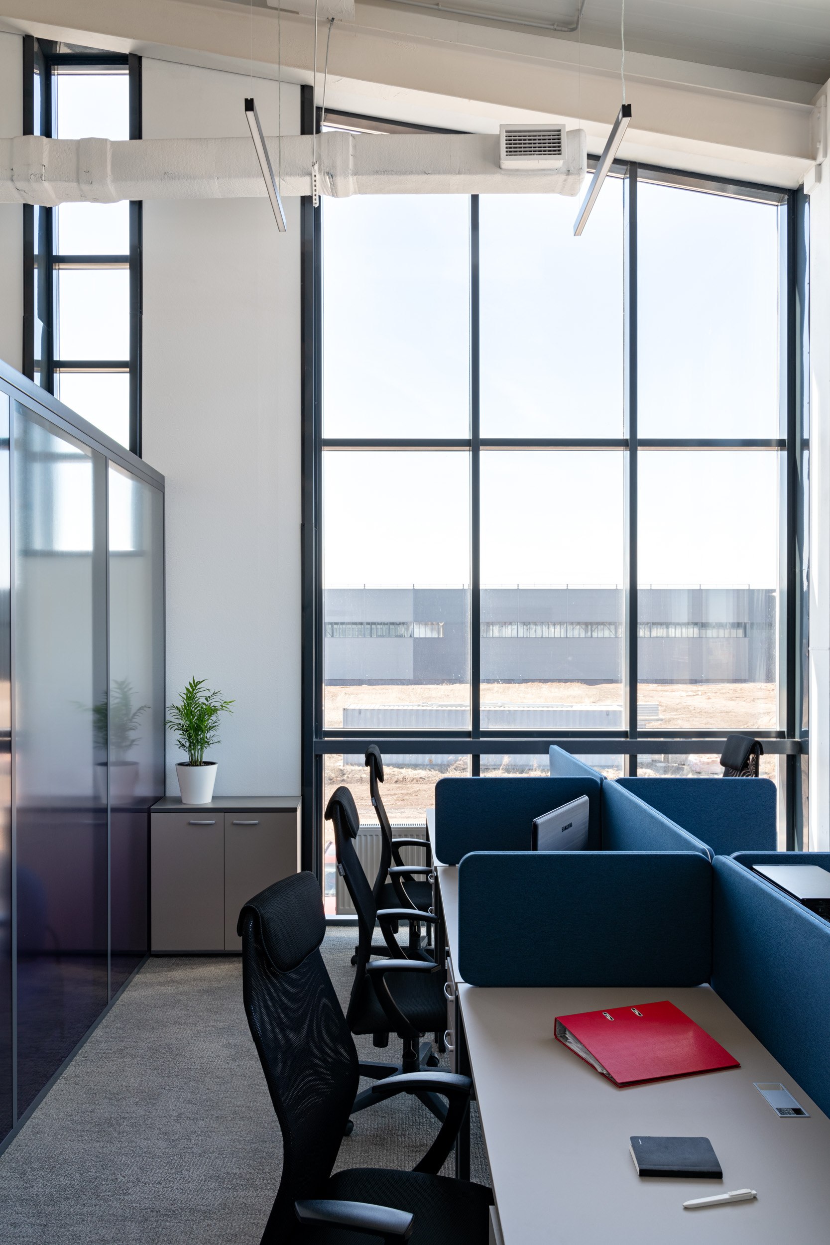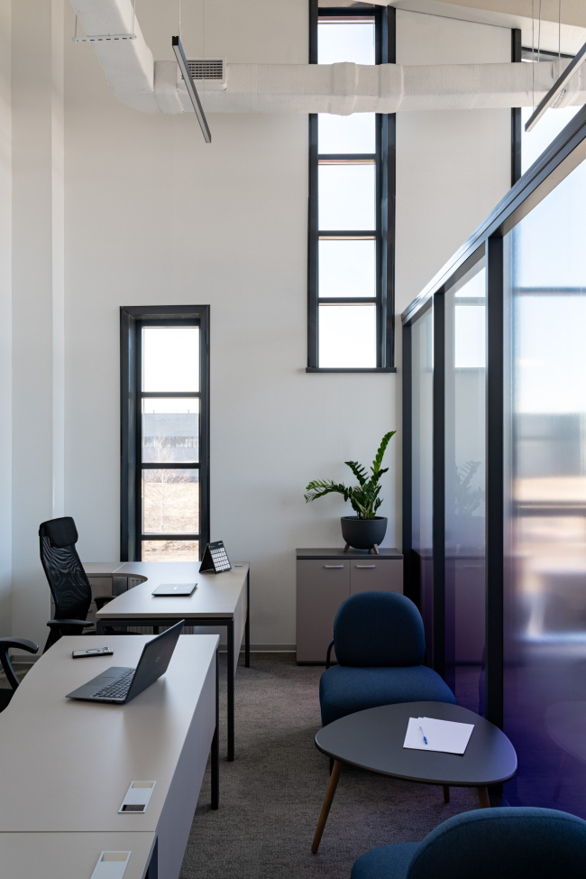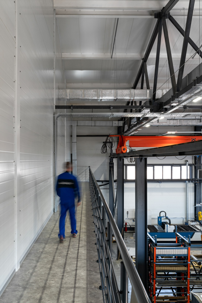 Особое внимание было уделено функциональному зонированию. Важно было соблюсти санитарные, пожарные и технологические нормы, организовав маршруты так, чтобы сотрудники могли свободно взаимодействовать, но не пересекались там, где это недопустимо. Мы предусмотрели специальный балкон вдоль цеха, связывающий административный блок с производственной частью. Он позволяет быстро перемещаться между кабинетами и рабочими зонами, не теряя времени на лестницы и длинные переходы.