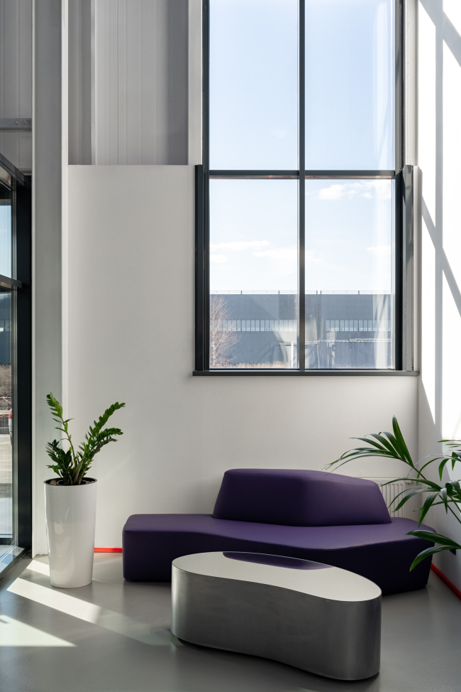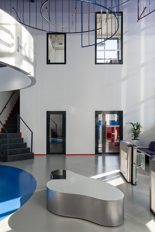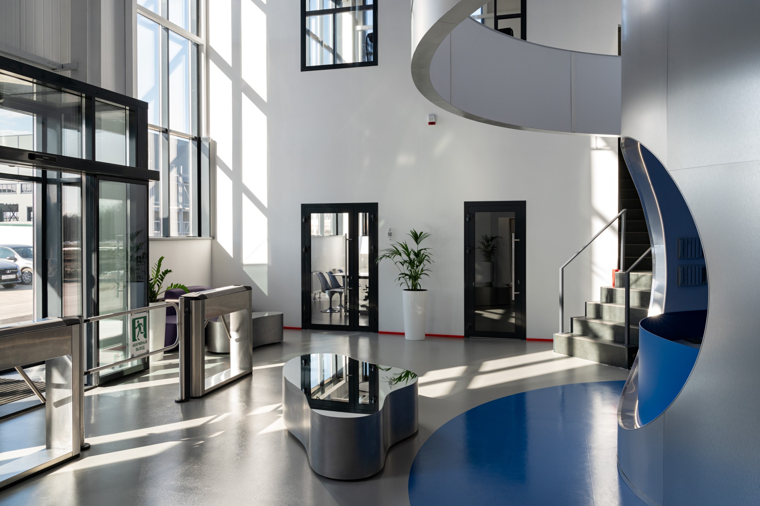 Фойе было решено сделать двухсветным – это архитектурный прием, который визуально увеличивает пространство, наполняет его воздухом и светом. Такой масштабный жест перекликается с промышленным размахом самого производства, демонстрируя технологичность и амбициозность компании.