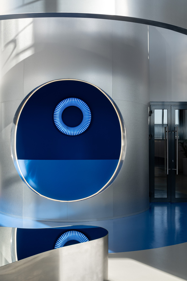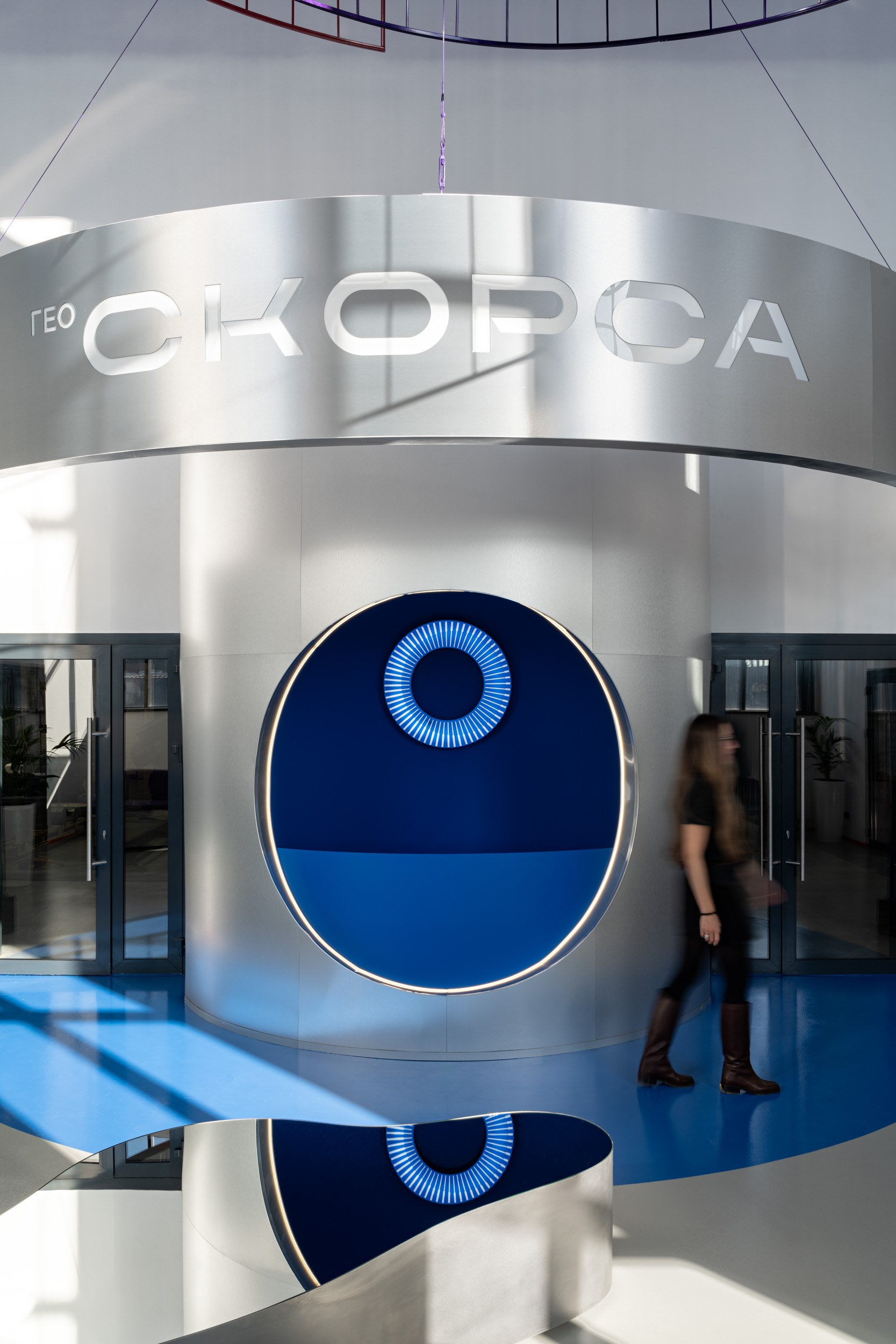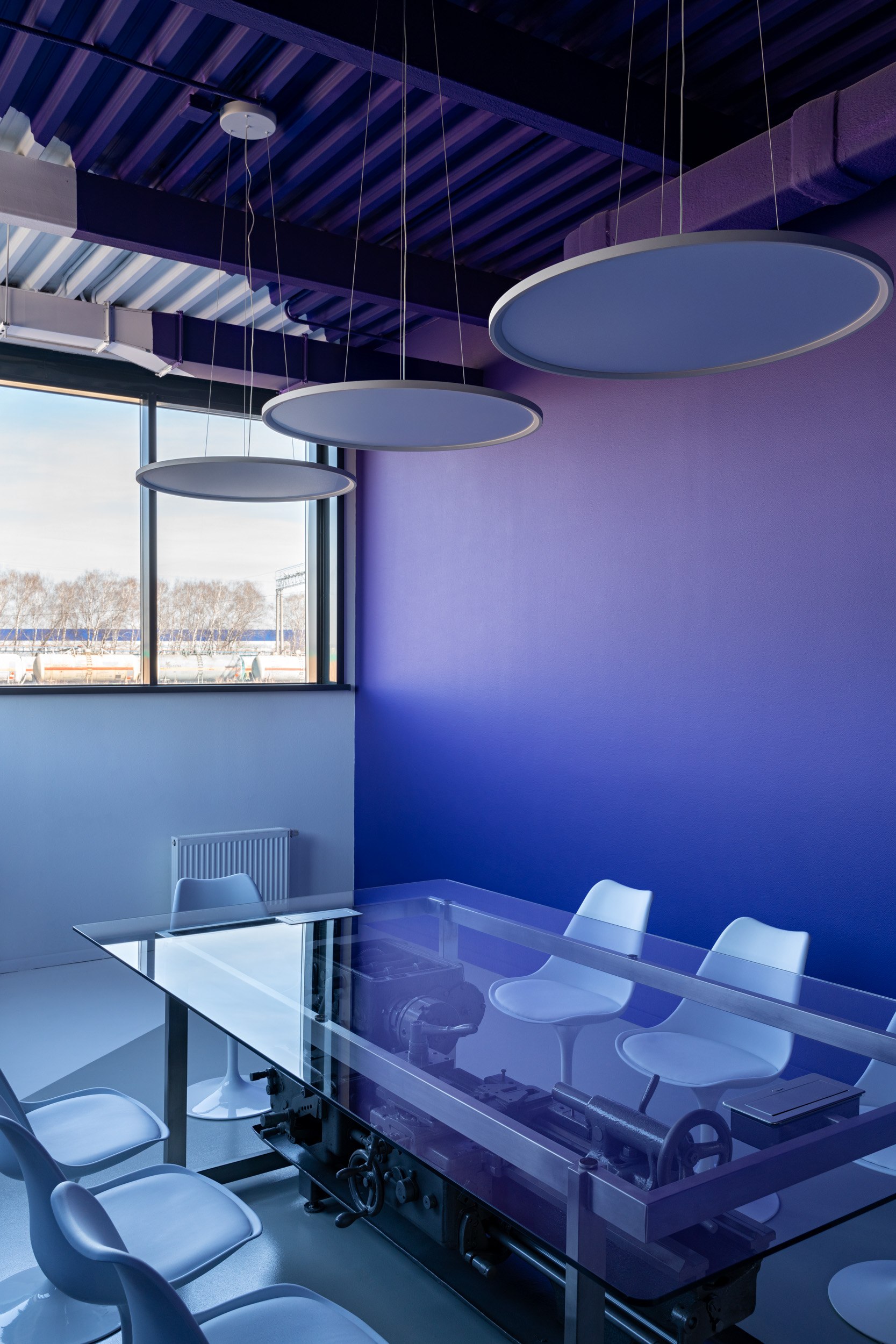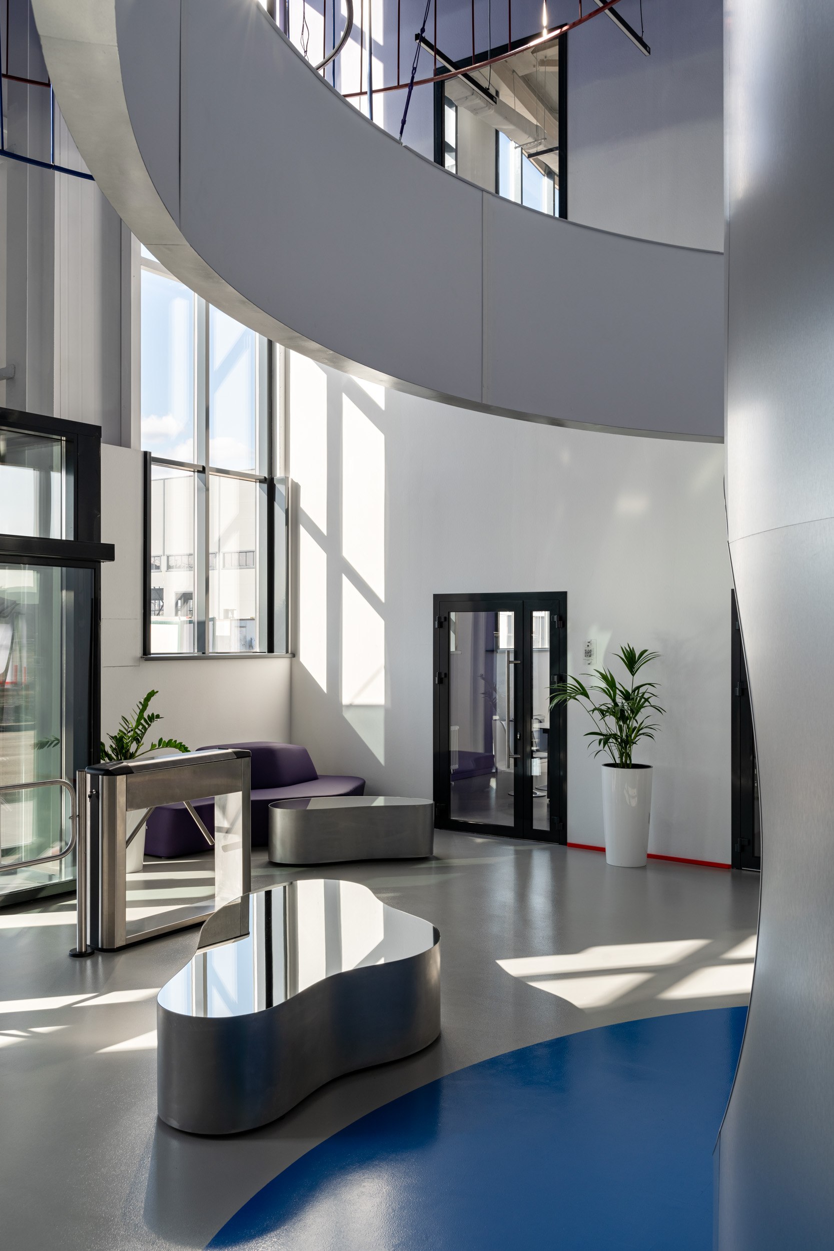 Концепция интерьера строилась на образах потока, энергии и вихря – метафорах, связанных с работой газотурбинного двигателя, который выпускается на этом заводе. Мы стремились передать ощущение движения и технического прогресса через архитектуру, пластику, свет и материалы.