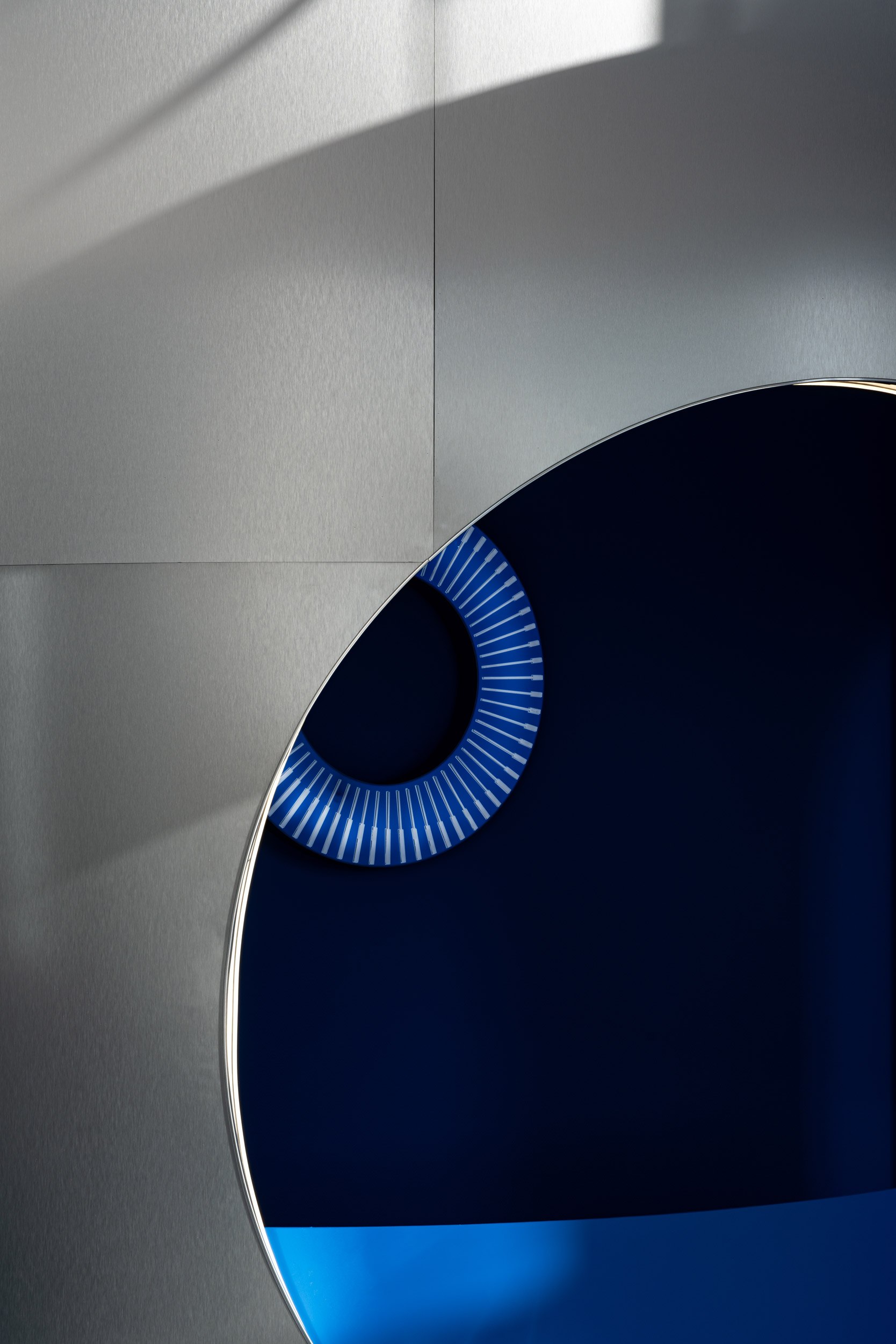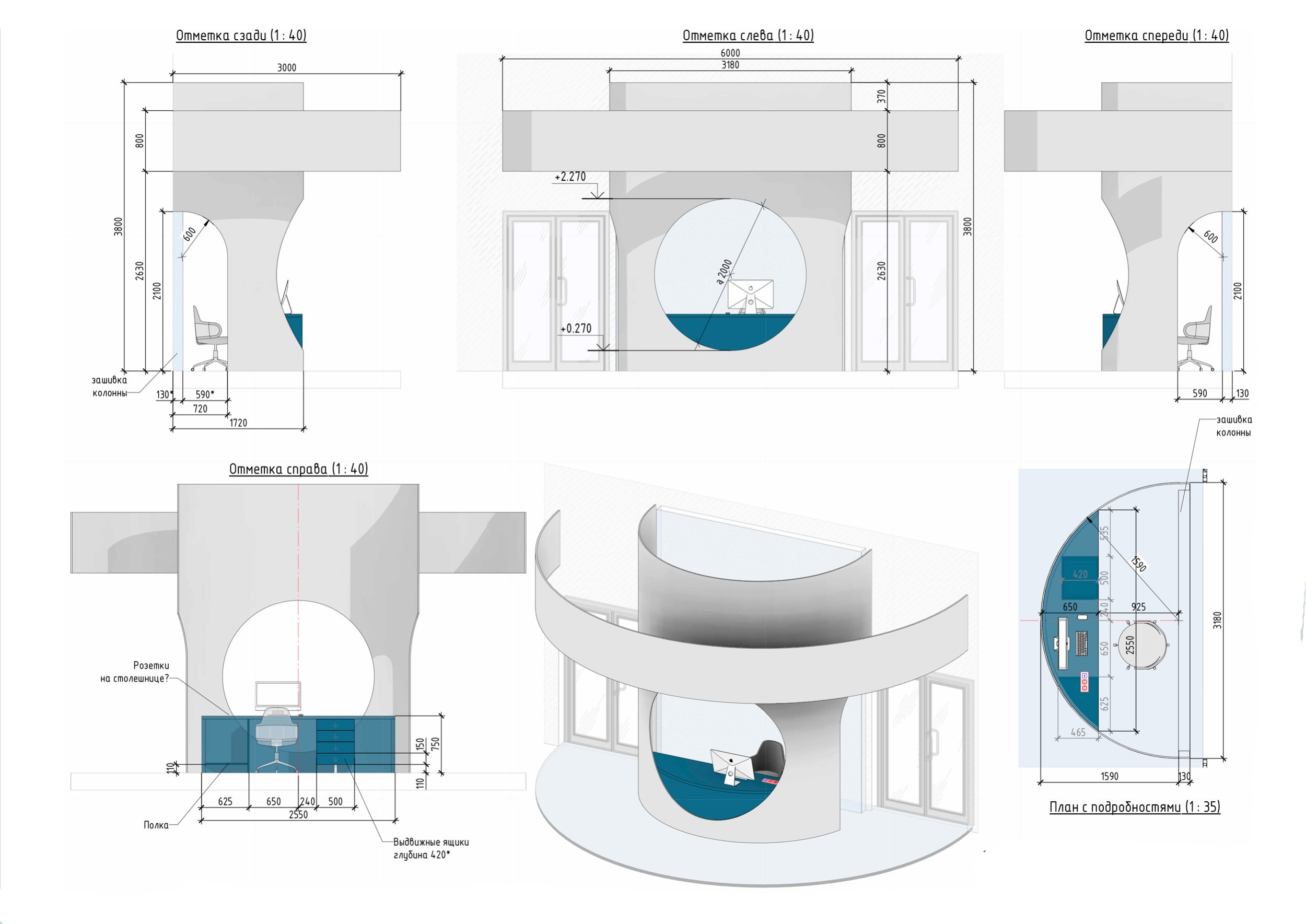 Ресепшн, встречающий посетителей в фойе, также полностью спроектирован нами и несёт в себе ту же идею динамики и энергии. Этот объём построен на округлых, обтекаемых форма х, которые символизируют вихрь, поток воздуха, движение. Это не просто функциональный элемент – это скульптурный объект, задающий тон всему пространству фойе. Его форма, свет и тактильные поверхности моментально формируют у входящего ассоциацию с технологичностью, прогрессом и современным дизайном.