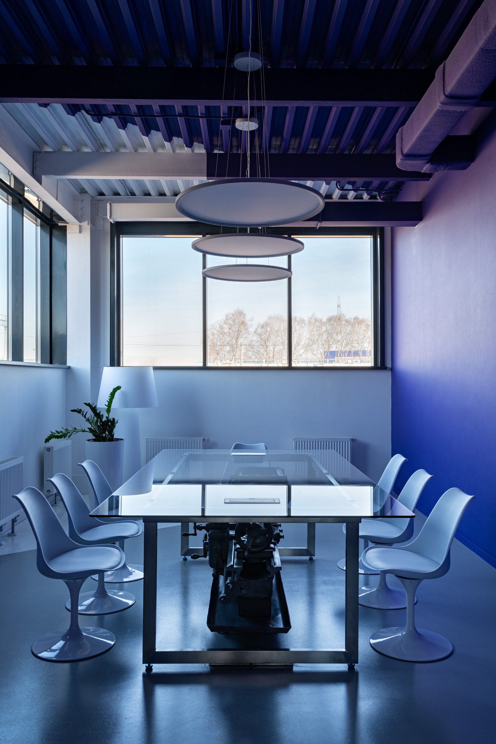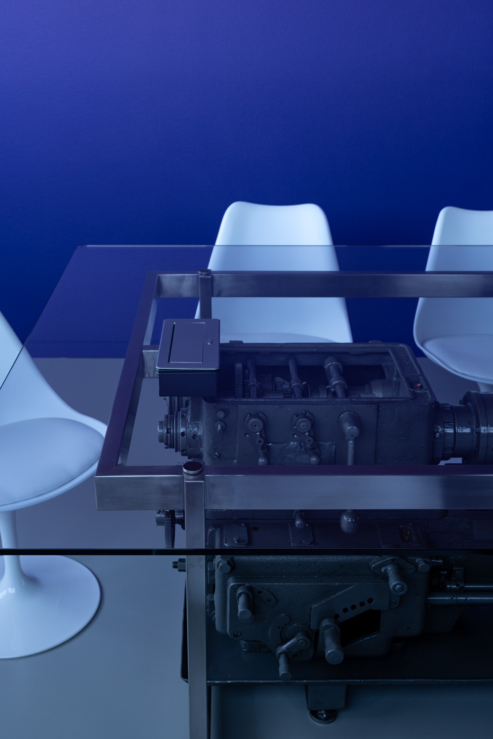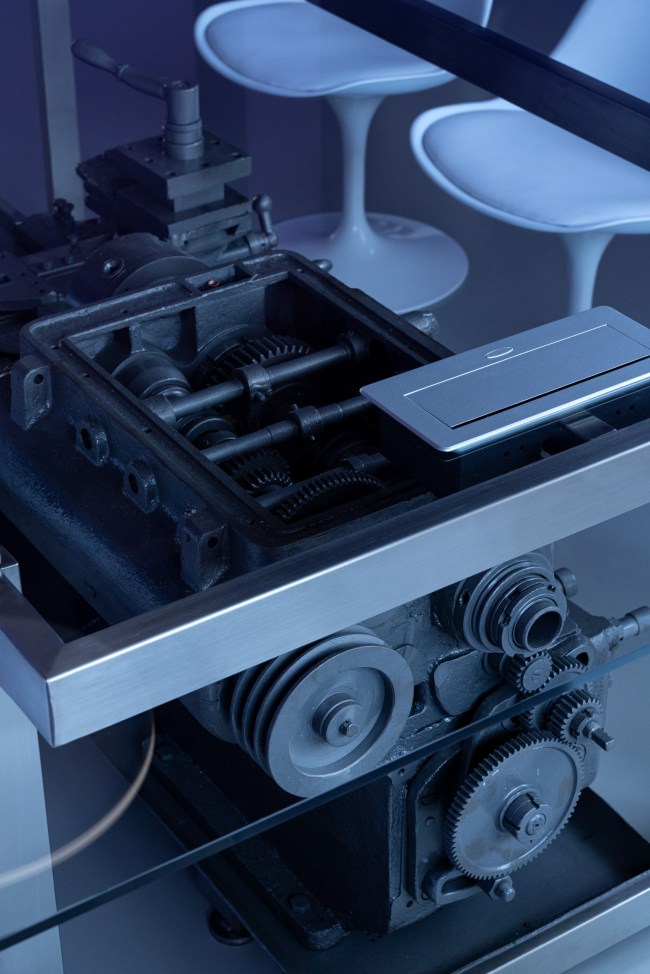 Другим значимым предметом стало переговорное пространство, где внима ние привлекает авторский стол, разработанный и изготовленный специально для этого проекта. В его основе лежит уникальная идея – для создания данного стола был использован настоящий советский токарный станок 1930-х годов. Это не только технический и эстетичес кий объект, но и своеобразная дань инженерной истории, мост между прошлым и настоящим. Мы не просто интегрировали станок как арт-объект – он был переосмыслен, адаптирован под современное использование. Внутри металлической конструкции мы провели скрытую электрику, а в стеклянную столешницу были аккуратно встроены розетки, что делает стол не только эффектным, но и полностью функциональным. Он стал настоящим символом слияния инженерного наследия и современной технологической культуры.