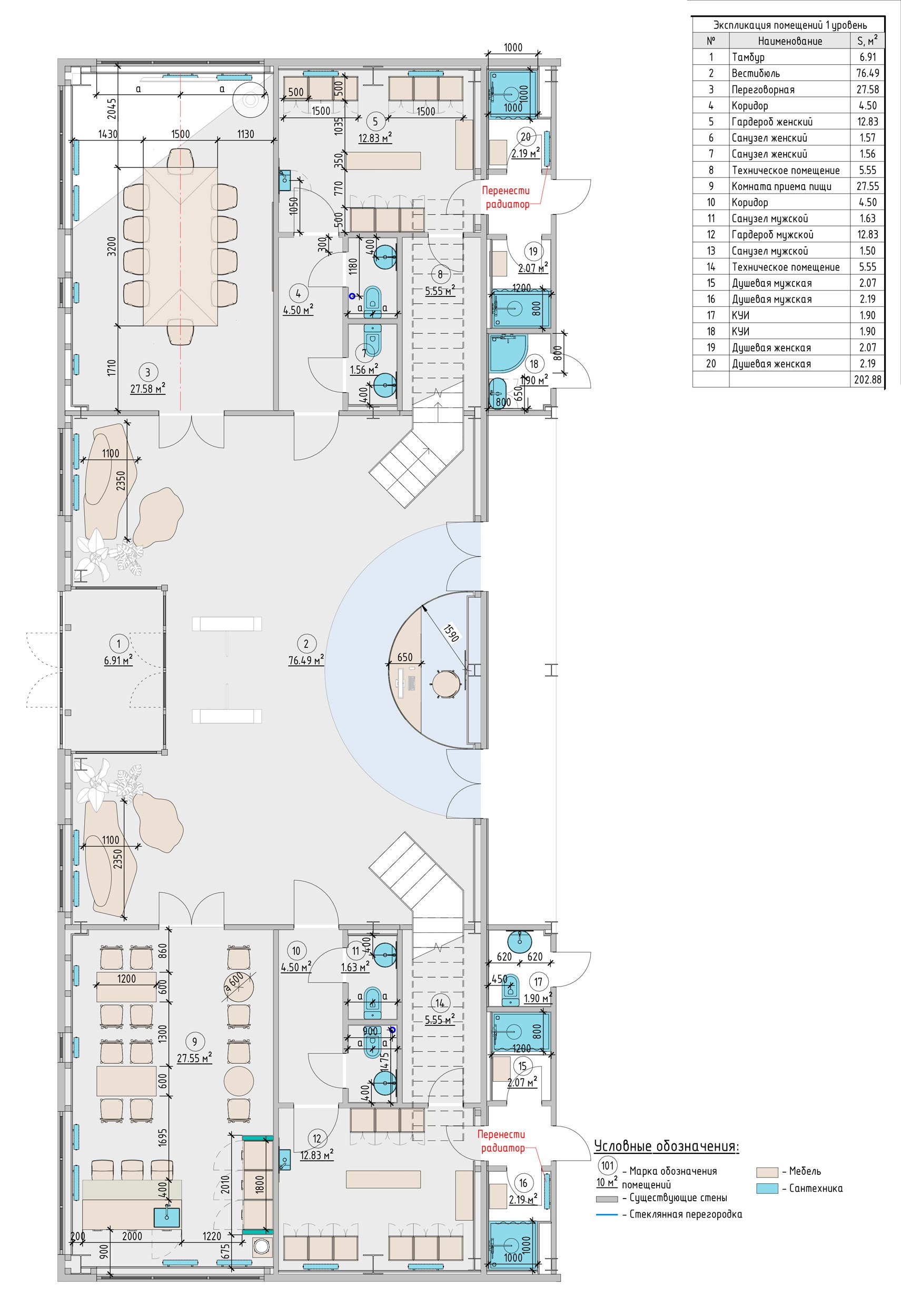 Ангарная часть разделена на два крыла – мужское и женское, предназначенные для персонала. В этих зонах сотрудники могут переодеться перед началом смены и оставить личные вещи. Крылья оснащены всем необходимым: шкафчиками для хранения, удобными скамейками, а при необходимости – санитарными узлами и душевыми.