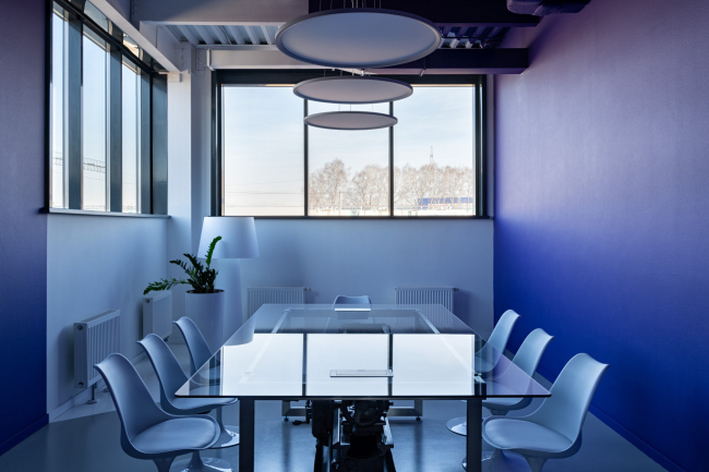 На первом этаже также размещена переговорная комната. Она стала логичным продолжением общей концепции: здесь используются те же цветовые и стилистические решения, что и в фойе, создавая ощущение единого, продуманного пространства.