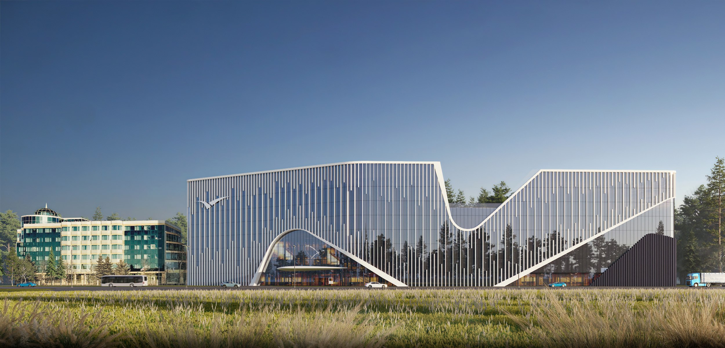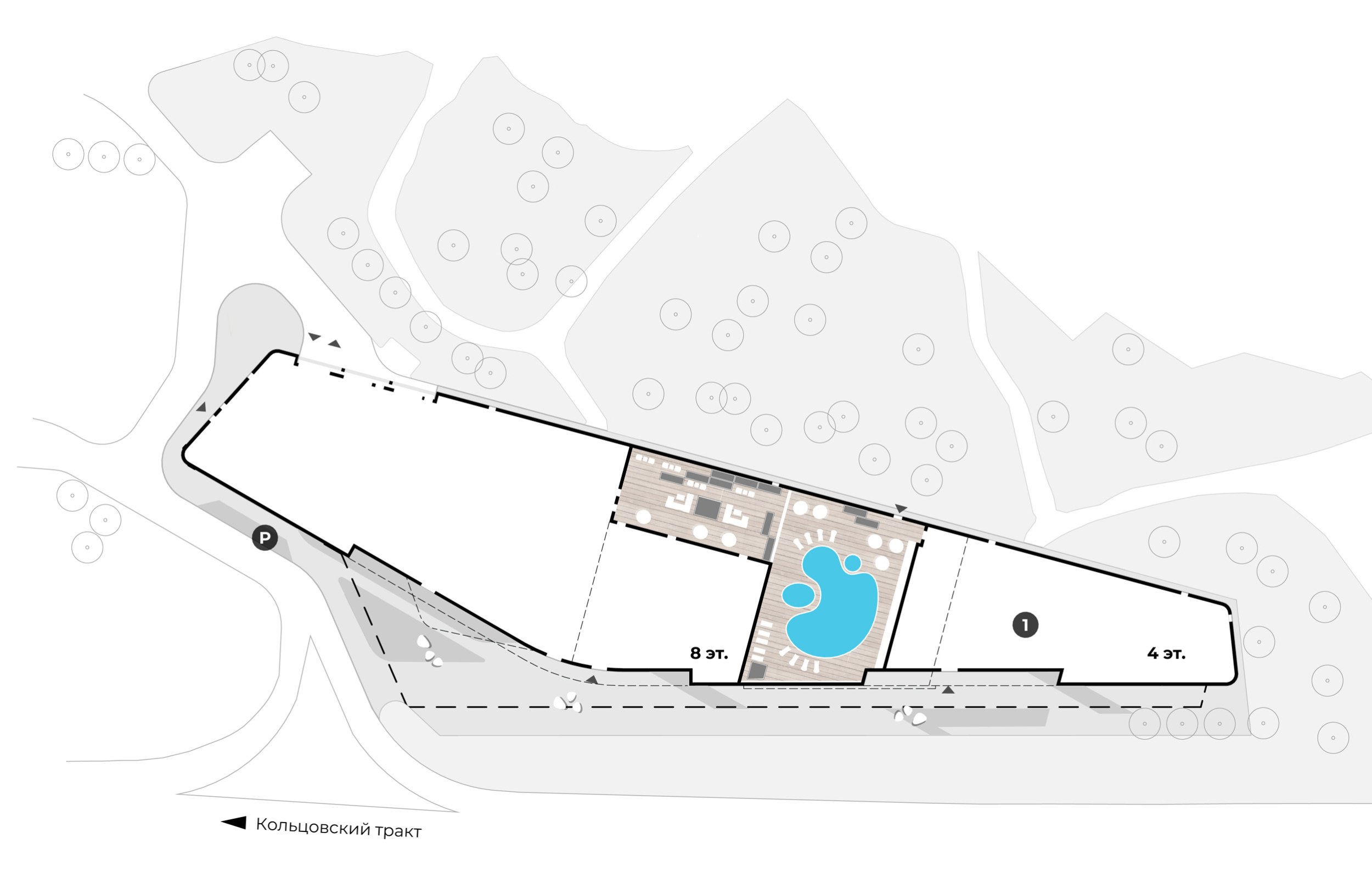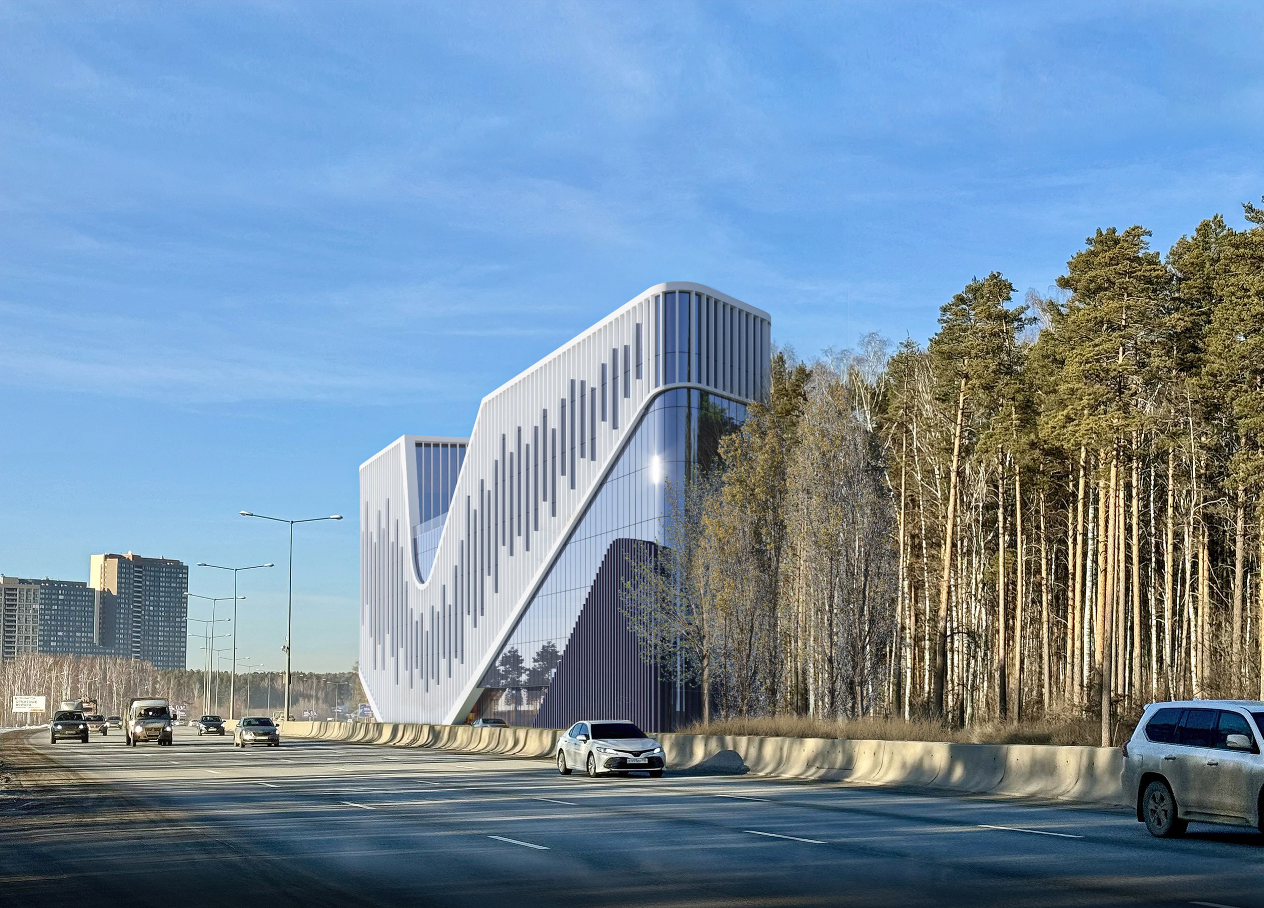 Особое значение имеет сам участок проектирования: узкая, вытянутая вдоль Кольцовского тракта территория, воспринимаемая преимущественно в движении – при подъезде к городу на автомобиле. Именно поэтому архитектурное решение выстроено на идее динамического восприятия.