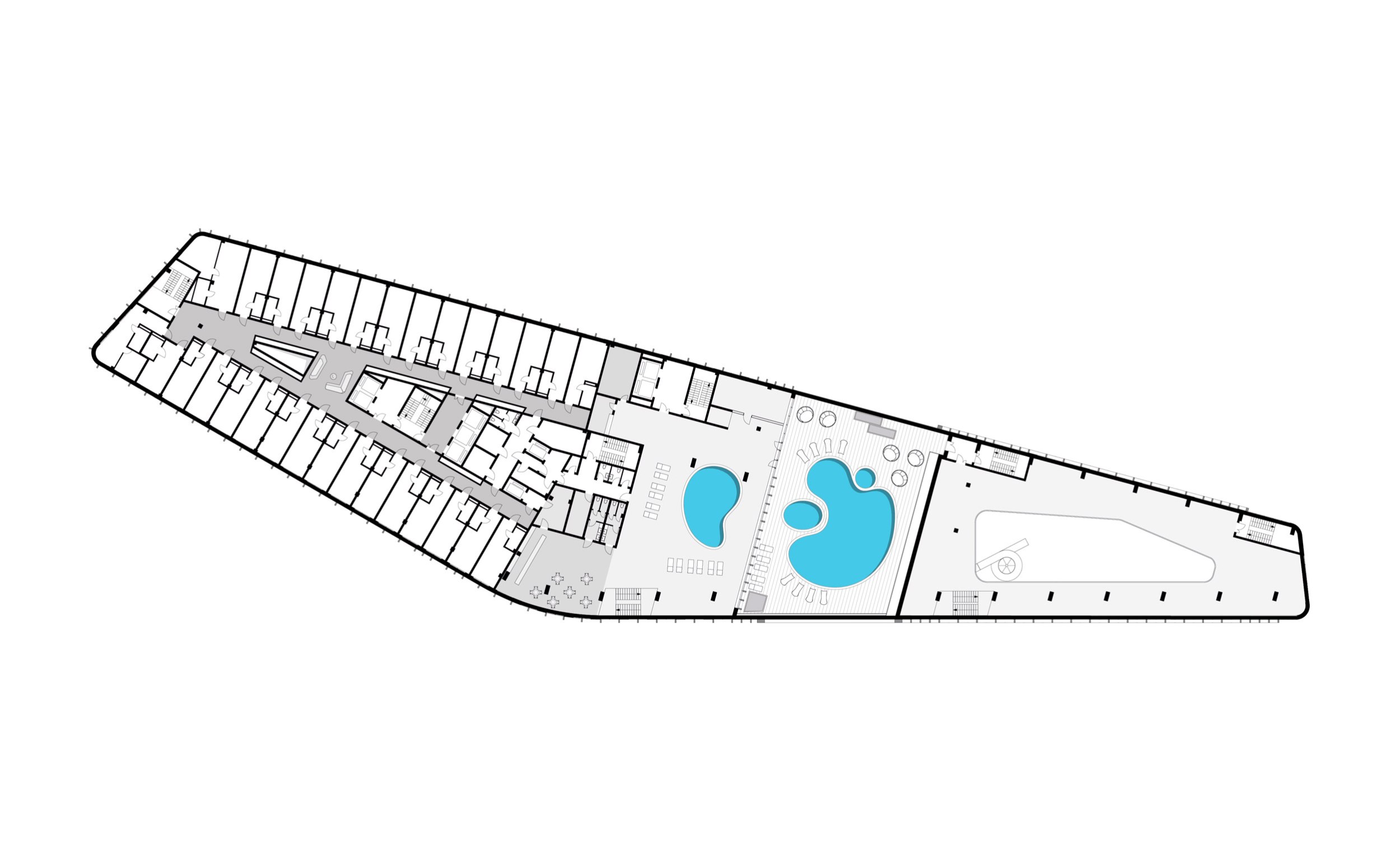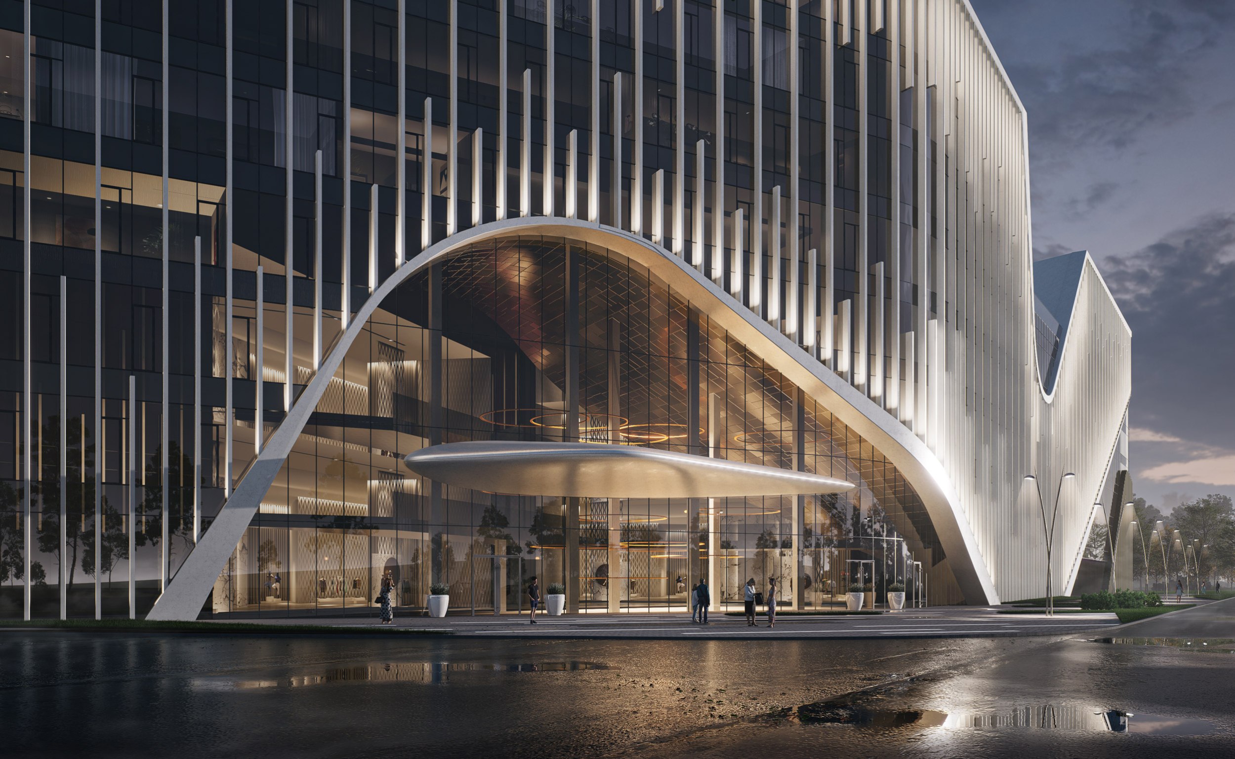 Композиция фасада сформирована как единая волна. С одной стороны, этот приём позволяет органично объединить различные функциональные зоны в одном архитектурном объёме. С другой – создаёт выразительный образ, который, несмотря на близость оживлённой автомагистрали, подчеркивает внутреннюю экосистему комплекса: отель, семейный досуговый центр, аквапарк со спа-зоной и открытый бассейн на крыше работают как единый организм.