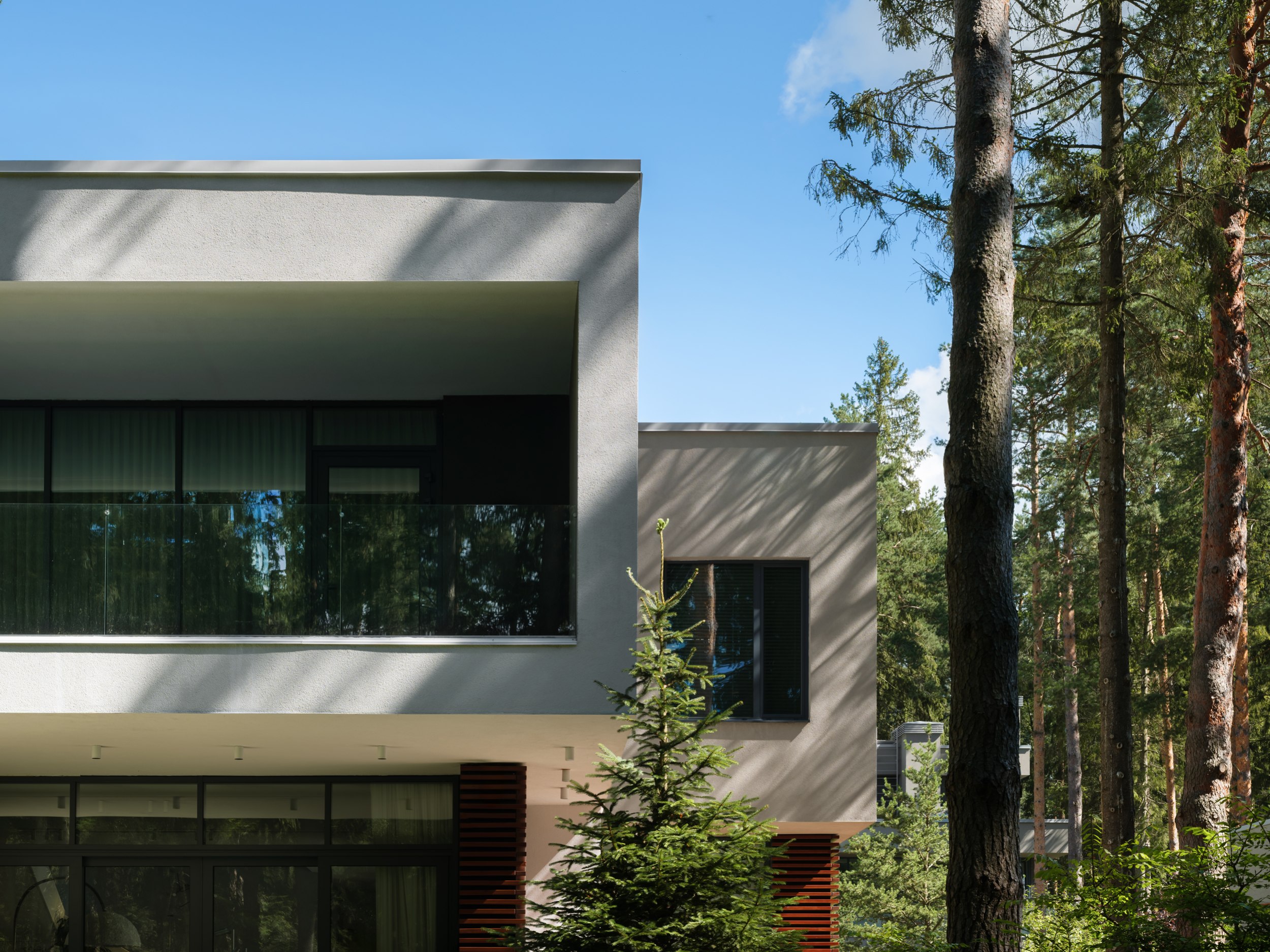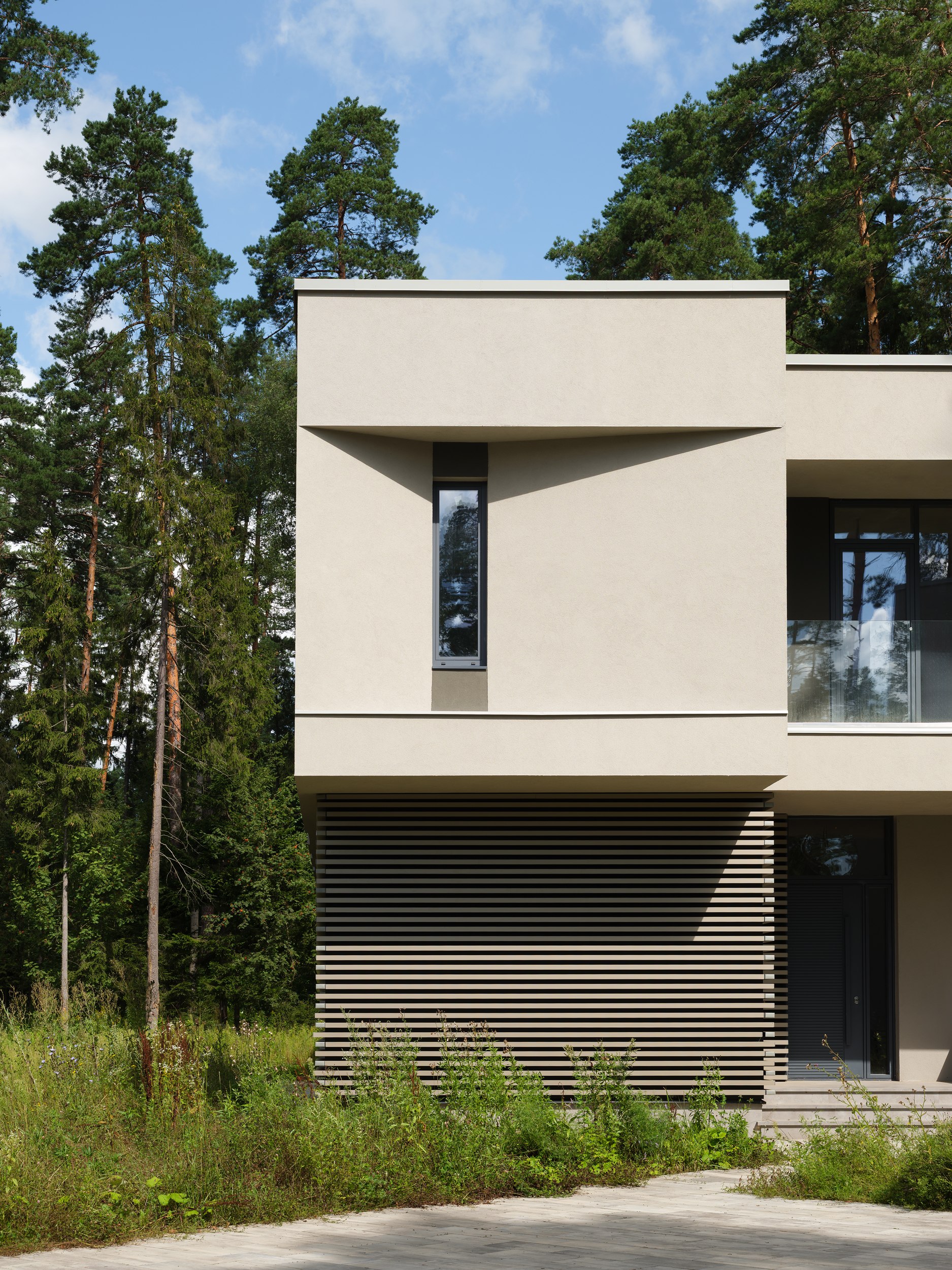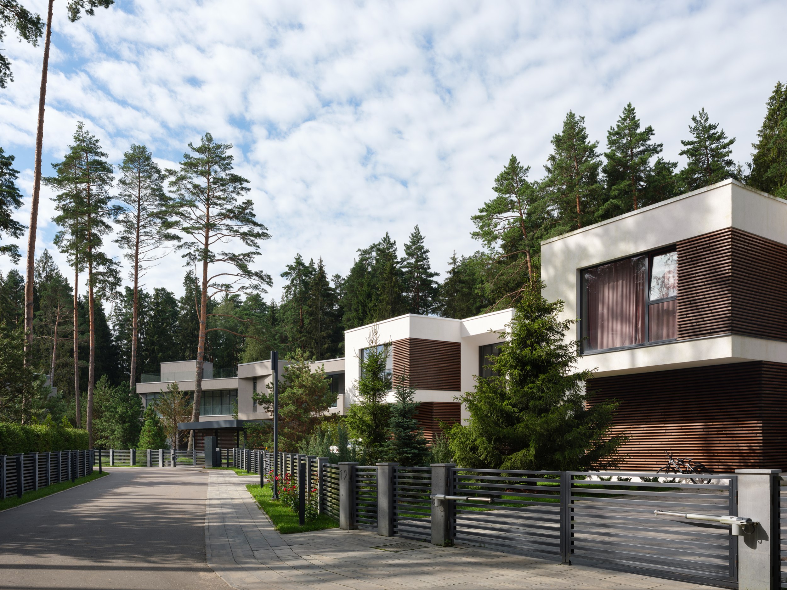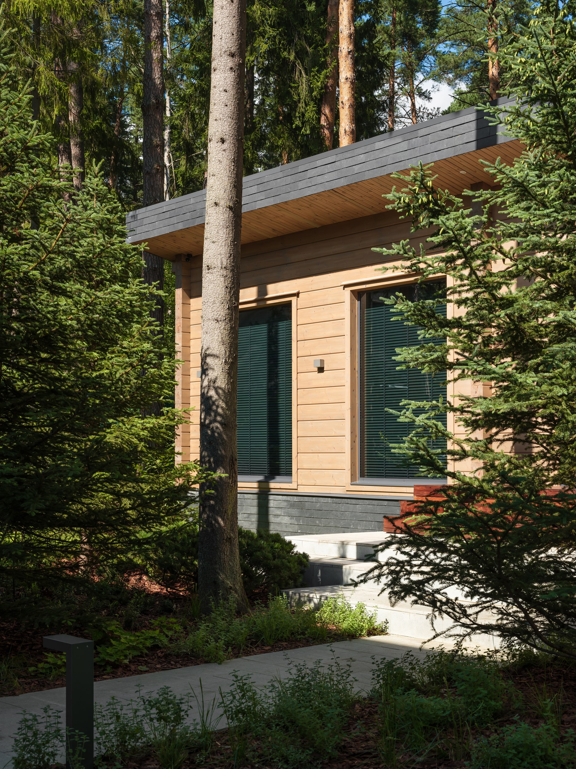 Фасады выполнены в минималистичном ключе с использованием натуральных материалов. Особое внимание уделено видовым характеристикам: через панорамные окна открываются перспективы на вековой лес, а комнаты ориентированы таким образом, чтобы природа становилась частью интерьера – его главным изобразительным акцентом. Каждый участок продуман как художественный холст: окно превращается в раму, внутри которой лес и смена сезонов создают живую картину.