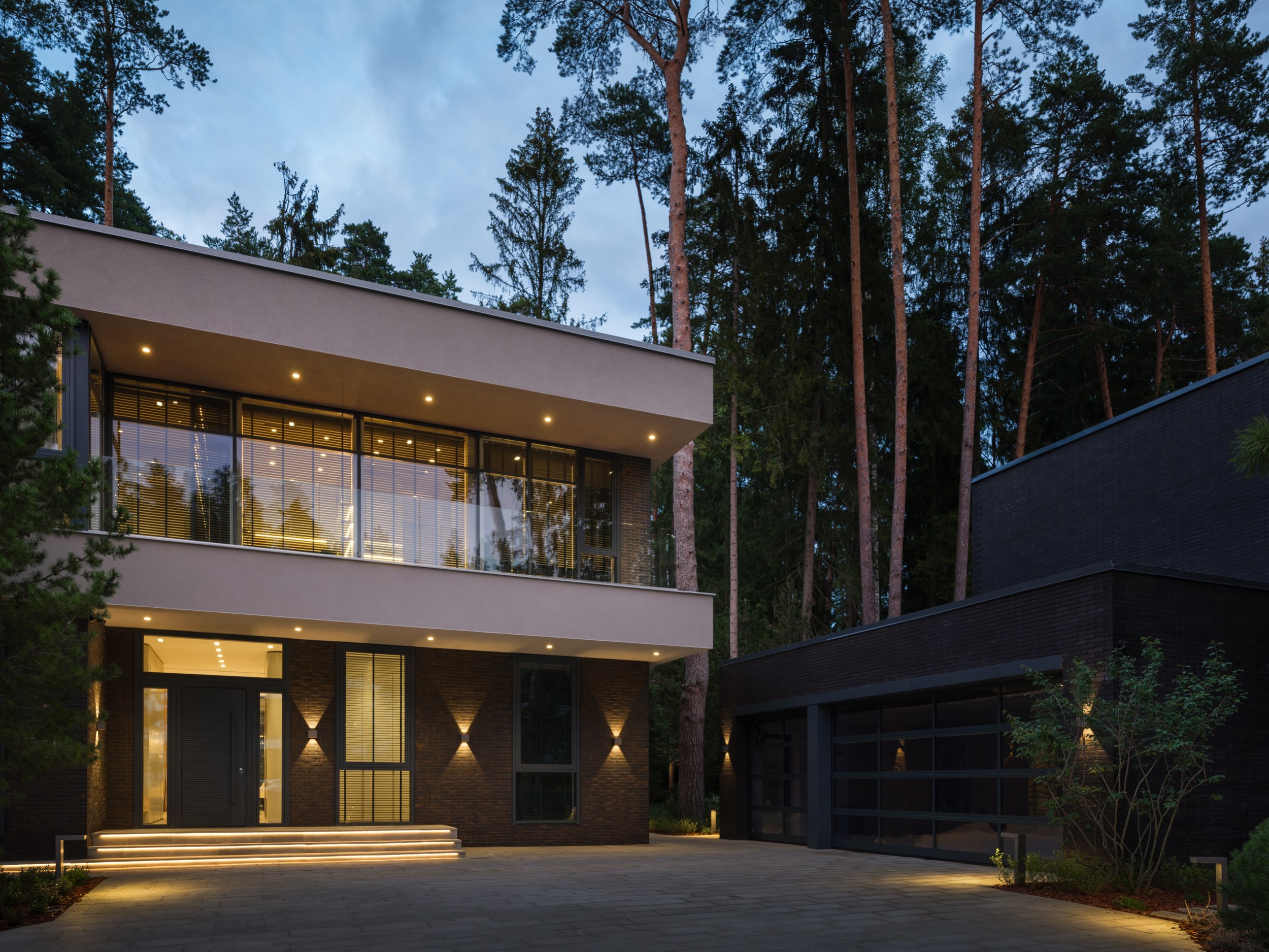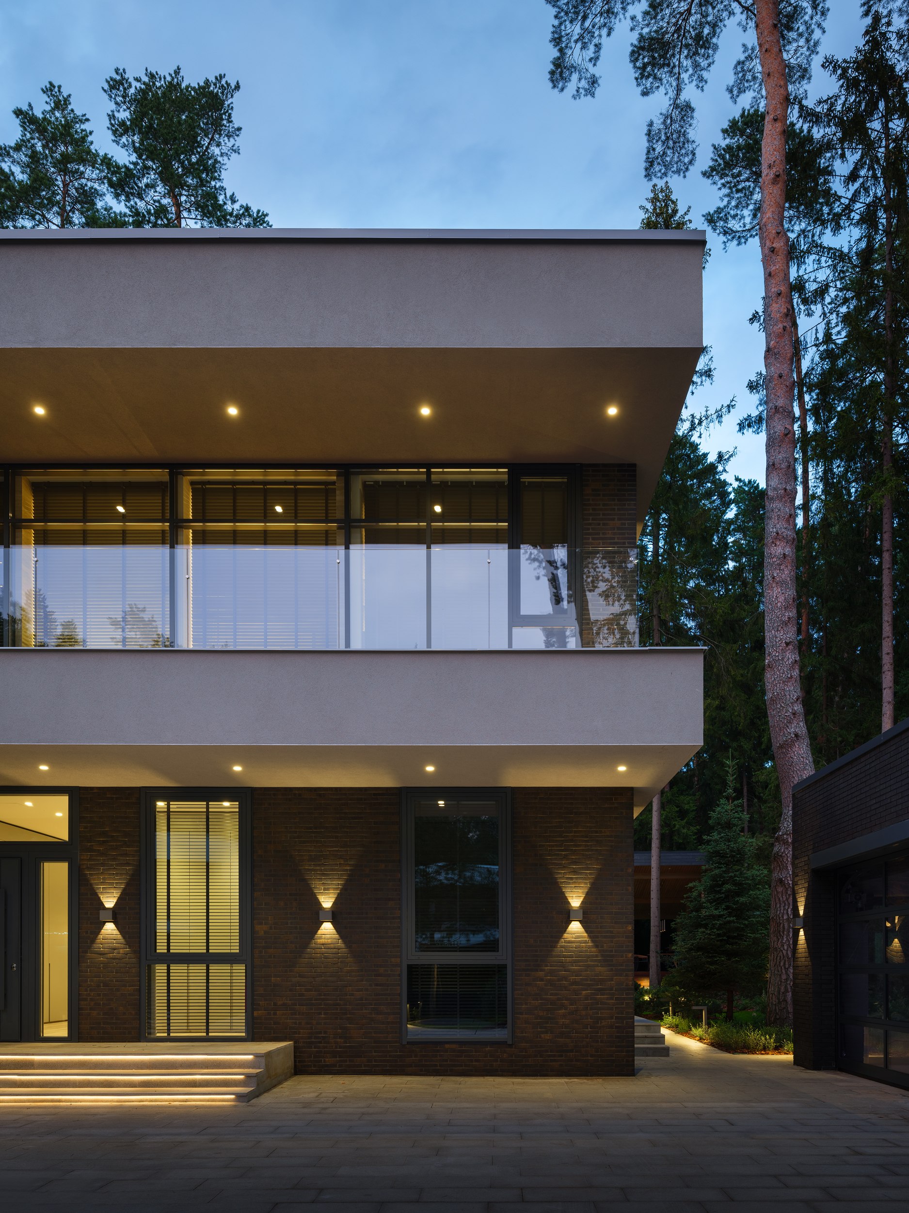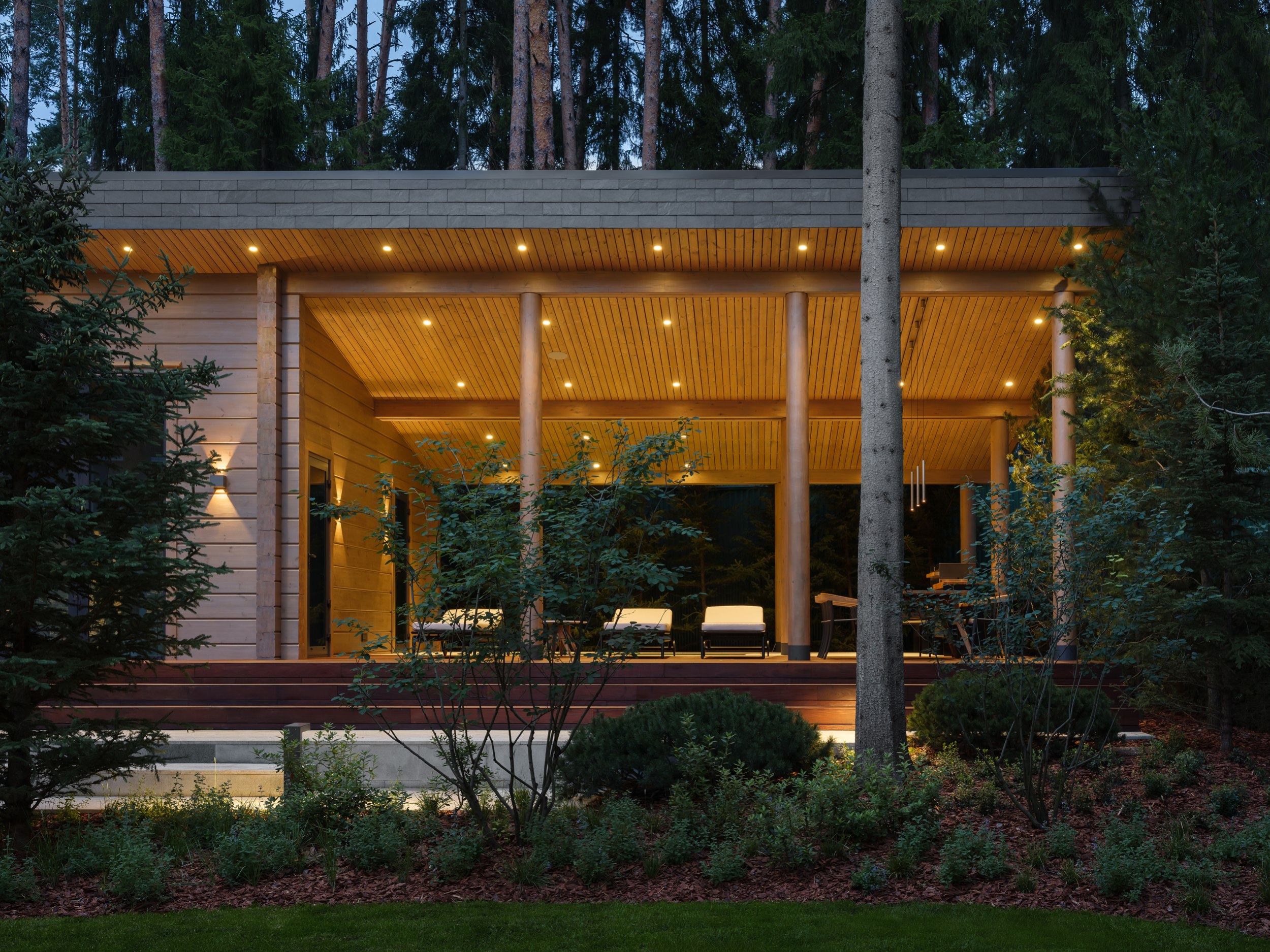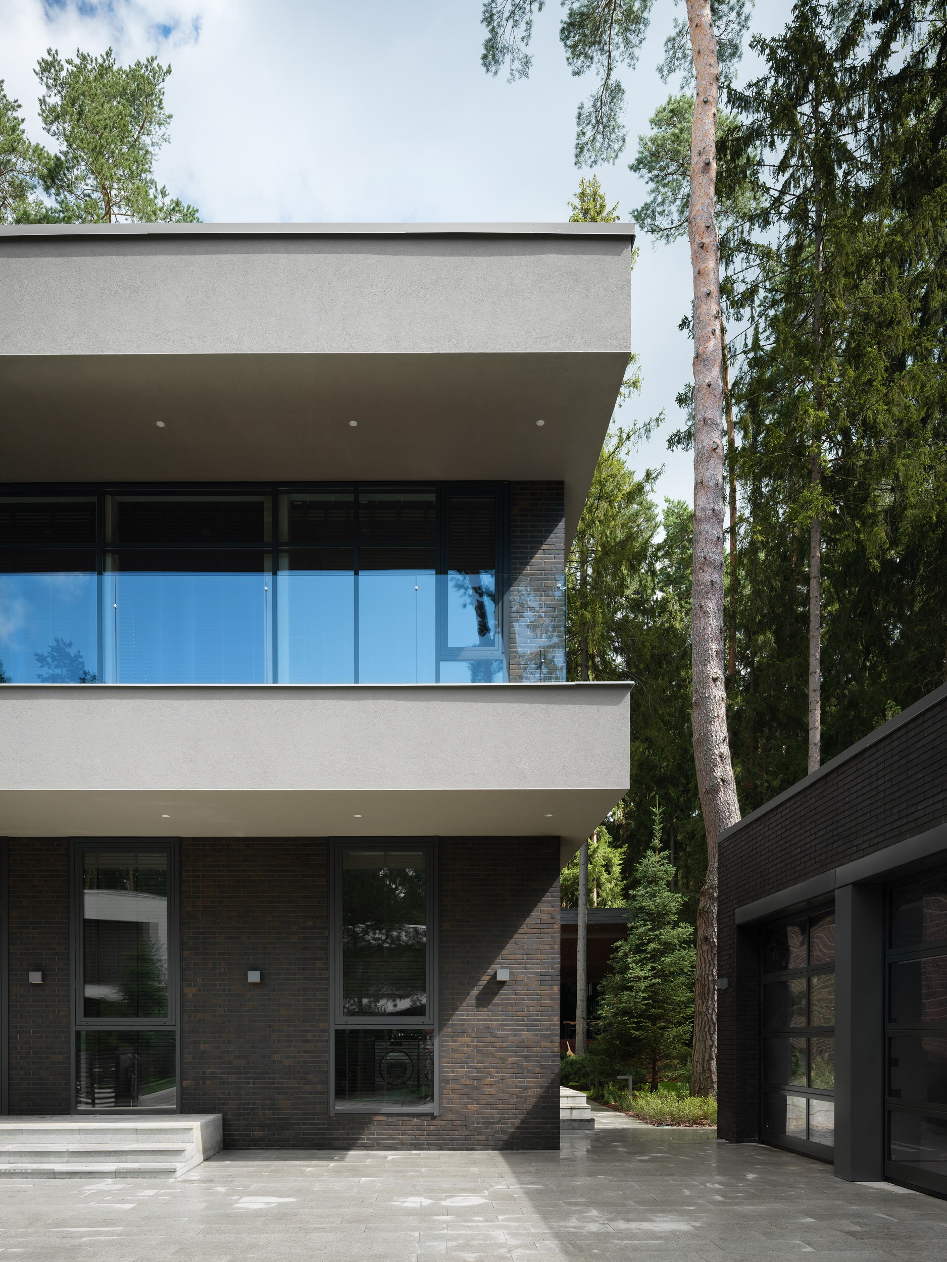 Фасады выполнены в минималистичном ключе с использованием натуральных материалов. Особое внимание уделено видовым характеристикам: через панорамные окна открываются перспективы на вековой лес, а комнаты ориентированы таким образом, чтобы природа становилась частью интерьера – его главным изобразительным акцентом. Каждый участок продуман как художественный холст: окно превращается в раму, внутри которой лес и смена сезонов создают живую картину.