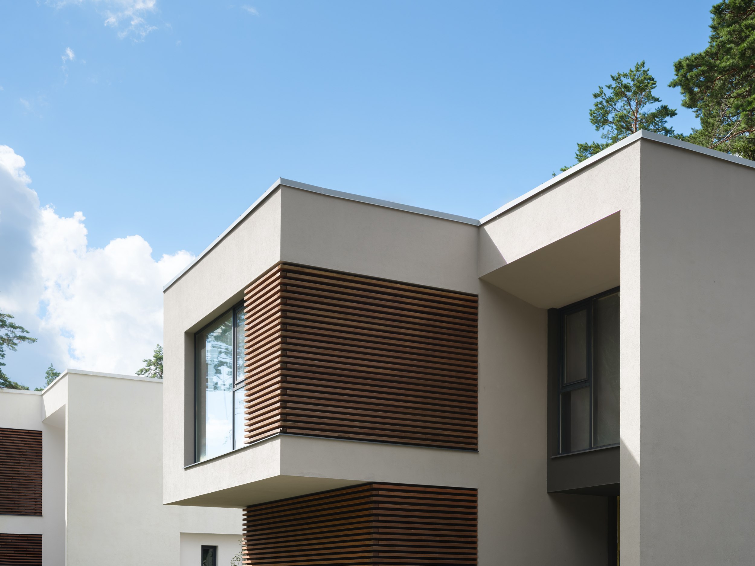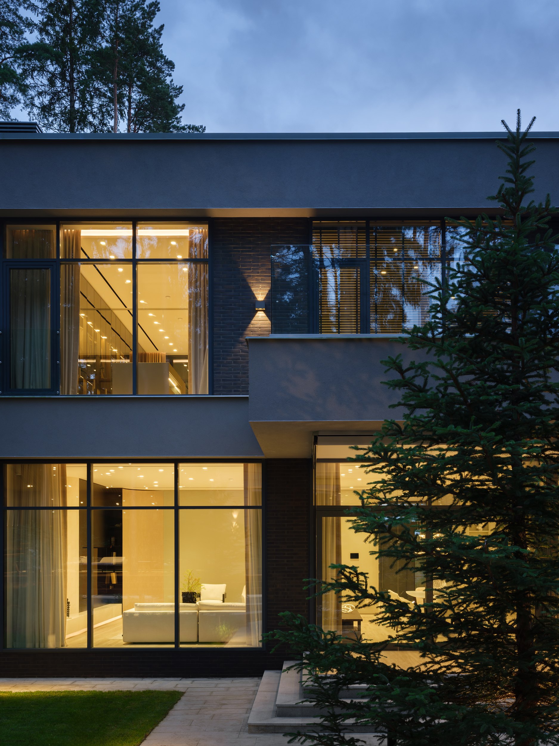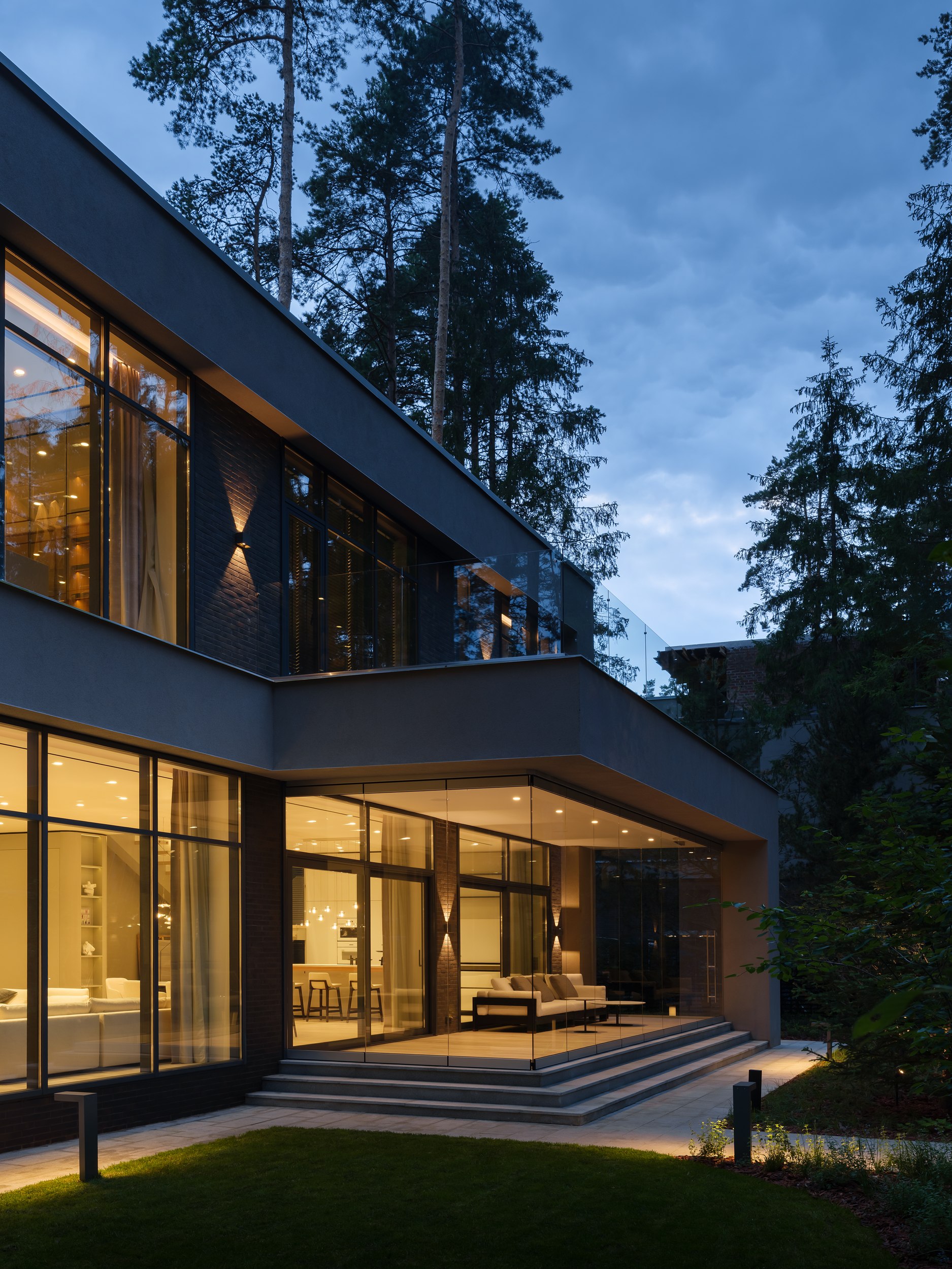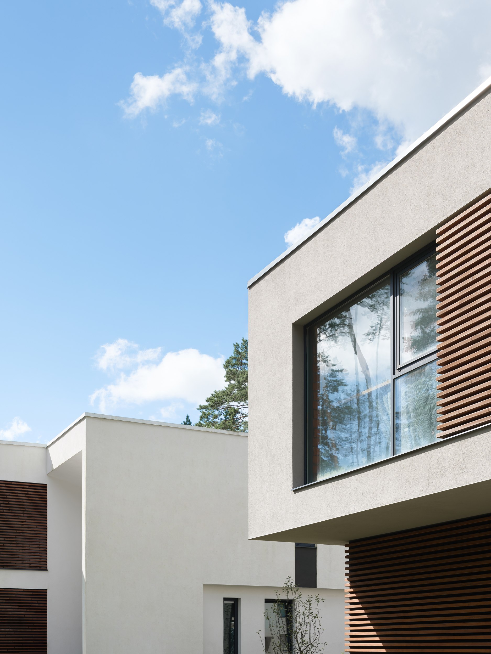 Фасады выполнены в минималистичном ключе с использованием натуральных материалов. Особое внимание уделено видовым характеристикам: через панорамные окна открываются перспективы на вековой лес, а комнаты ориентированы таким образом, чтобы природа становилась частью интерьера – его главным изобразительным акцентом. Каждый участок продуман как художественный холст: окно превращается в раму, внутри которой лес и смена сезонов создают живую картину.