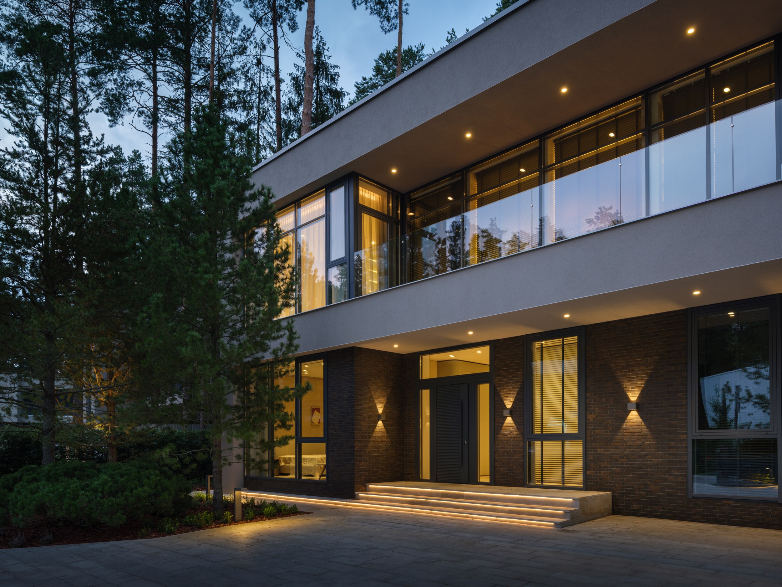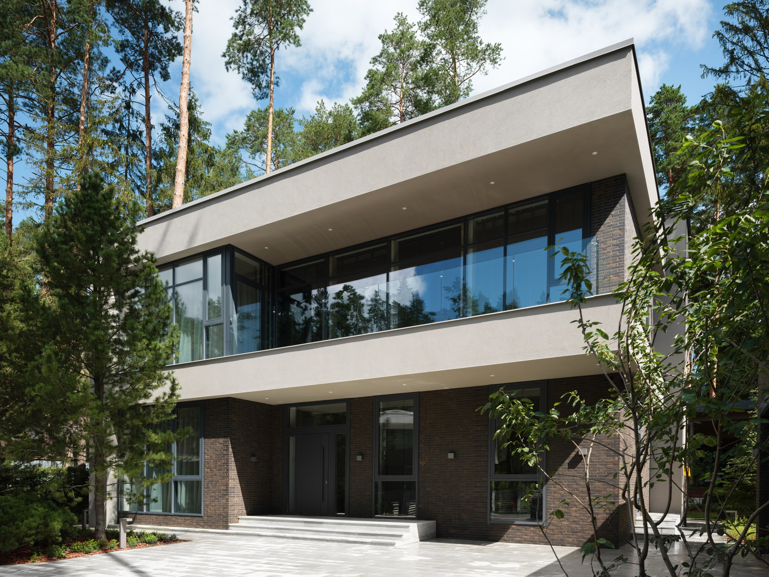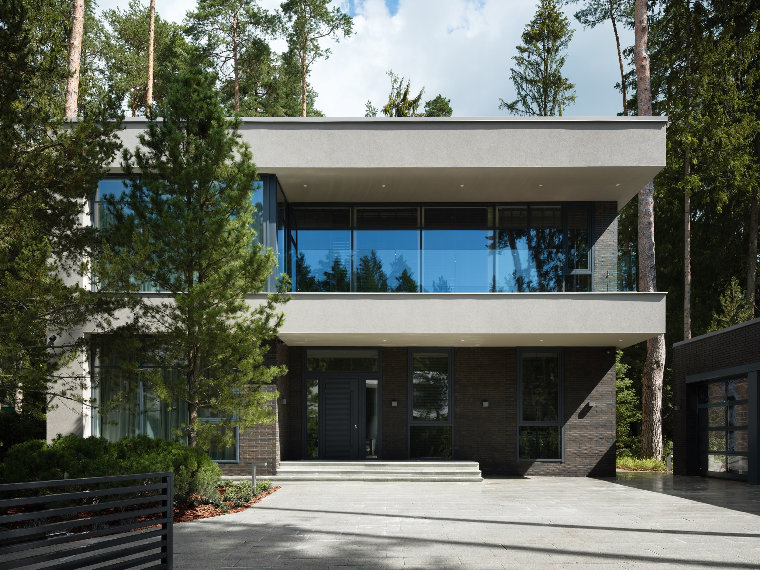 В отделке используются материалы, поддерживающие природную палитру леса и подчёркивающие статус и долговечность домов: тёплый кирпич, благородные породы дерева и натуральный камень.