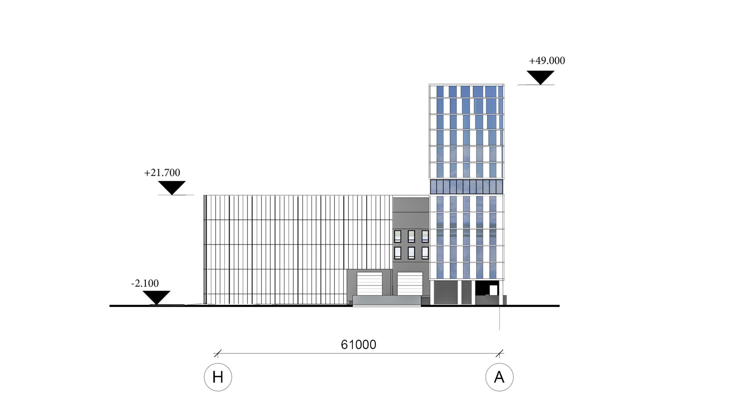 Кинопроизводственный комплекс состоит из двух основных блоков. Первый – павильонный, высотой 21,7 метра, включает три больших павильона, склад оборудования и цех киносъёмочной техники. Второй – основной блок высотой 6 и 12 этажей. В его состав входят актёрский комплекс, цех декоративно-технических сооружений, малый павильон, столовая-ресторан, выставка и склад реквизита и костюмов, офисно-студийный комплекс и инженерно-хозяйственный блок.