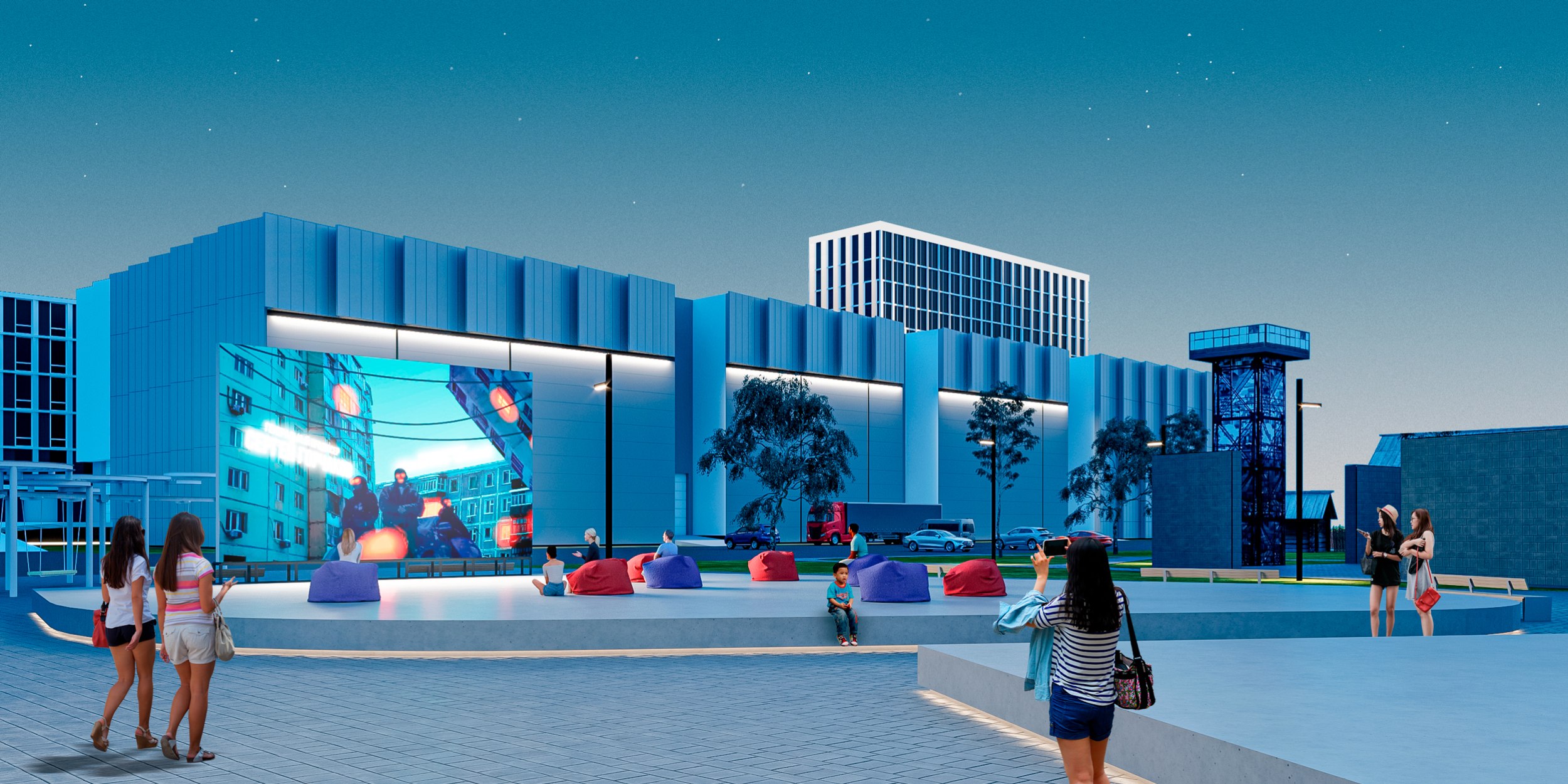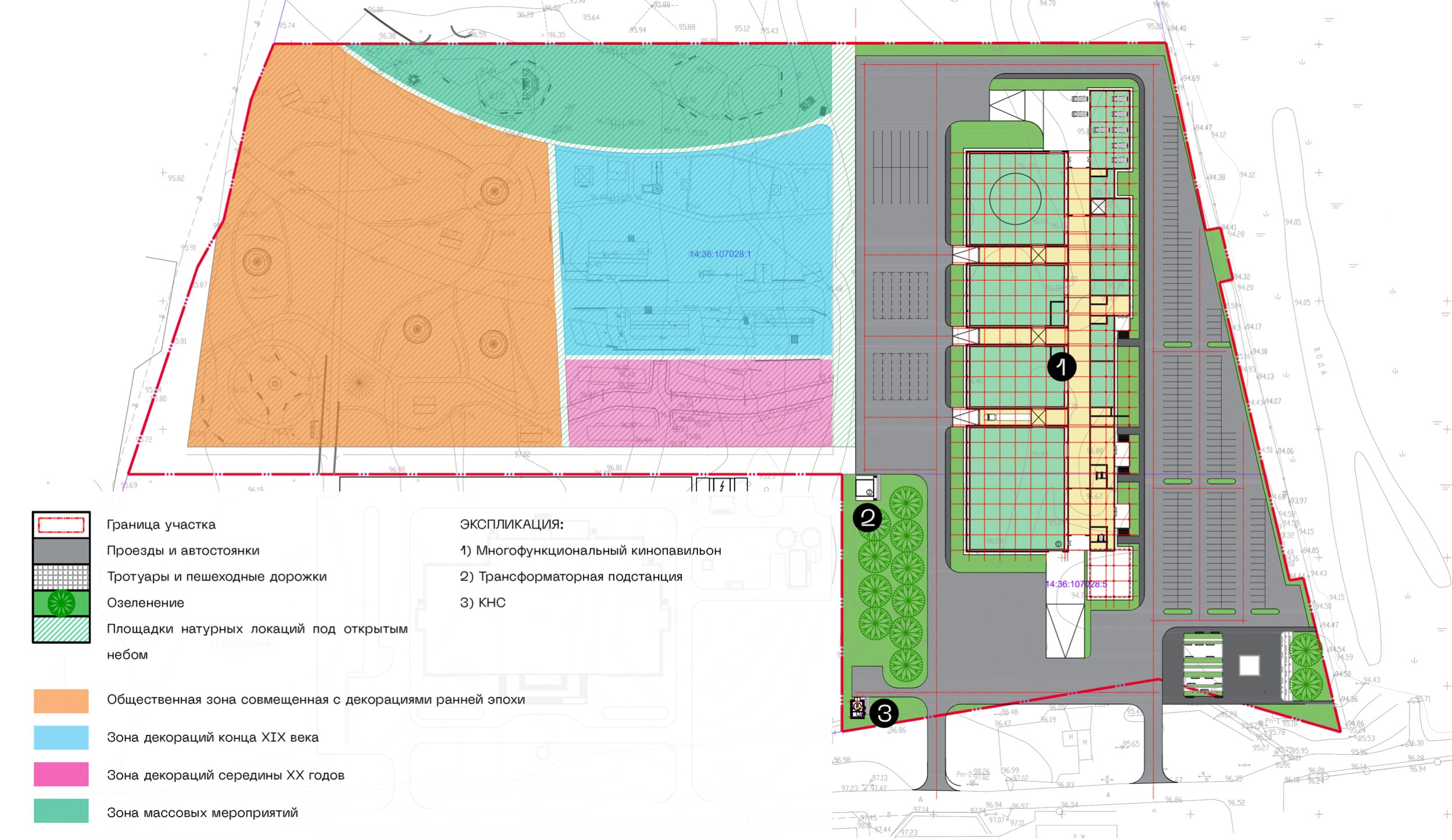 Культурный / Культурный центрМногофункциональный кинопавильон: актерский комплекс, большой павильон для съемок, цех декоративно-технических сооружений, малый павильон, столовая-ресторан, выставка и склад съемочного реквизита, офисно-студийный комплекс, склад оборудования и аппаратуры, цех киносъемочной техники