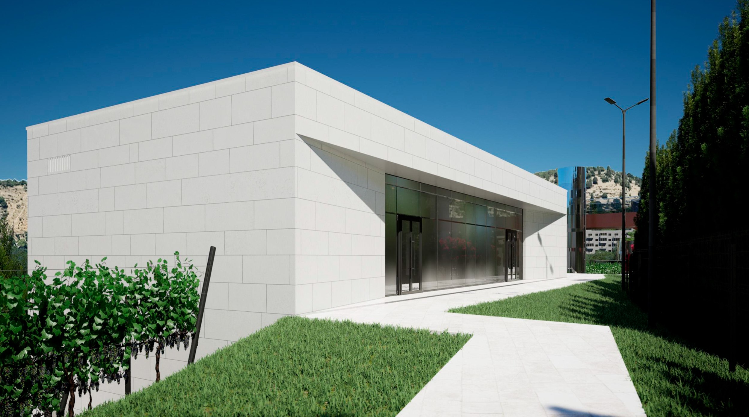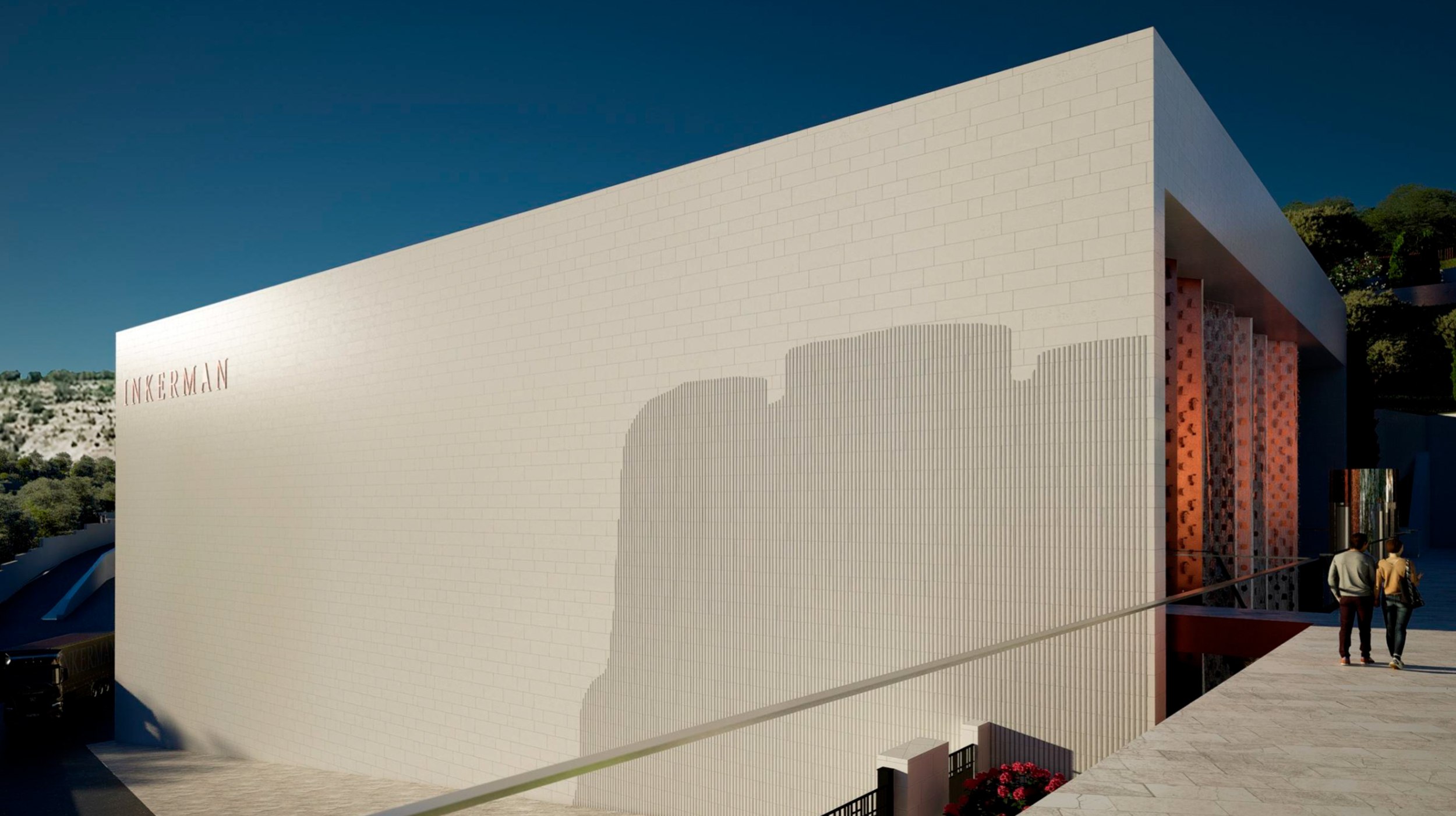 Проект реконструкции Инкерманского завода марочных вин. Вид на VIP дегустационный зал от экскурсионного входа в здание ПСК