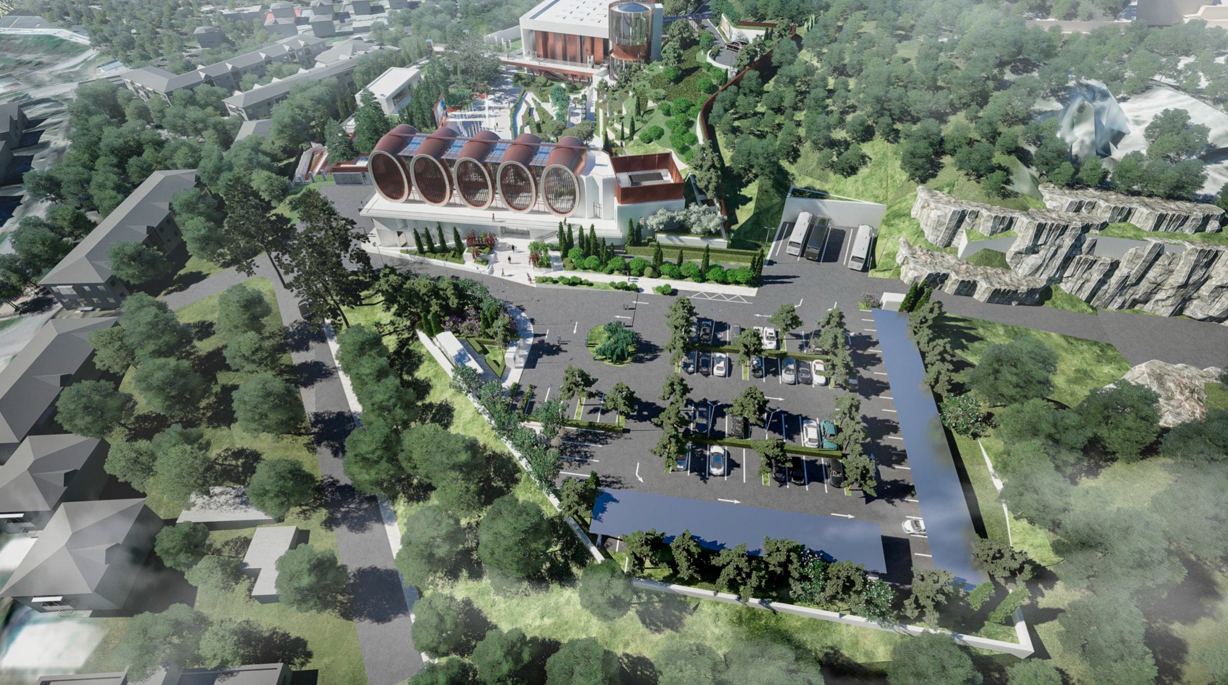 Проект реконструкции Инкерманского завода марочных вин. Вид на парковку с террасы со стороны ресторана