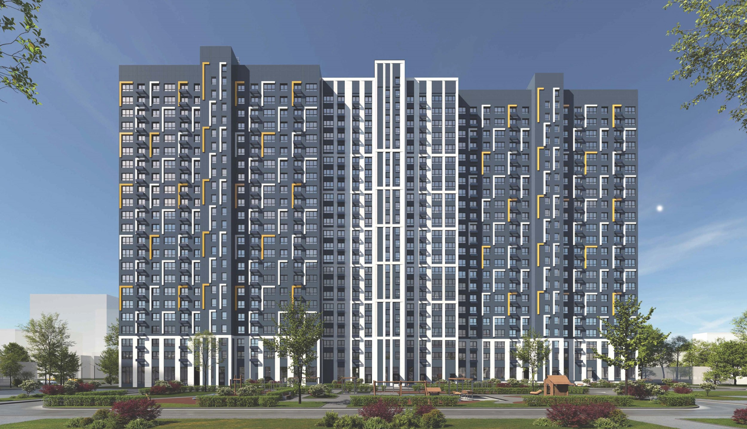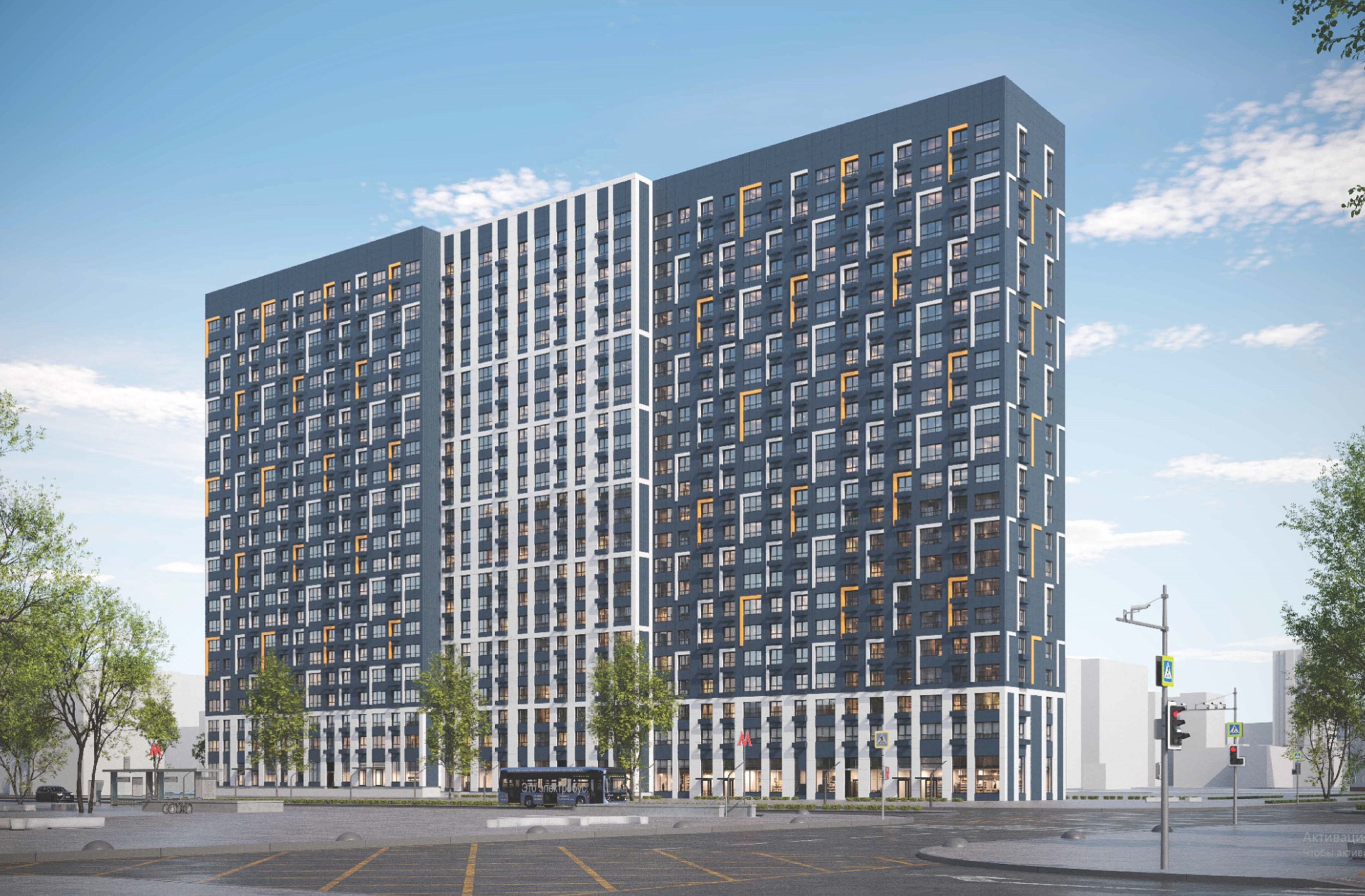 «Архитектурный облик дома строится на чередовании глухих участков стен и элементов остекления. Для отделки используют керамогранитные плиты и металлические кассеты монохромной гаммы. Фасад будет разделен на три части, где центральная секция выделена более светлым, контрастным оттенком. Этот же прием повторяется в оформлении первого этажа. Г-образные декоративные элементы белого и желтого цветов создают уникальный паттерн, придающий дому индивидуальность», – отметил Сергей Кузнецов.