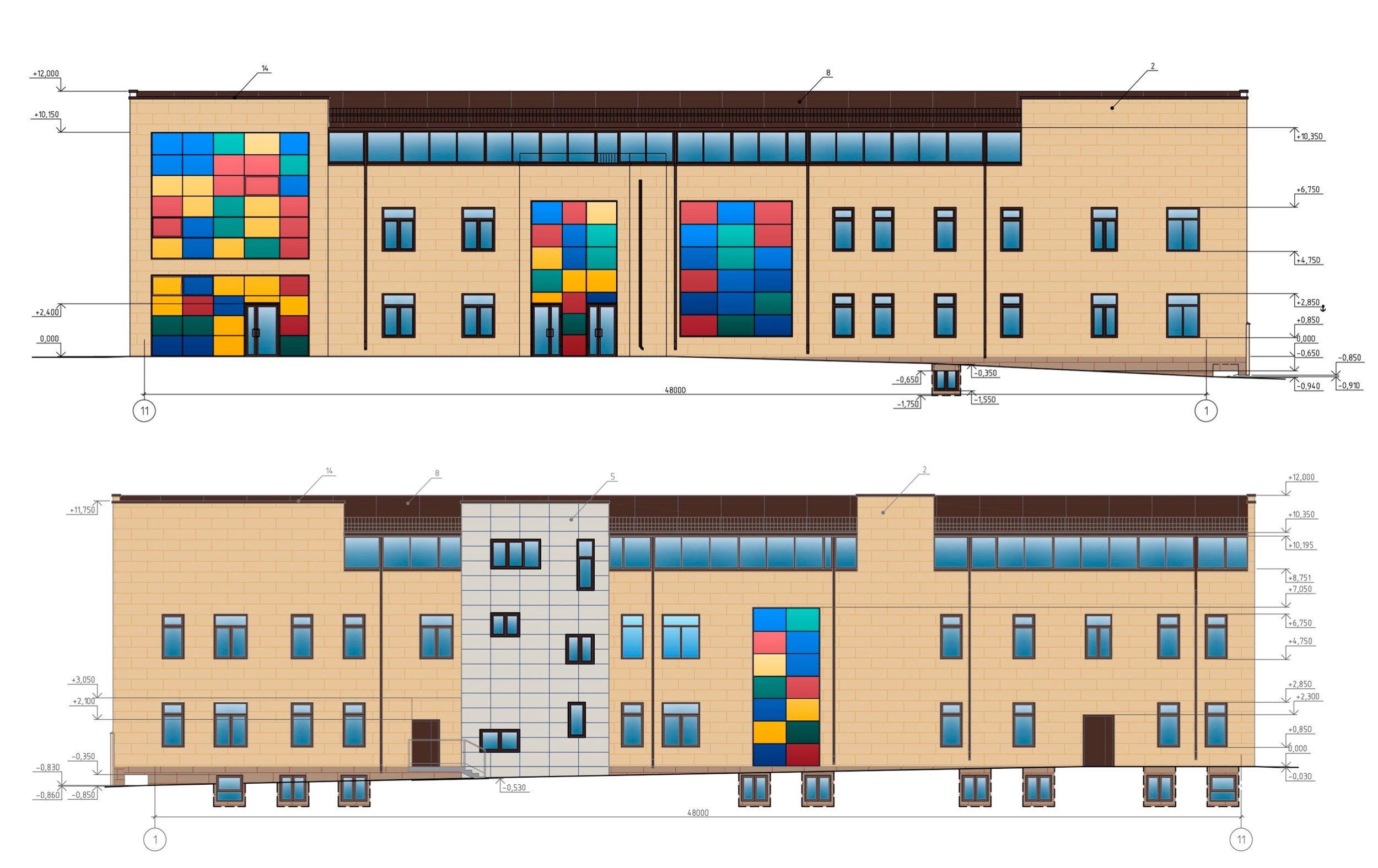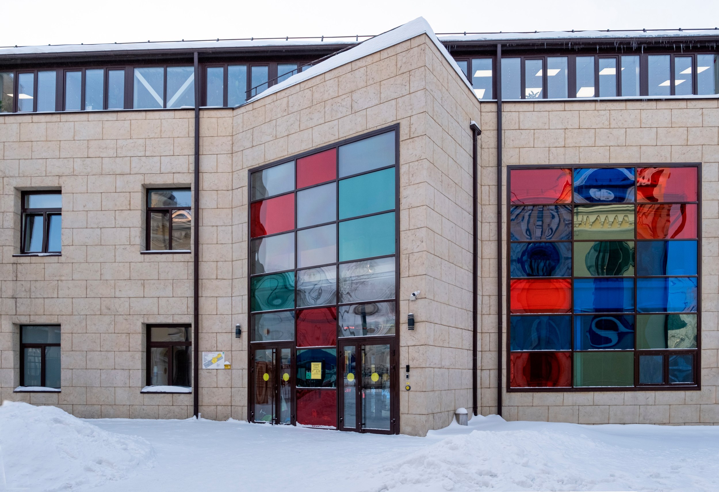 Фасады выполнены на контрасте цвета отделки и фактуры облицовочных материалов: камень, металл, стекло. Палитра спокойная – природные тона с бежевыми и коричневыми оттенками. Витражи покрыты яркой разноцветной пленкой – так создаются акценты на всех фасадах здания.