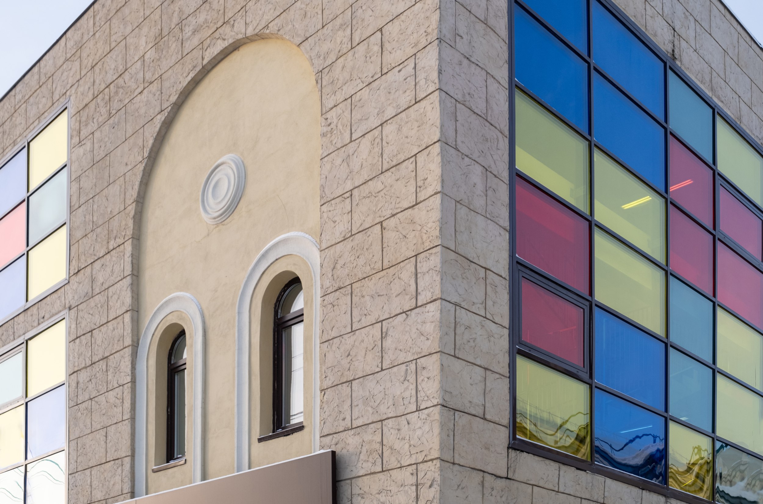 Фасады в основном покрыты тонкослойной декоративной штукатуркой с оттиском под натуральный камень. Их часть, а также заполнения проемов в наружных стенах, представляют собой витражные конструкции из алюминиевых профилей. Однокамерные стеклопакеты в хаотичном порядке тонируются цветными пленками синего, красного, желтого и зеленого цветов.
