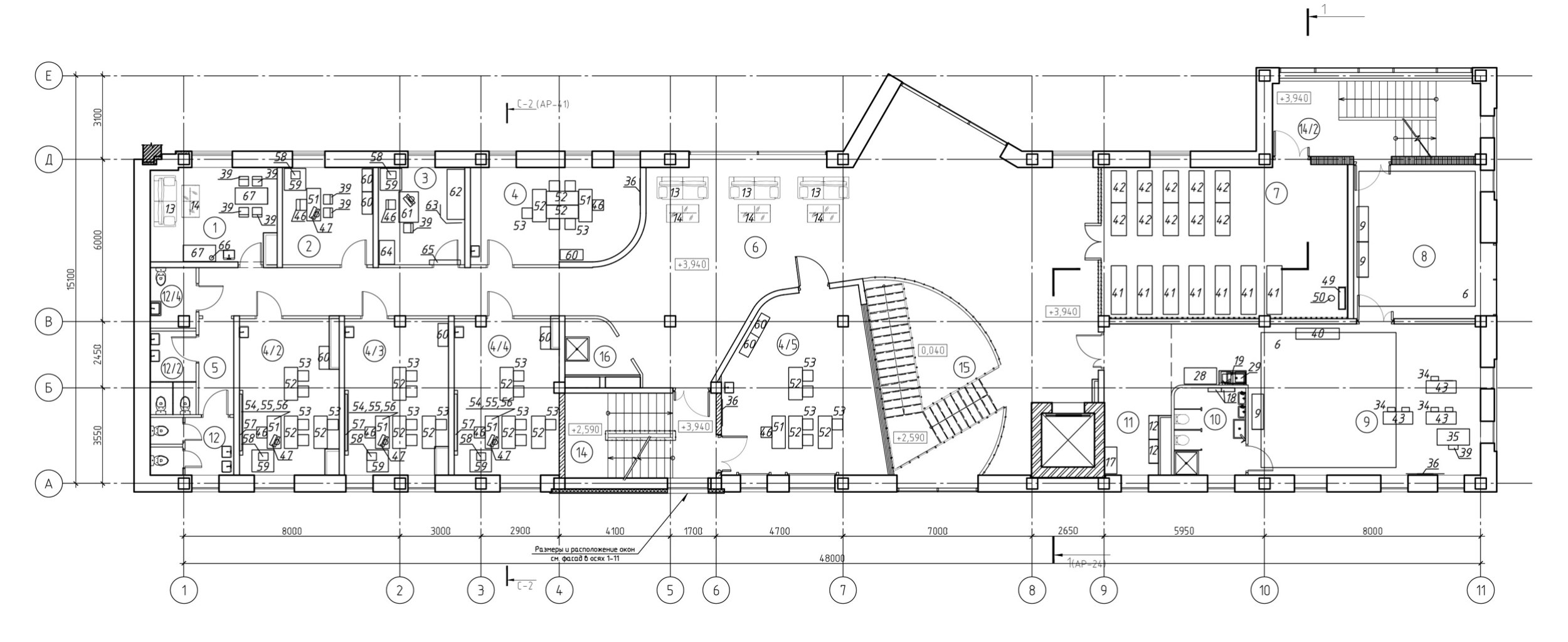 Витражи выделяют входные группы и лестничные клетки. Окна одинаковых размеров создают ритмичные ряды. Горизонтальные декоративные балки уравновешивают вертикальные элементы, ту же функцию выполняет ленточное остекление чердака.