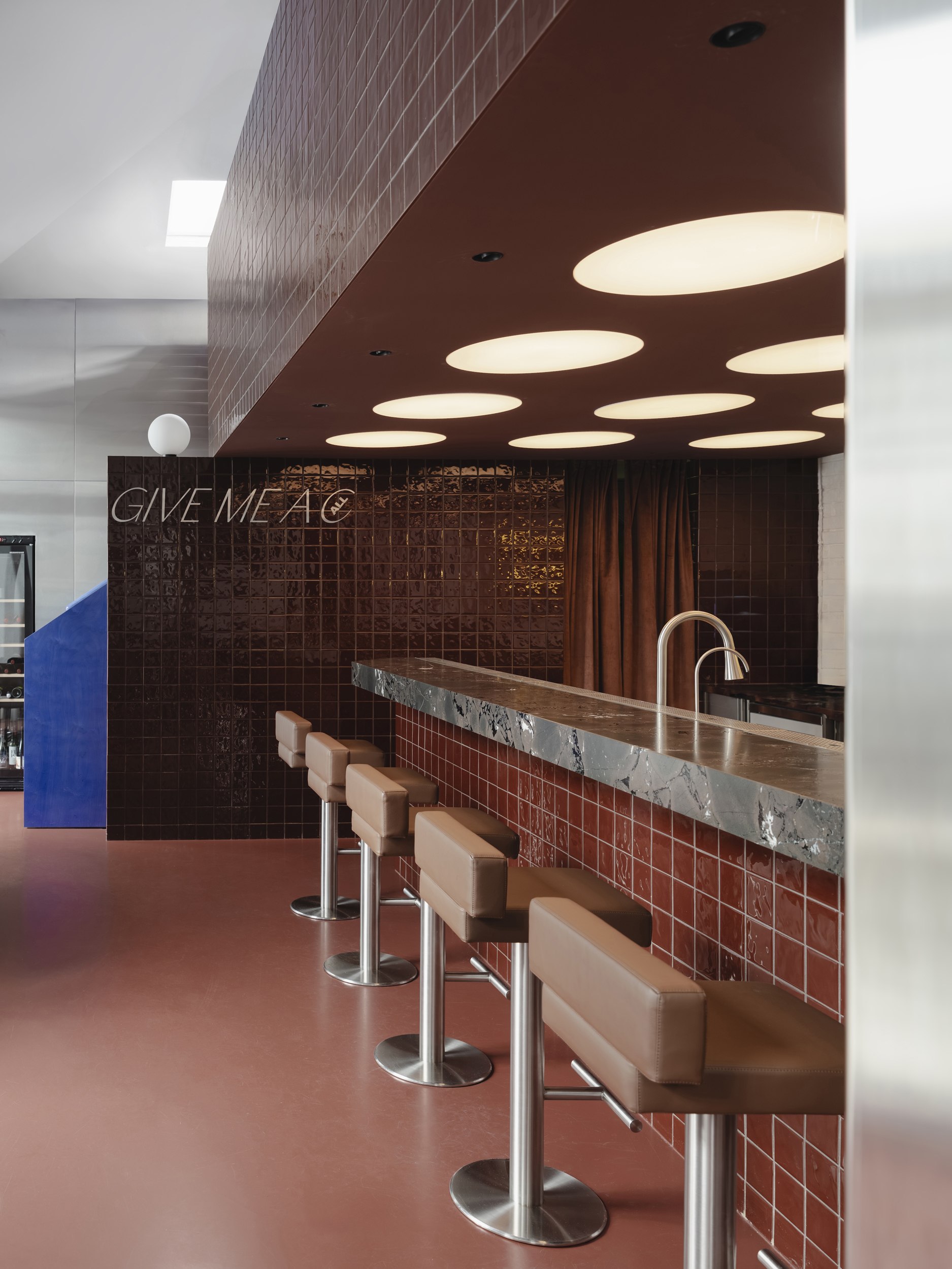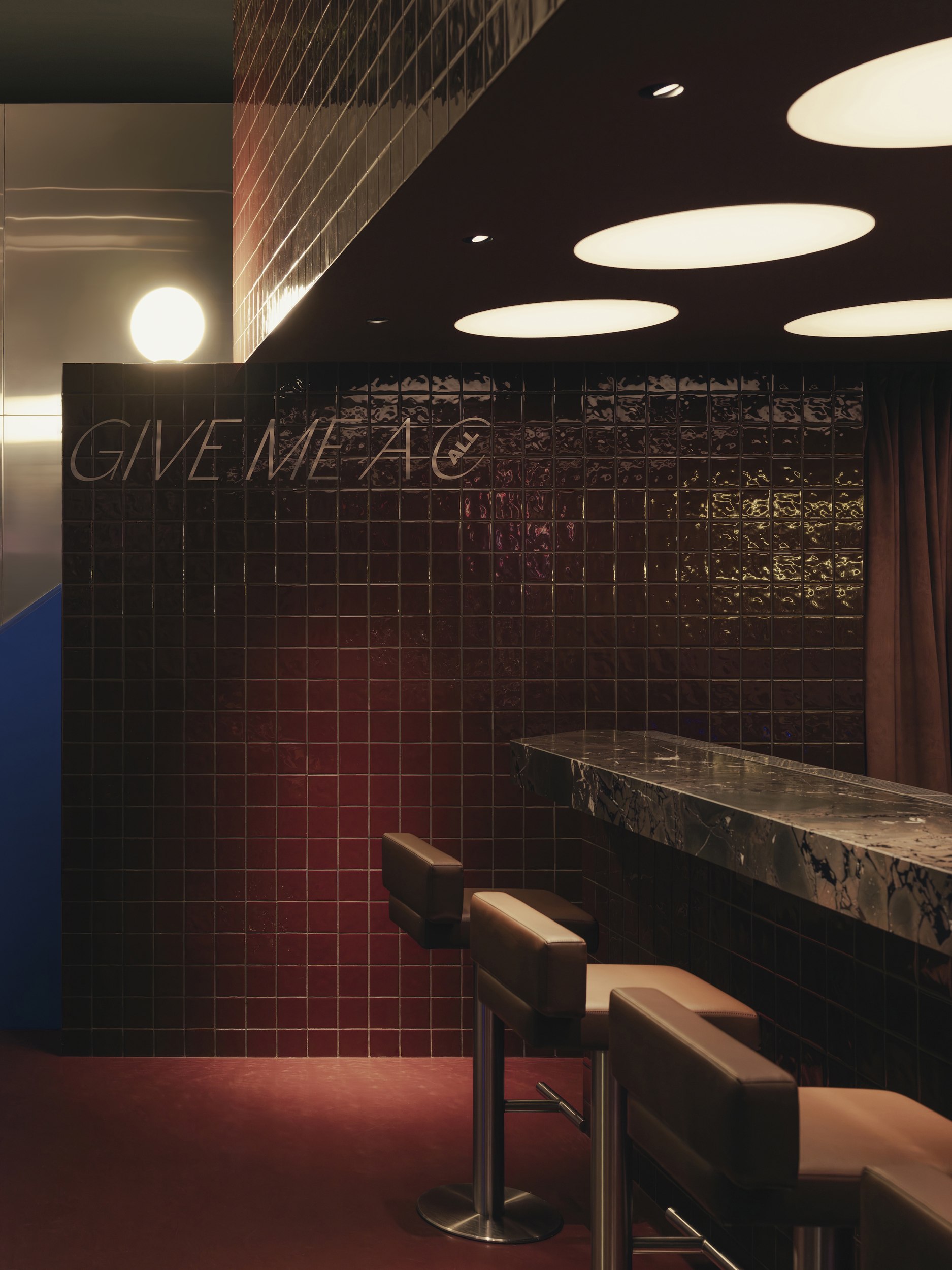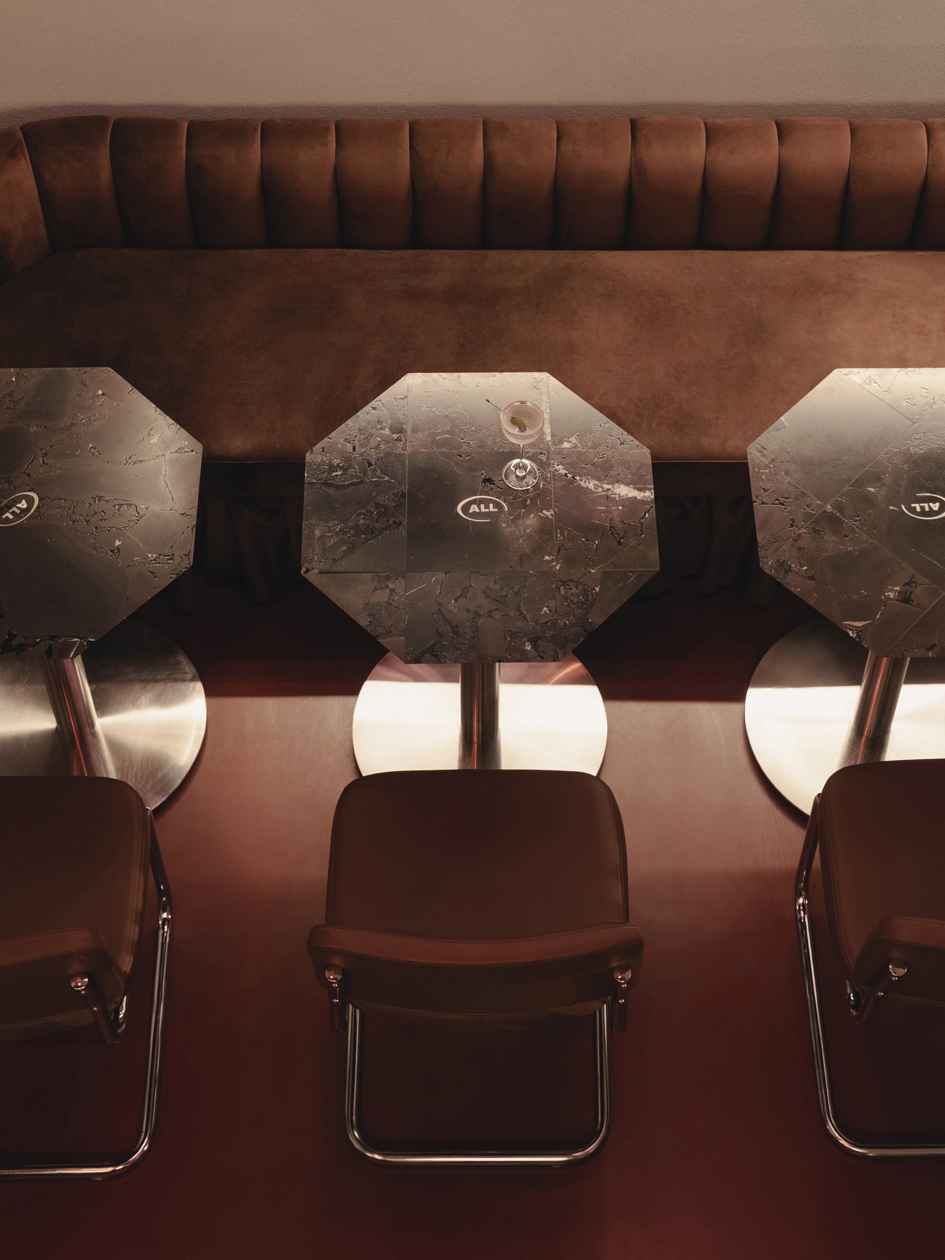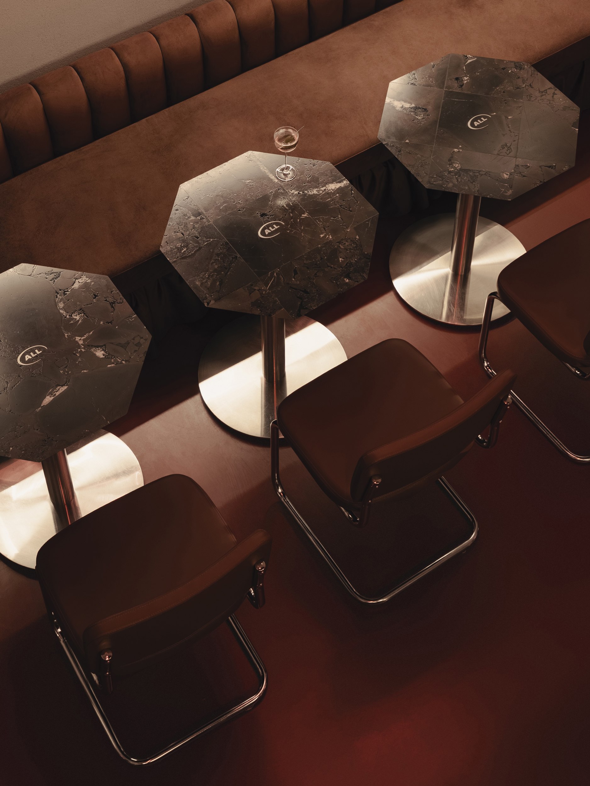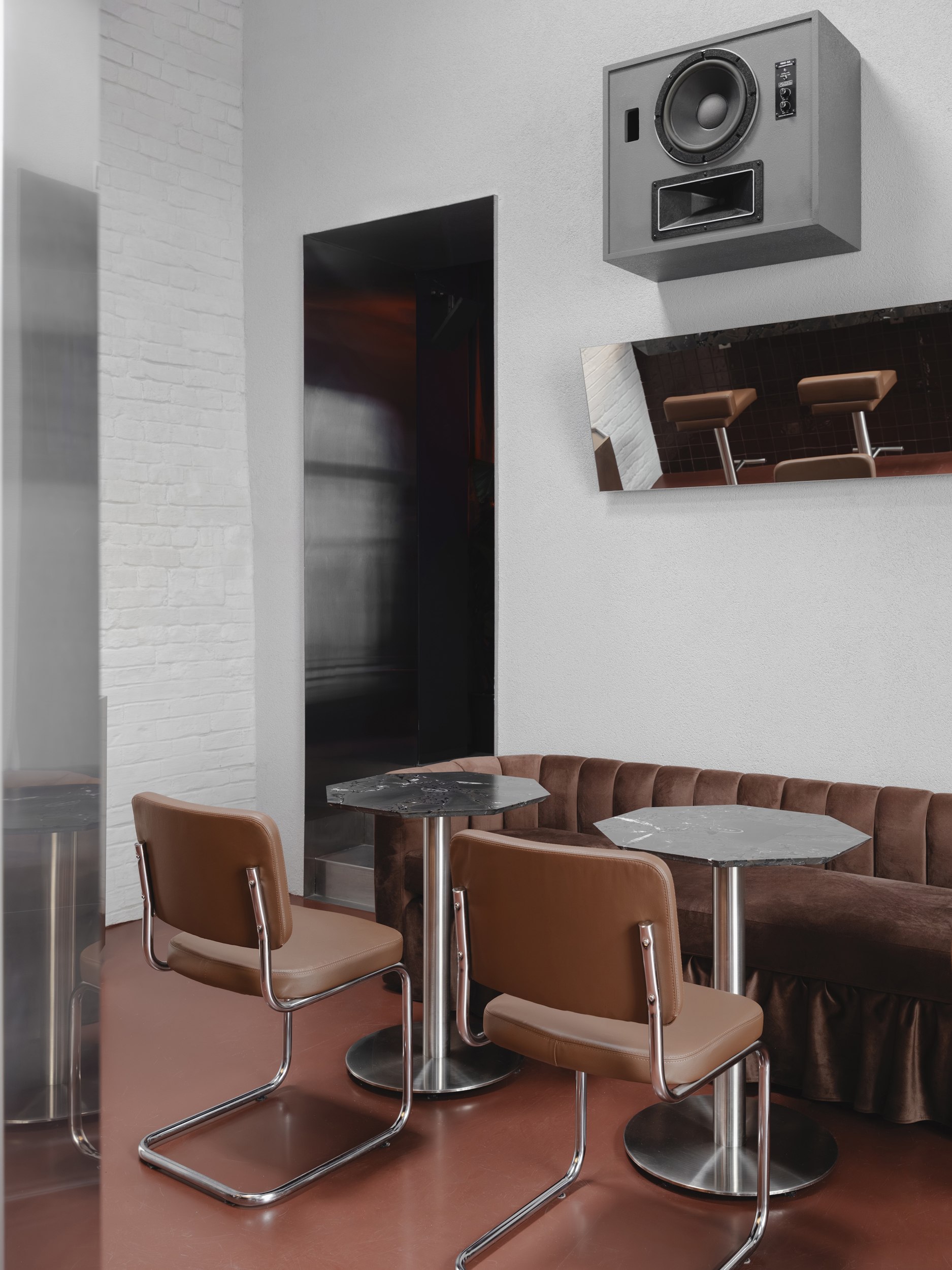 Интерьер дополняют элементы, специально разработанные бюро. Столы брендированы логотипом Nightcall: на первом этаже столешницы выполнены из коричневого мрамора, на втором – из ярко-синего акрилового камня. В сочетании с инкрустированным логотипом и точечным освещением это создает акцент на напитках гостей. Также бюро спроектировало стальную мультифункциональную стойку, где во время мероприятий размещается DJ пульт, и люстру, сценарии света которой программируются под музыку.