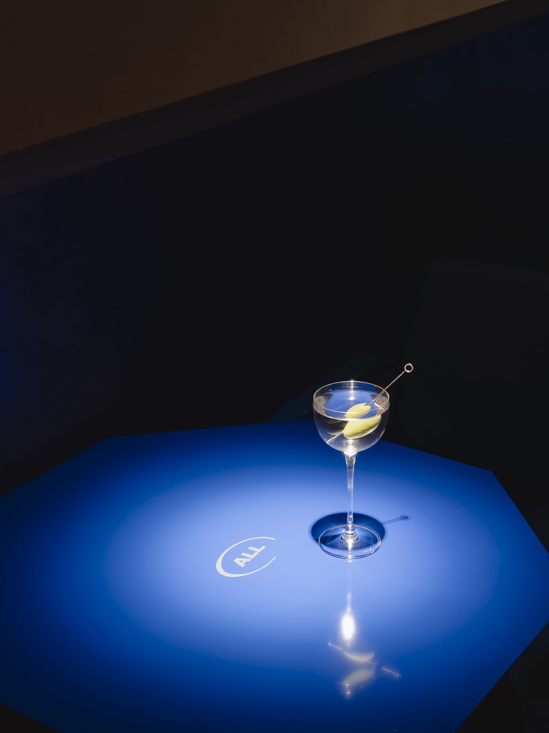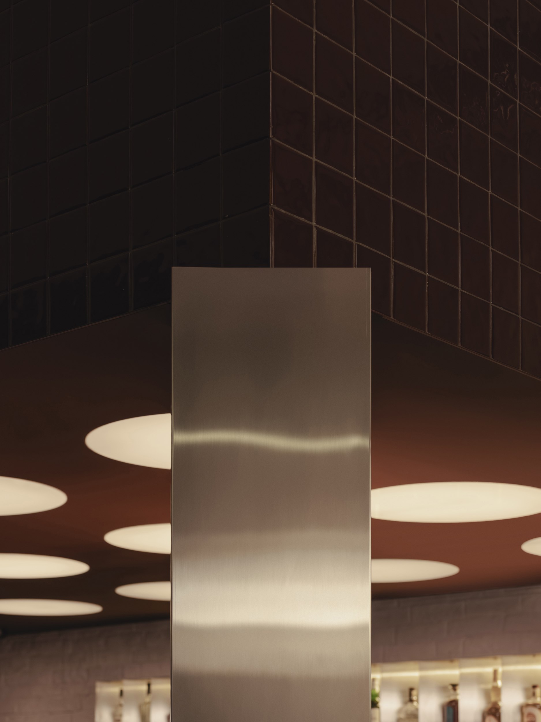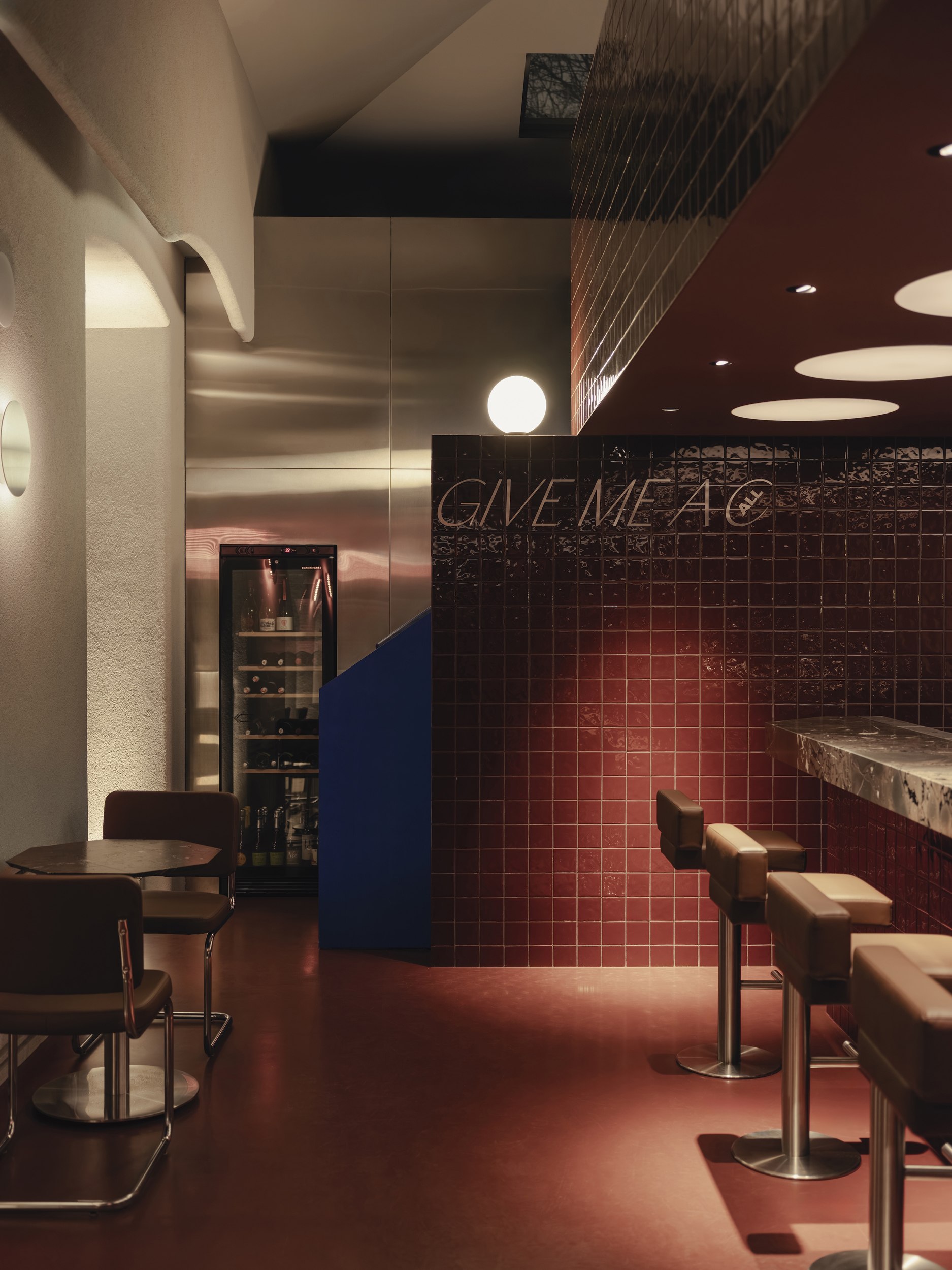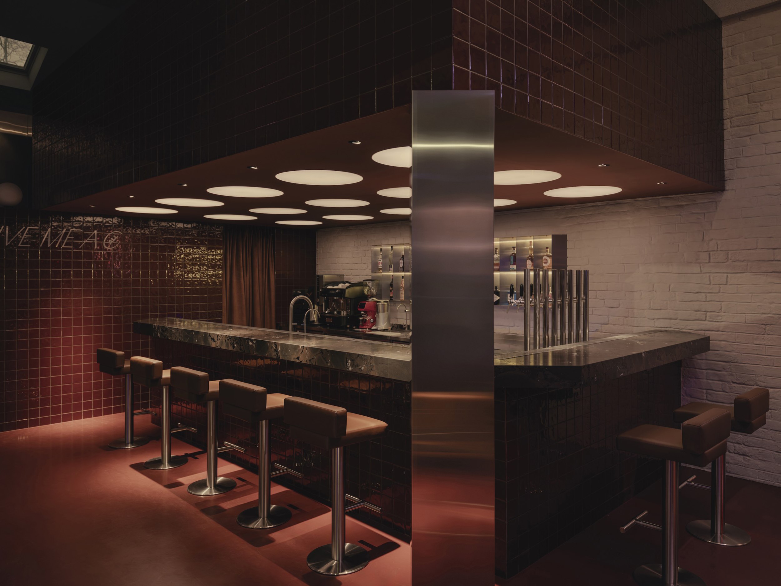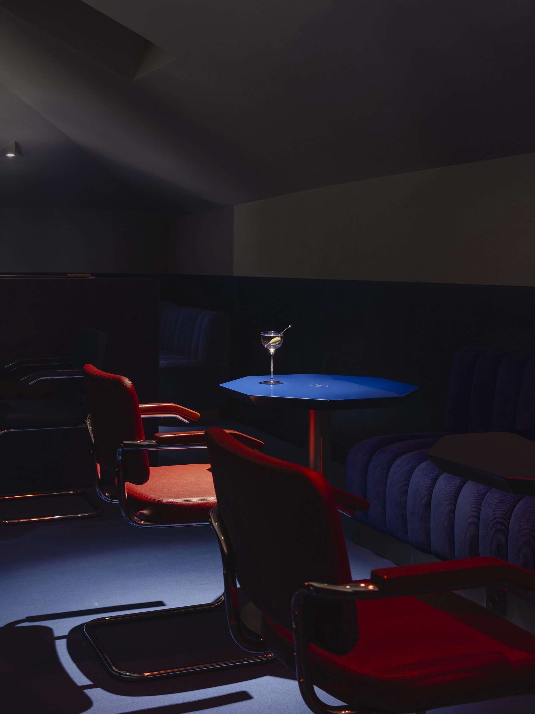 Интерьер дополняют элементы, специально разработанные бюро. Столы брендированы логотипом Nightcall: на первом этаже столешницы выполнены из коричневого мрамора, на втором – из ярко-синего акрилового камня. В сочетании с инкрустированным логотипом и точечным освещением это создает акцент на напитках гостей. Также бюро спроектировало стальную мультифункциональную стойку, где во время мероприятий размещается DJ пульт, и люстру, сценарии света которой программируются под музыку.