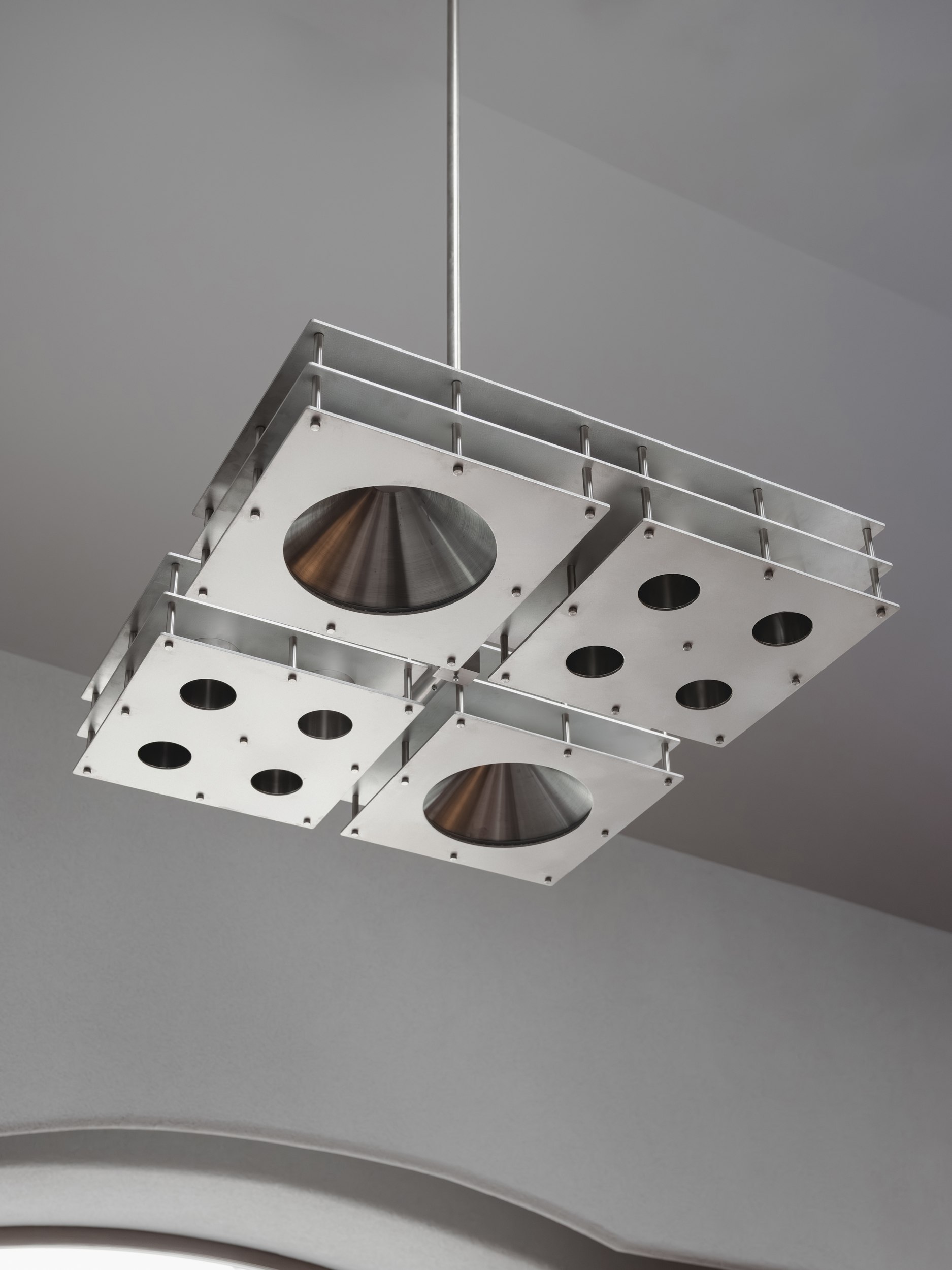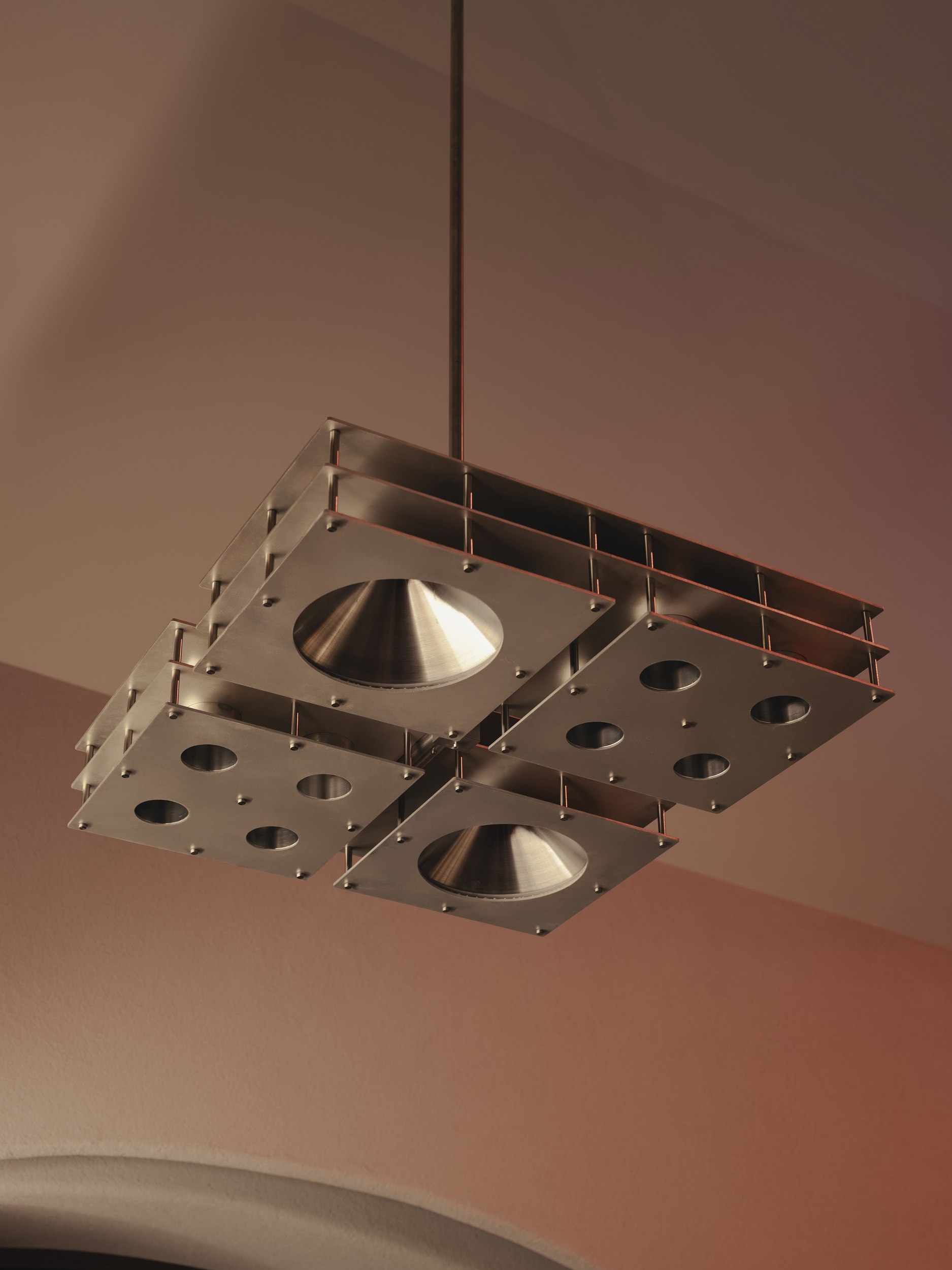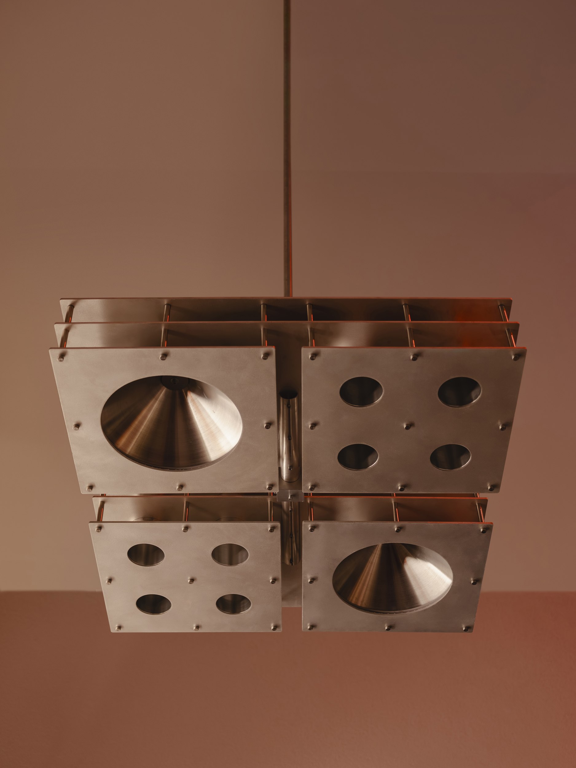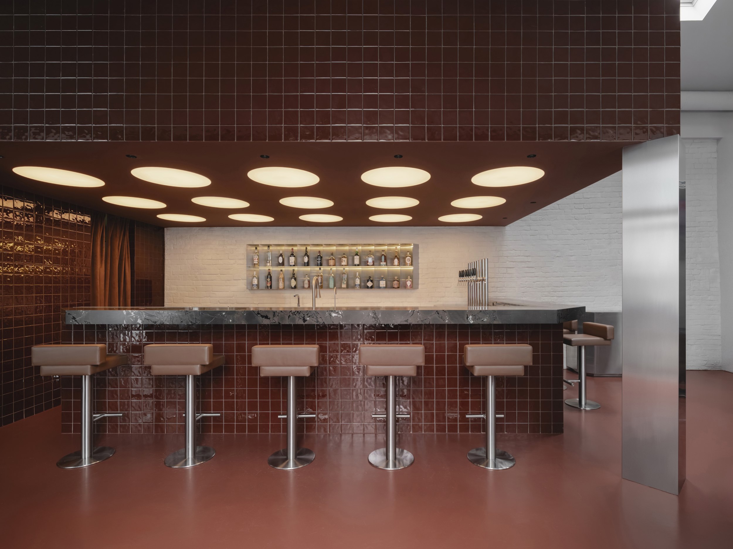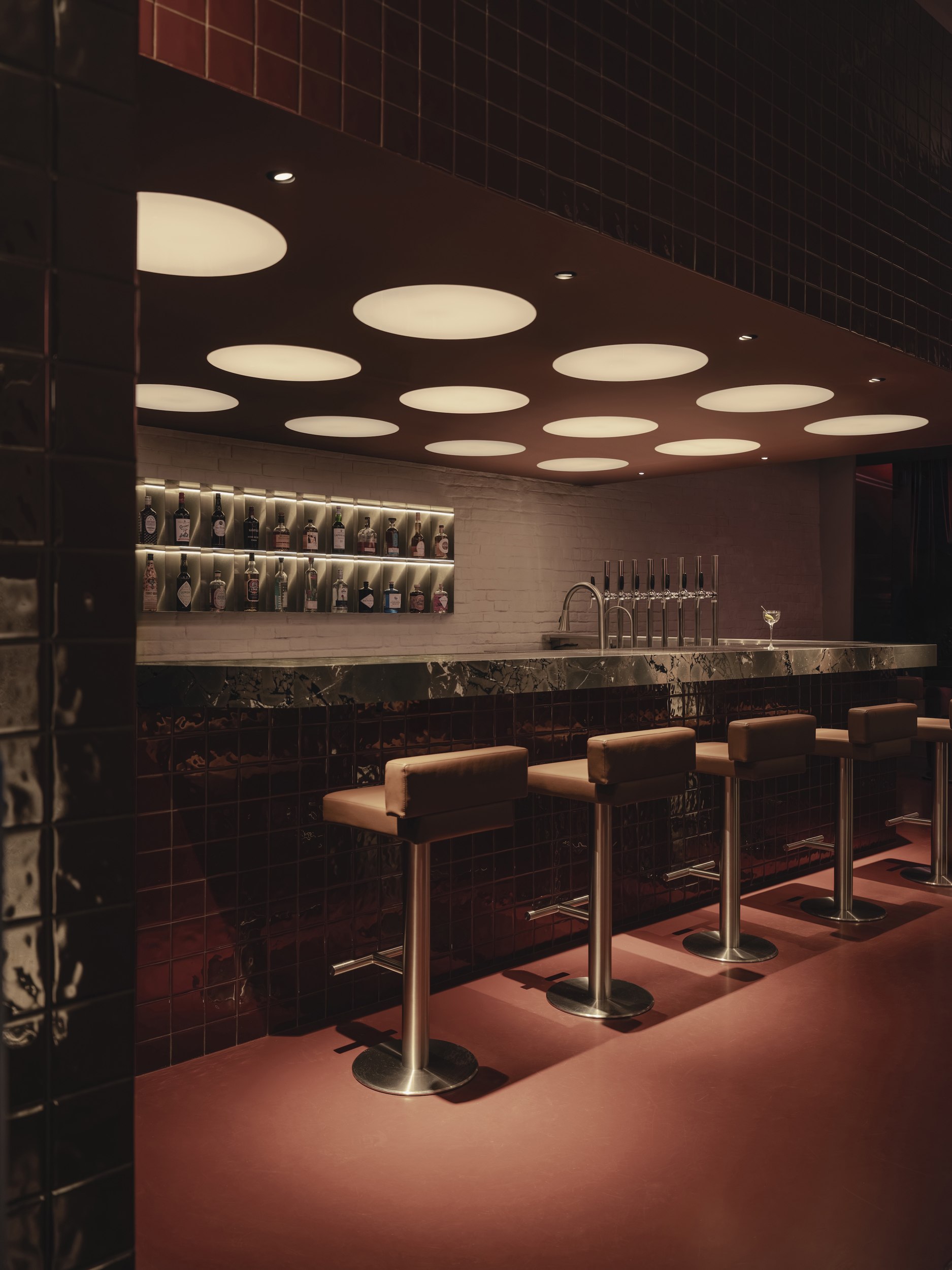 Интерьер дополняют элементы, специально разработанные бюро. Столы брендированы логотипом Nightcall: на первом этаже столешницы выполнены из коричневого мрамора, на втором – из ярко-синего акрилового камня. В сочетании с инкрустированным логотипом и точечным освещением это создает акцент на напитках гостей. Также бюро спроектировало стальную мультифункциональную стойку, где во время мероприятий размещается DJ пульт, и люстру, сценарии света которой программируются под музыку.