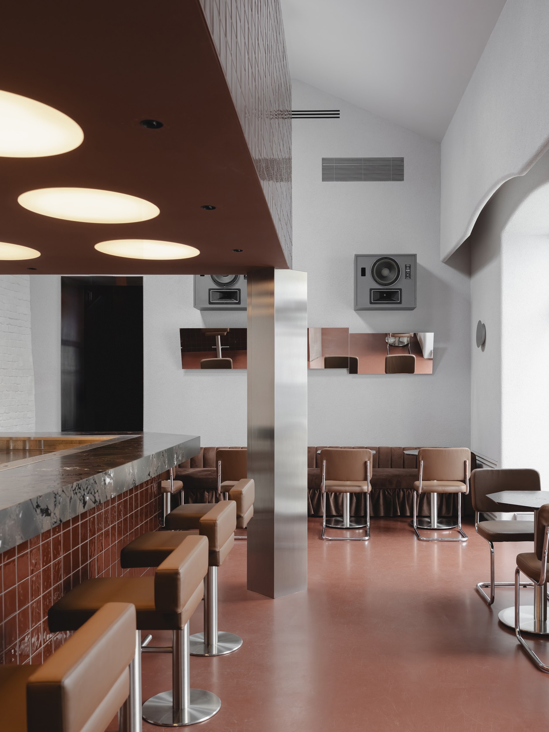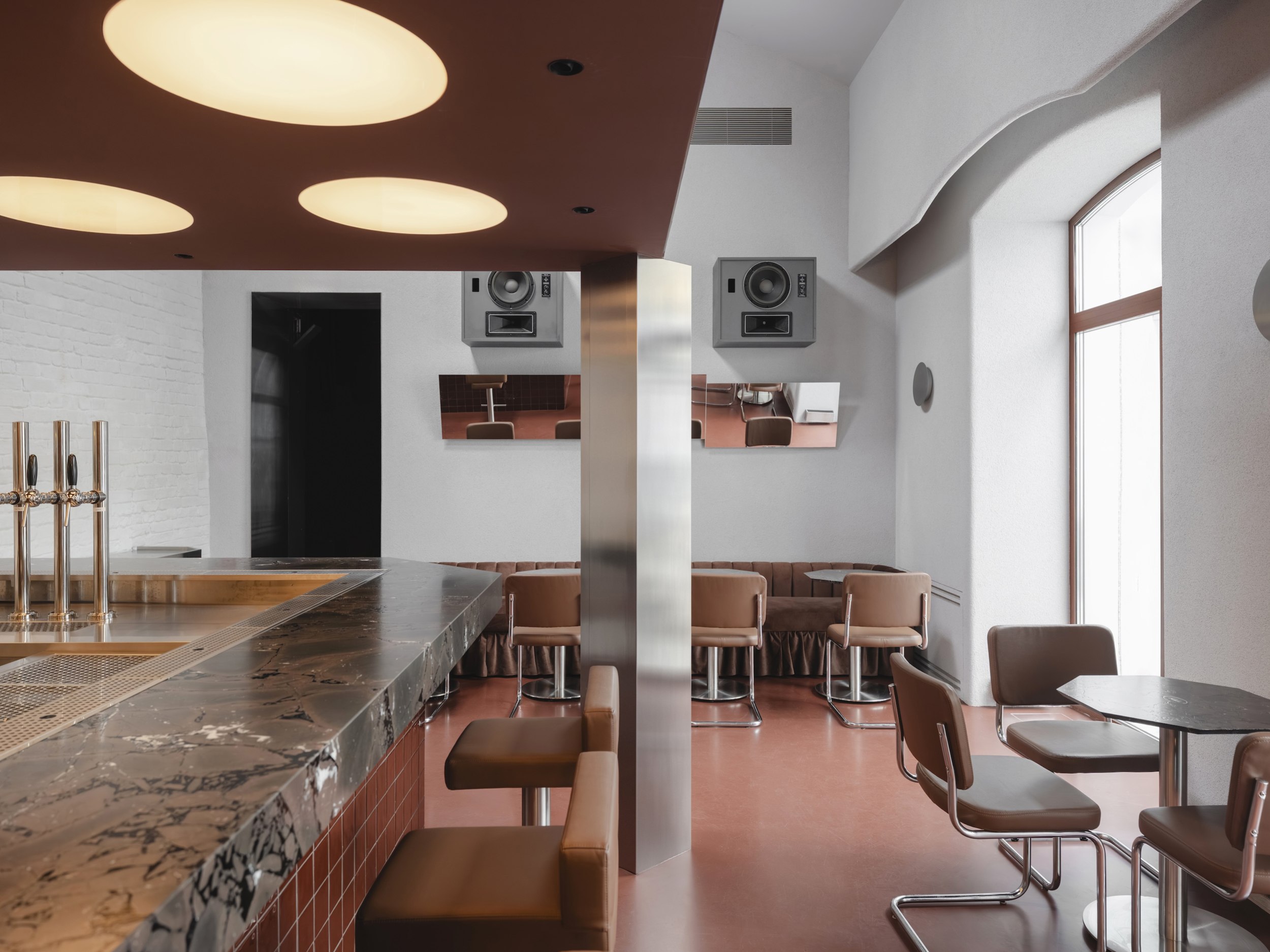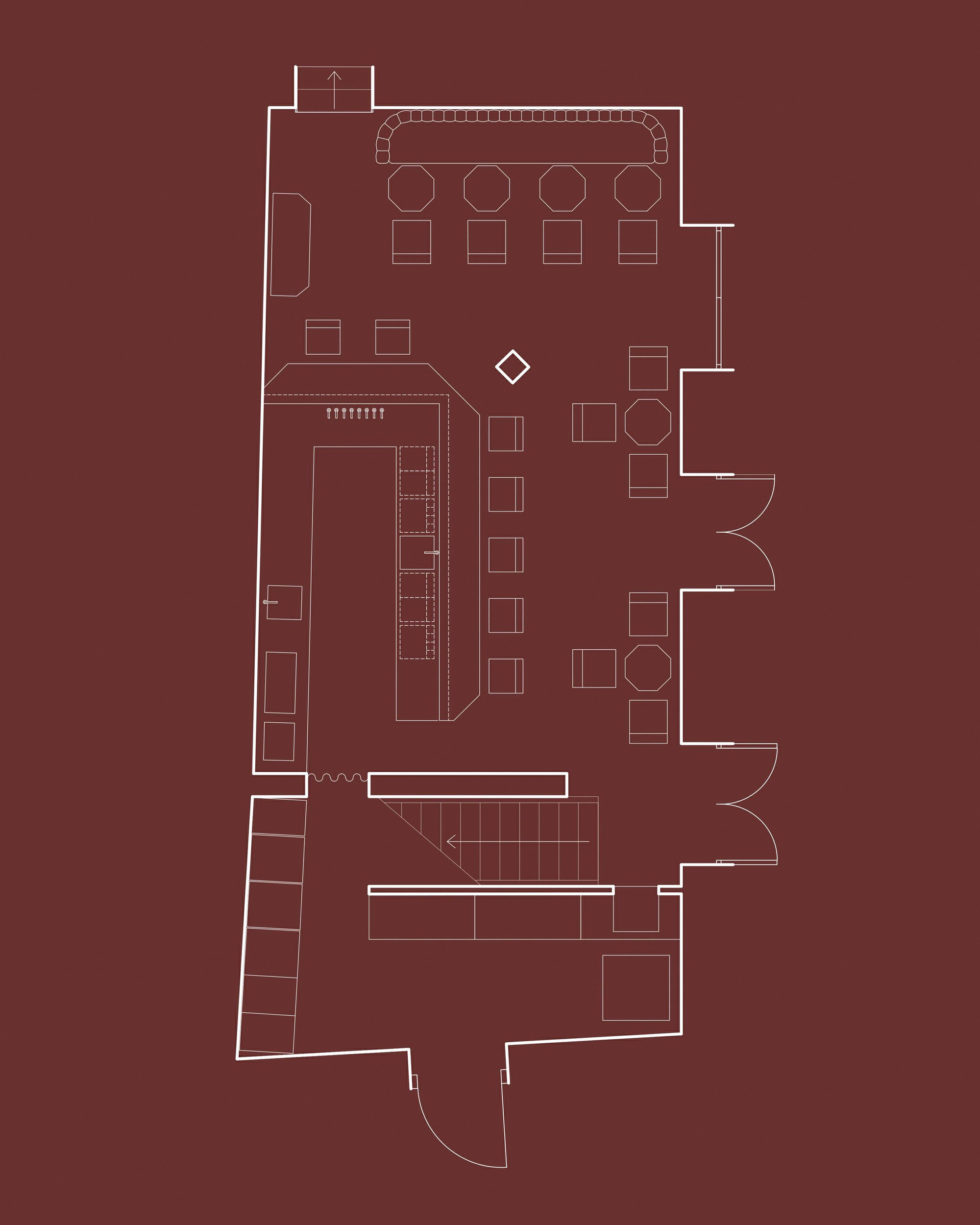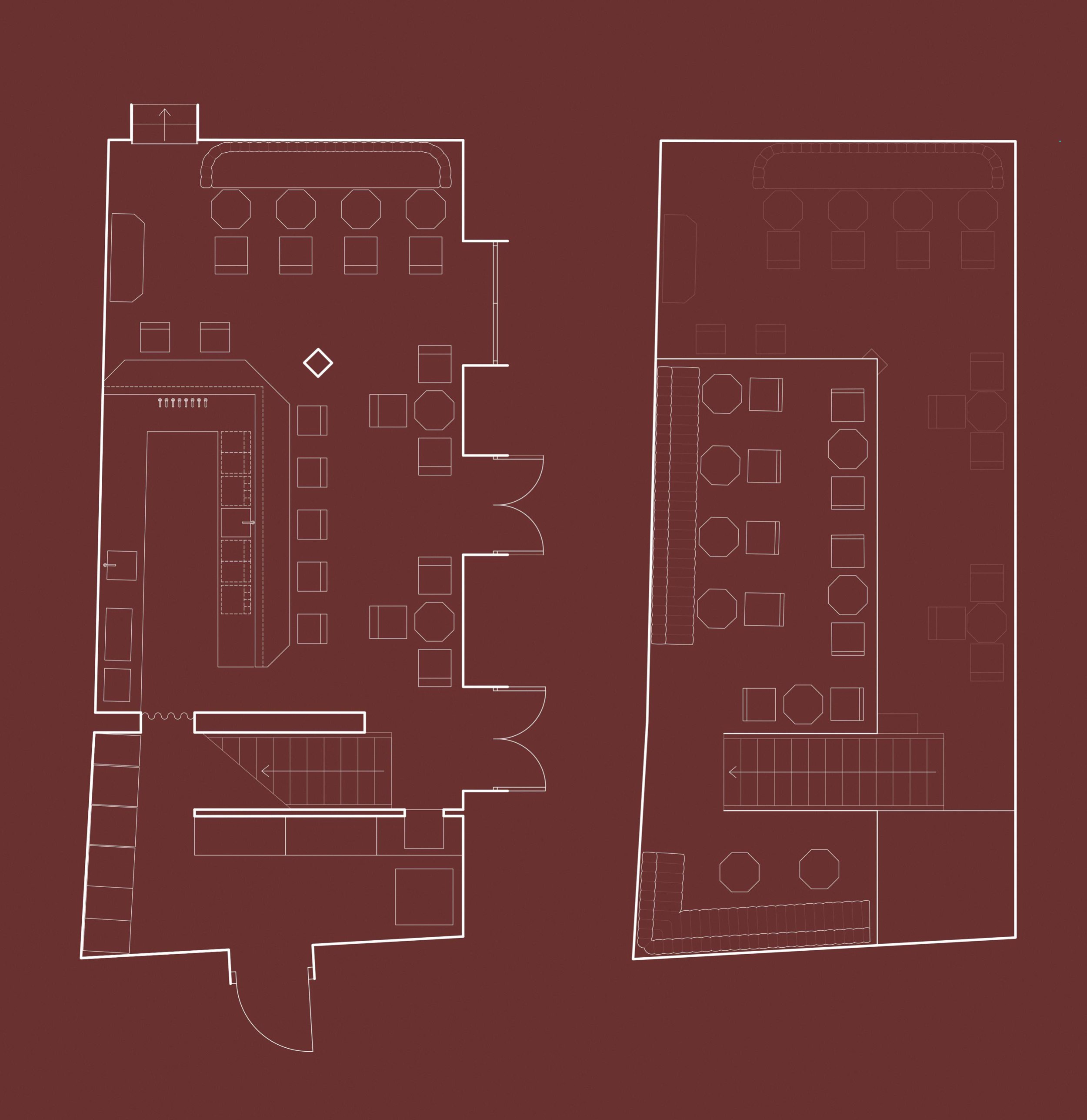 Концепция интерьера пространства основана на синтезе эстетики классических клубов и современного дизайна. Первый этаж бара выполнен в духе бистро: здесь предполагается более подвижная, шумная и проходная зона. Основу его интерьера составляют приглушенная цветовая гамма с преобладанием древесных и глубоких темных тонов, кожаная обивка мебели, глянцевая плитка в облицовке барной зоны, а также каменные поверхности столов и барной стойки. Второй уровень оформлен как лаунж-зона: здесь стоят вельветовые диваны и стулья с подлокотниками, а нуарная атмосфера поддерживается акцентным освещением столов.