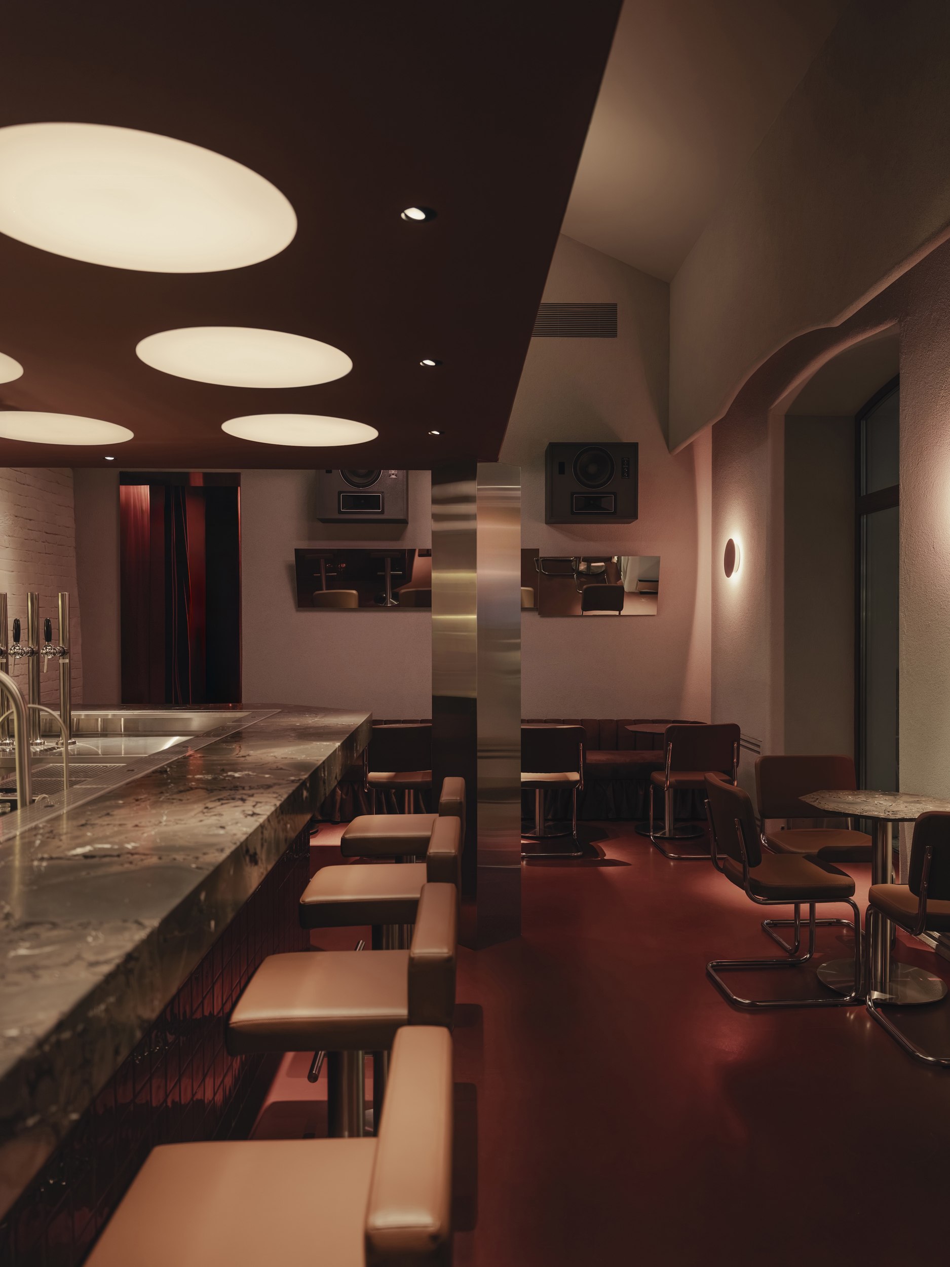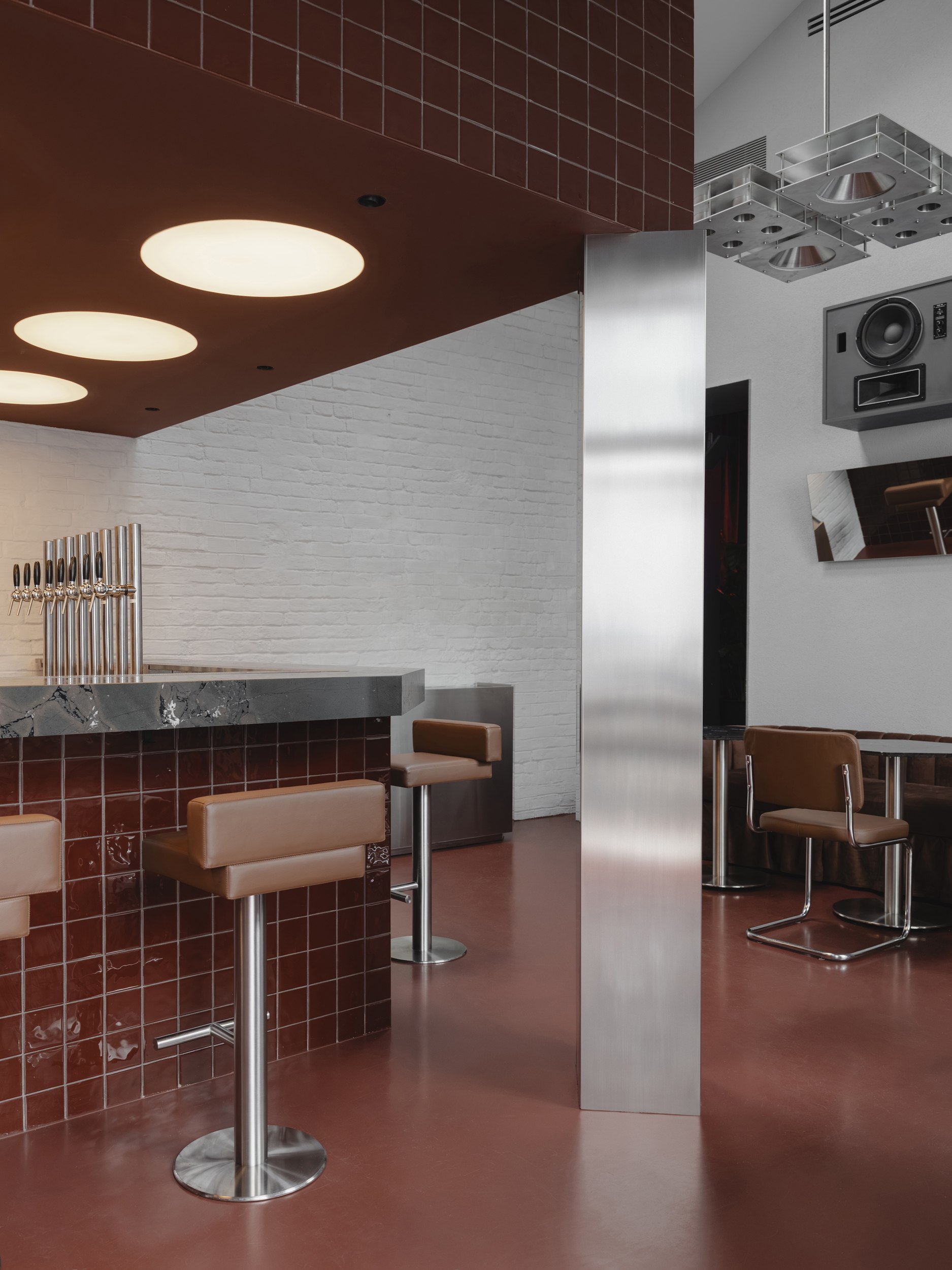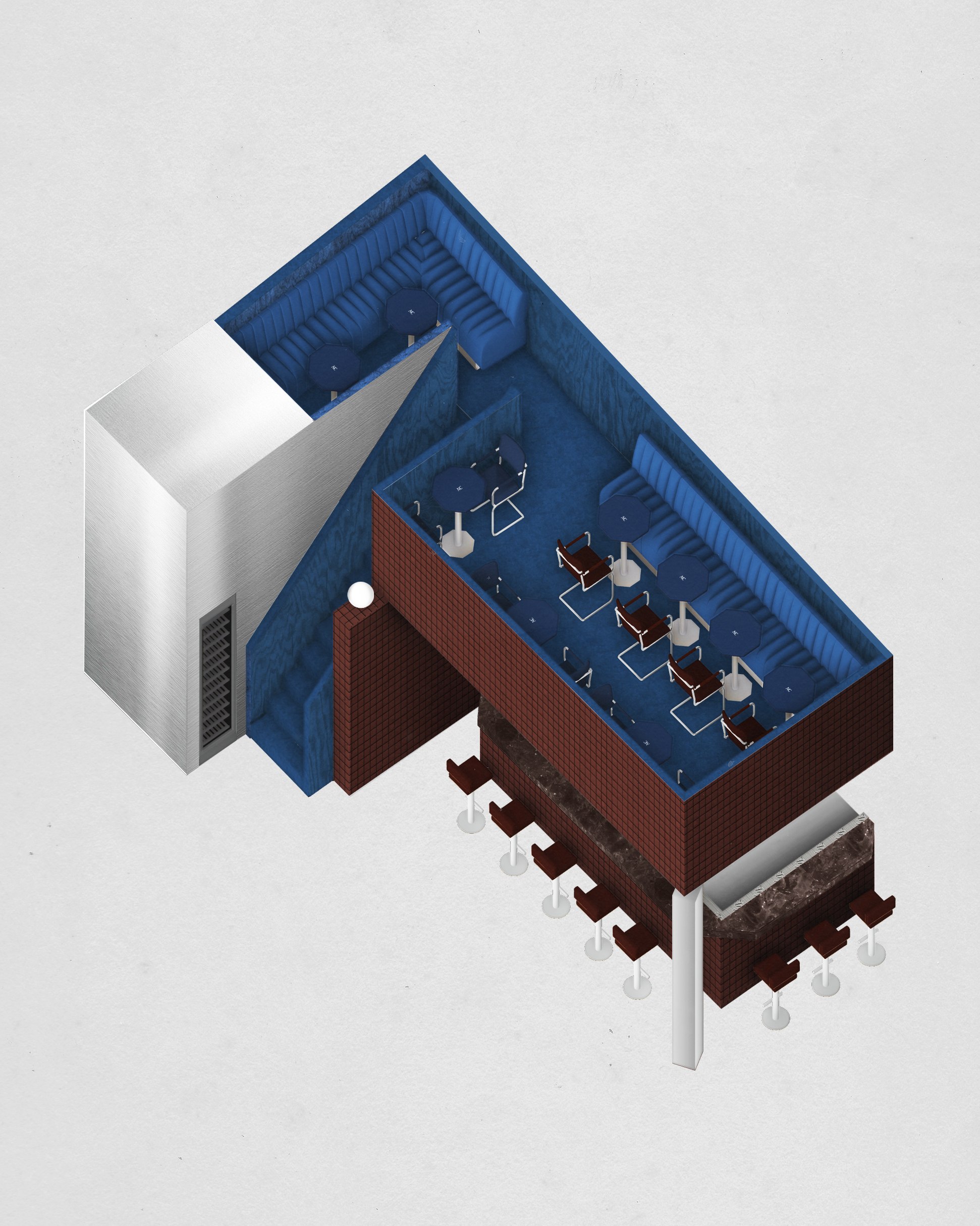Концепция интерьера пространства основана на синтезе эстетики классических клубов и современного дизайна. Первый этаж бара выполнен в духе бистро: здесь предполагается более подвижная, шумная и проходная зона. Основу его интерьера составляют приглушенная цветовая гамма с преобладанием древесных и глубоких темных тонов, кожаная обивка мебели, глянцевая плитка в облицовке барной зоны, а также каменные поверхности столов и барной стойки. Второй уровень оформлен как лаунж-зона: здесь стоят вельветовые диваны и стулья с подлокотниками, а нуарная атмосфера поддерживается акцентным освещением столов.