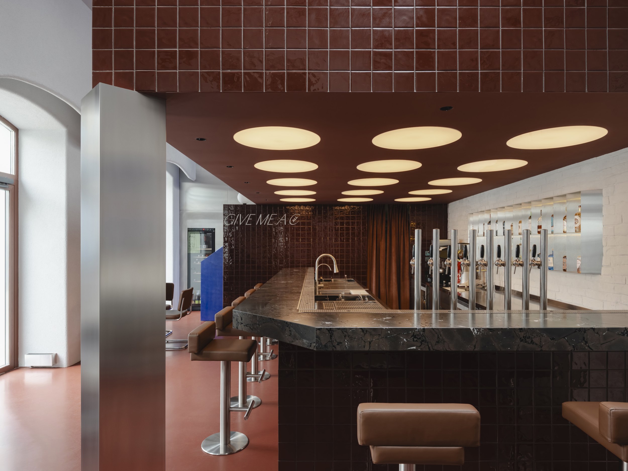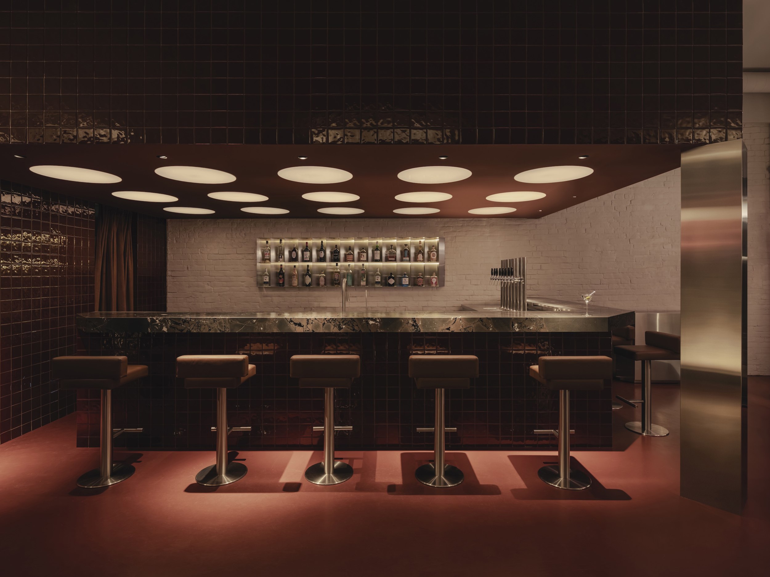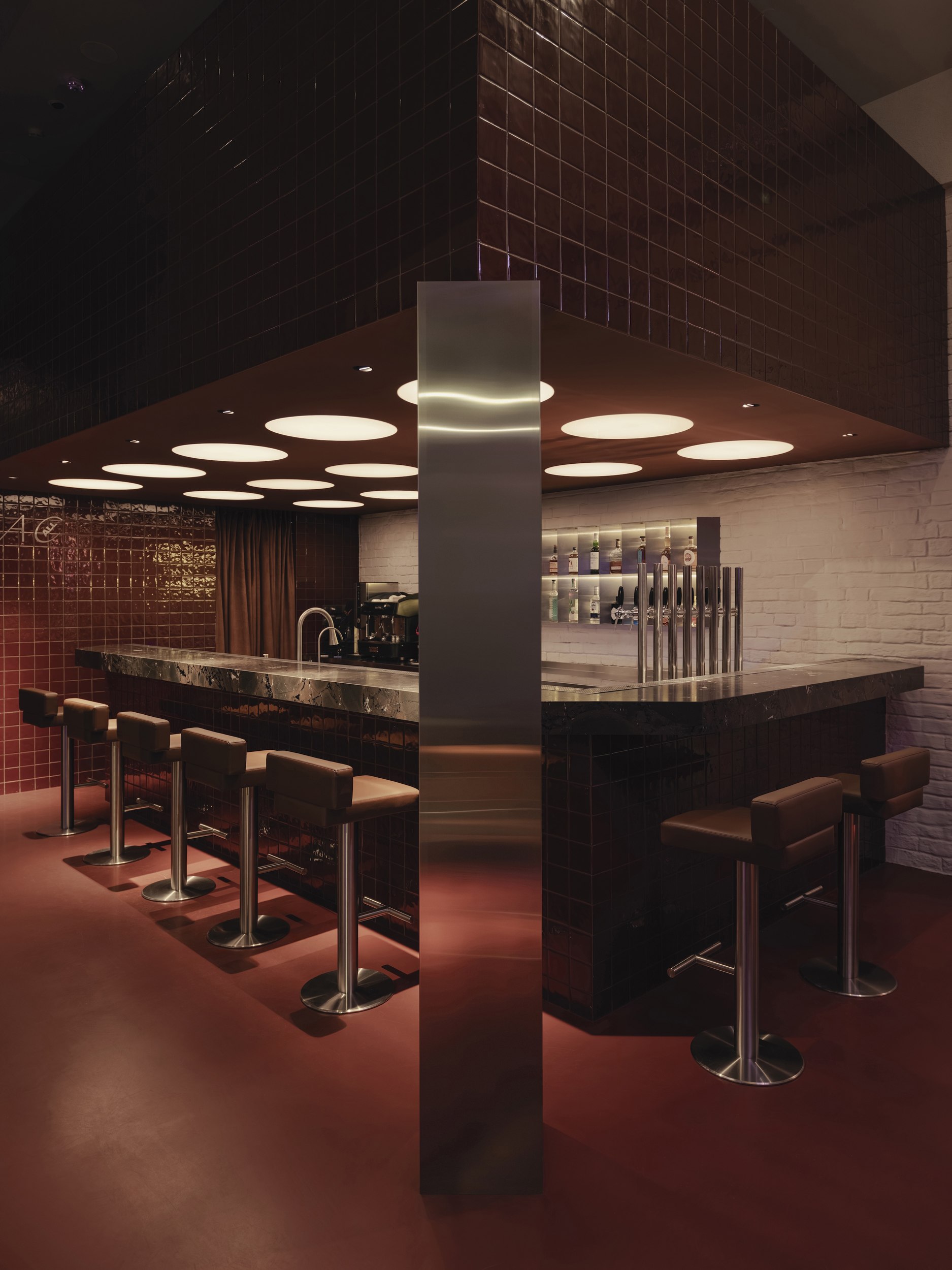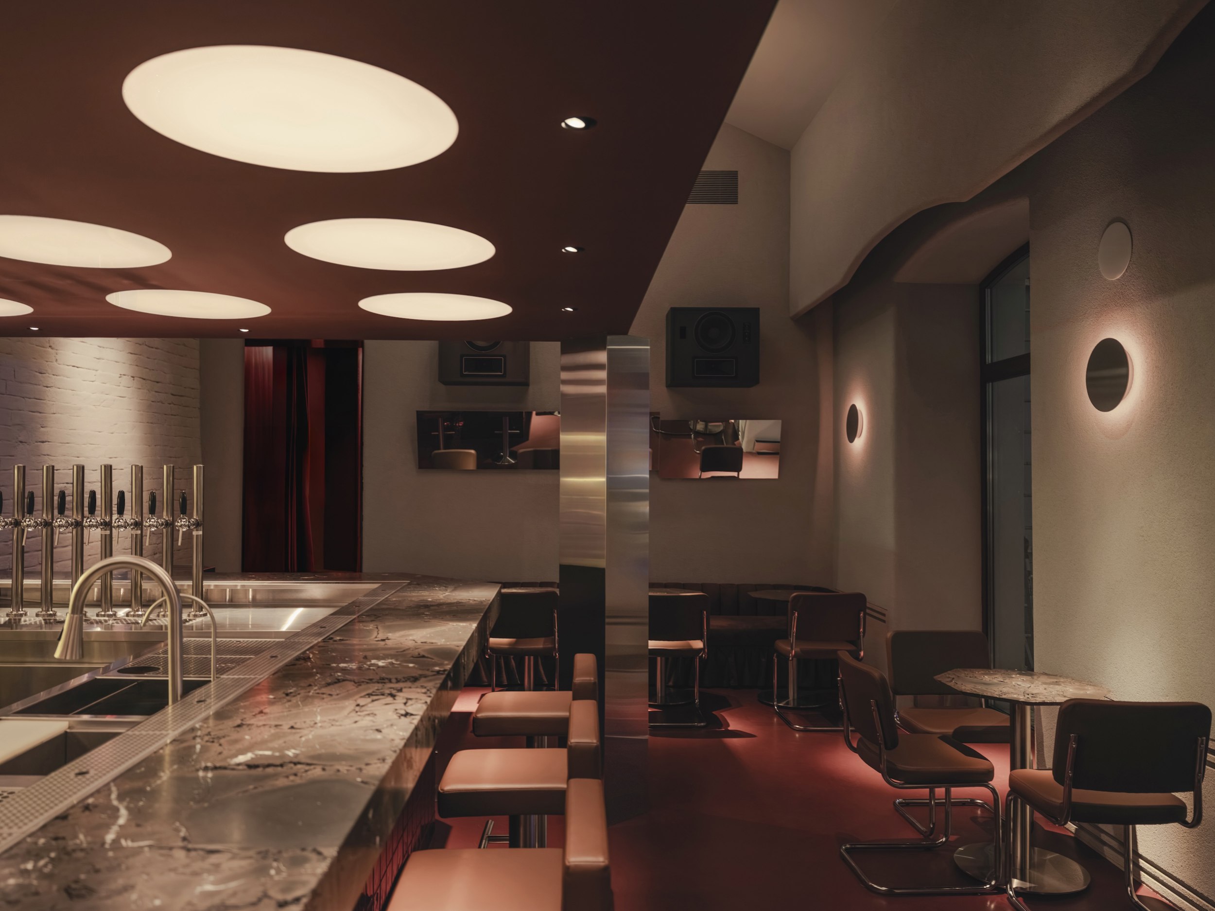 Концепция интерьера пространства основана на синтезе эстетики классических клубов и современного дизайна. Первый этаж бара выполнен в духе бистро: здесь предполагается более подвижная, шумная и проходная зона. Основу его интерьера составляют приглушенная цветовая гамма с преобладанием древесных и глубоких темных тонов, кожаная обивка мебели, глянцевая плитка в облицовке барной зоны, а также каменные поверхности столов и барной стойки. Второй уровень оформлен как лаунж-зона: здесь стоят вельветовые диваны и стулья с подлокотниками, а нуарная атмосфера поддерживается акцентным освещением столов.