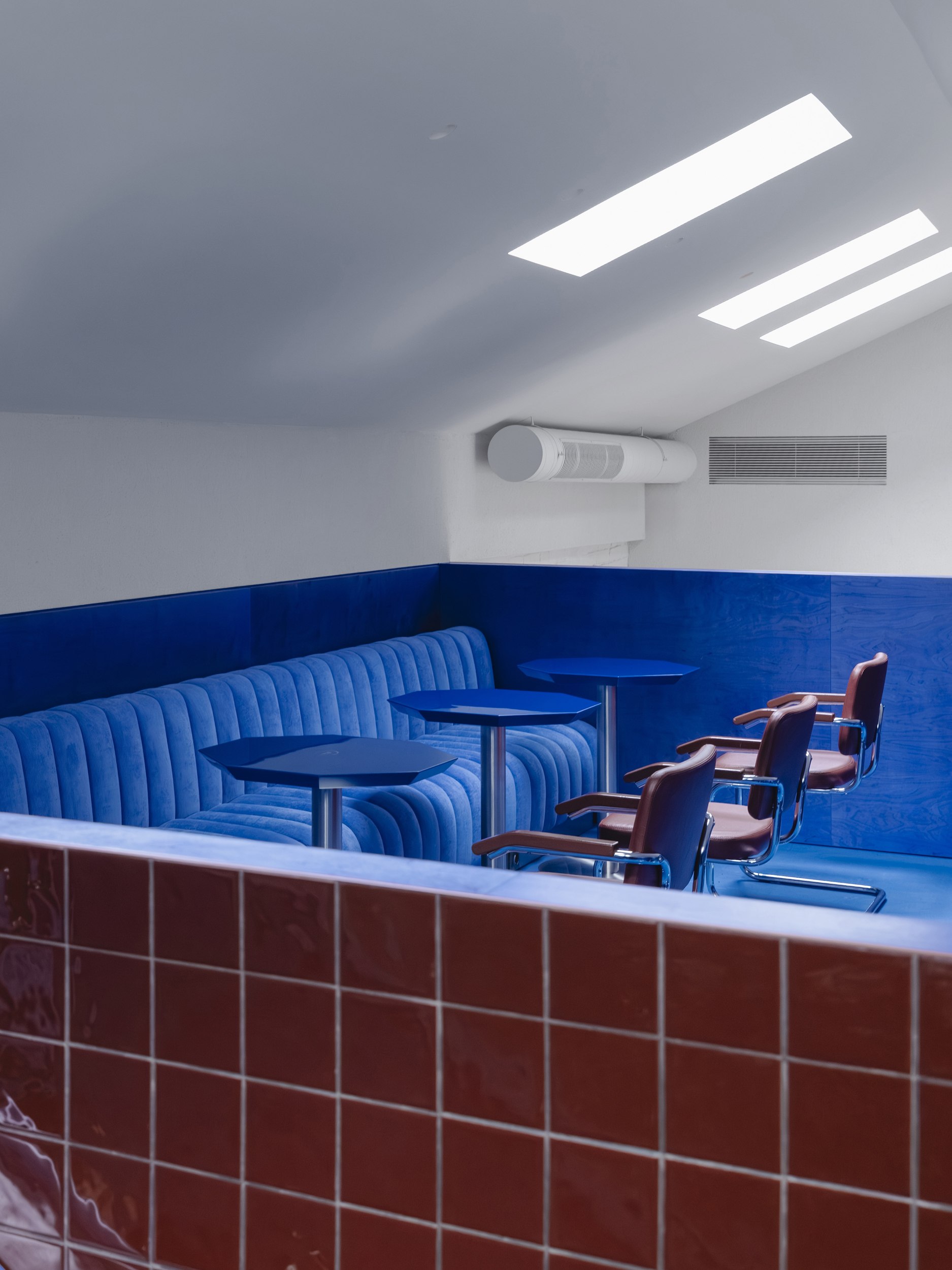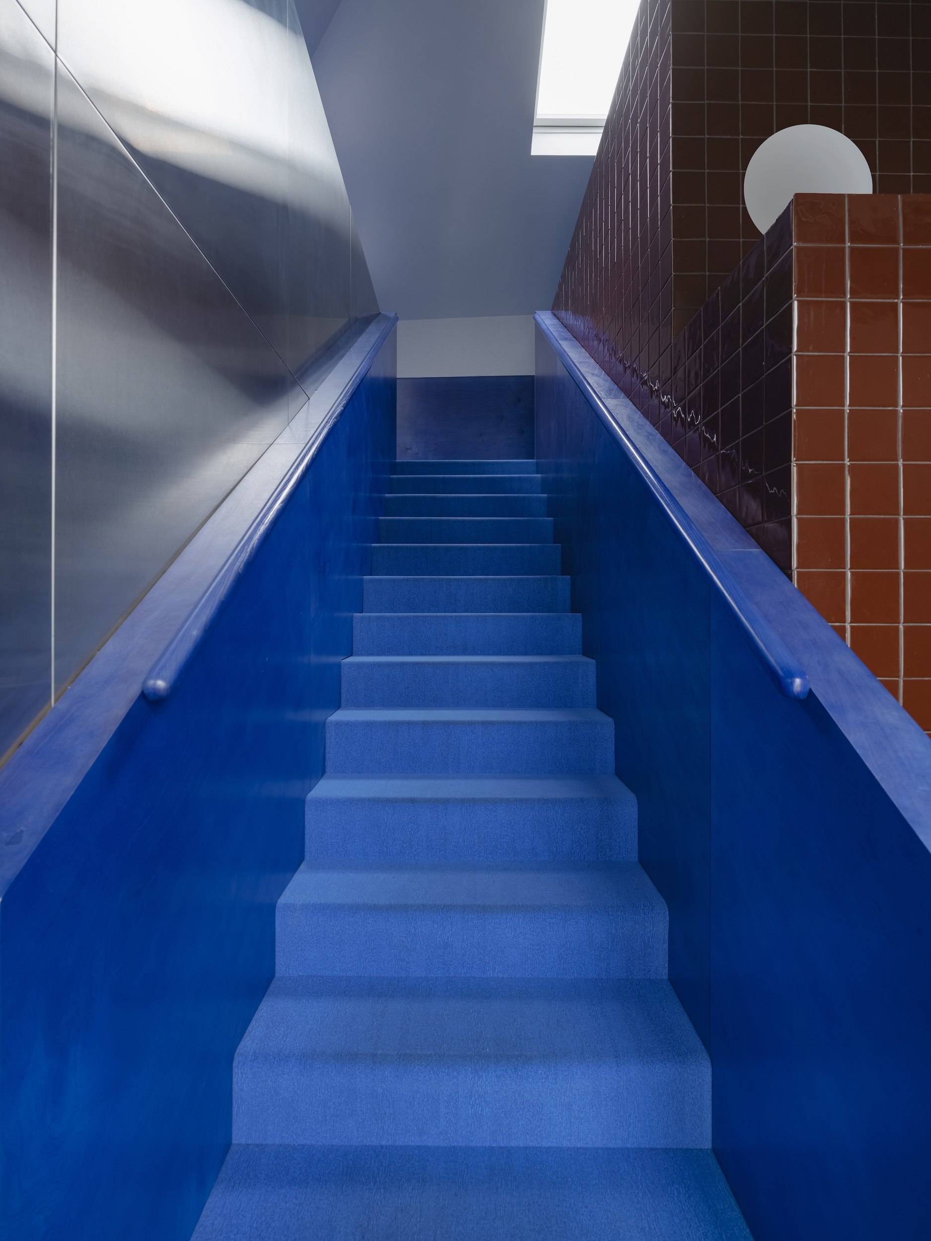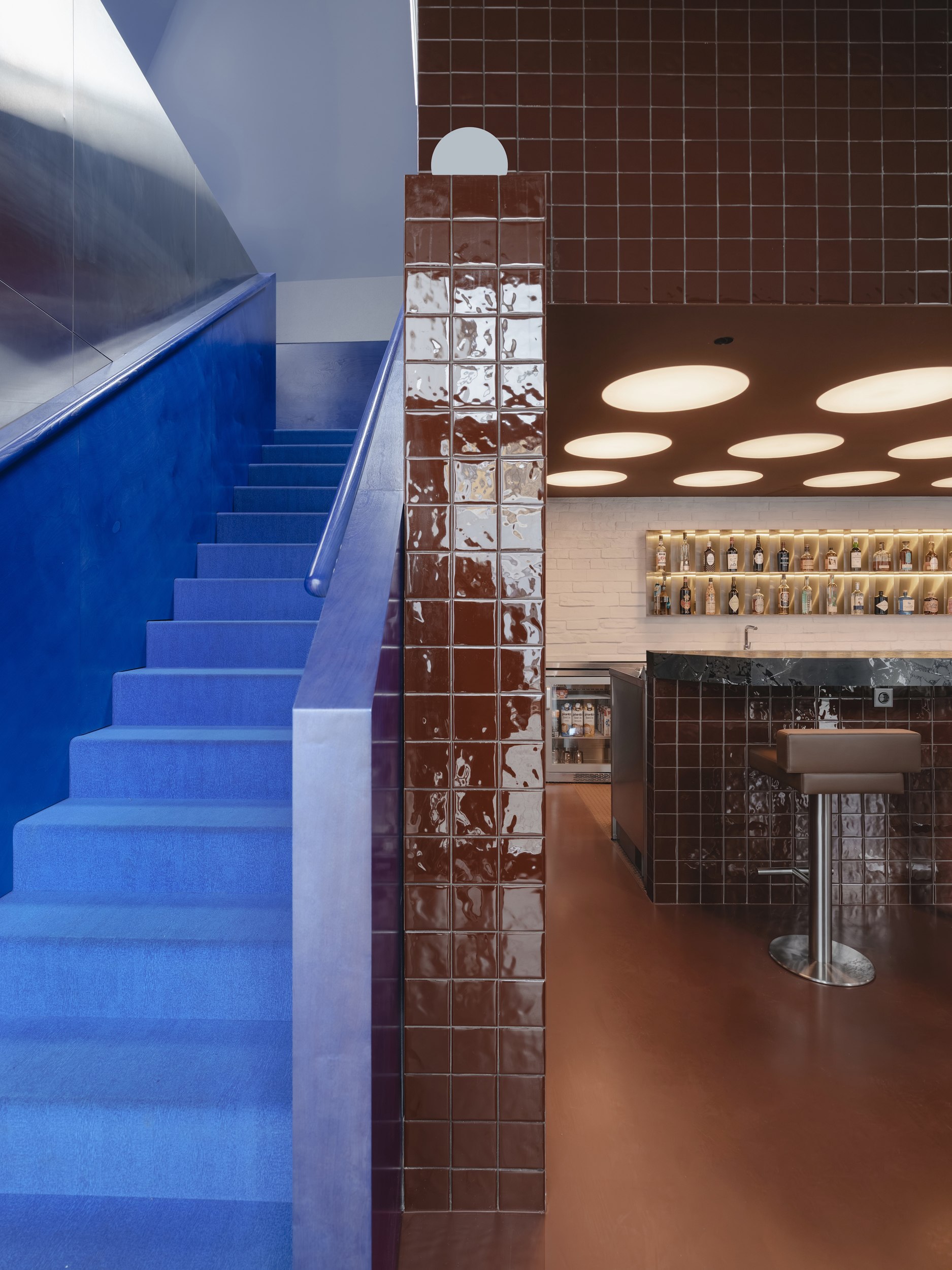 Архитектурный замысел пространства строится вокруг доминантного объема из глянцевой керамики. Он задуман массивным и брутальным – при этом опирается на одну колонну, а вокруг него оборачивается синяя лента лестницы, ведущая на второй уровень.