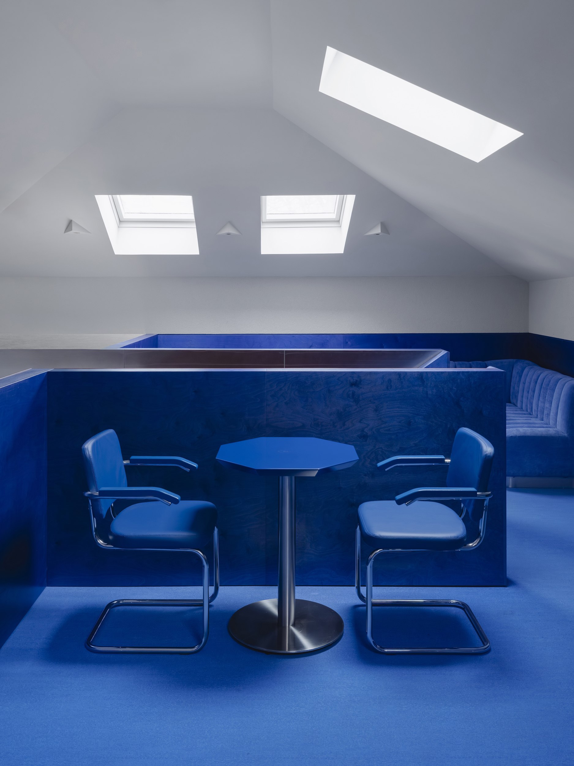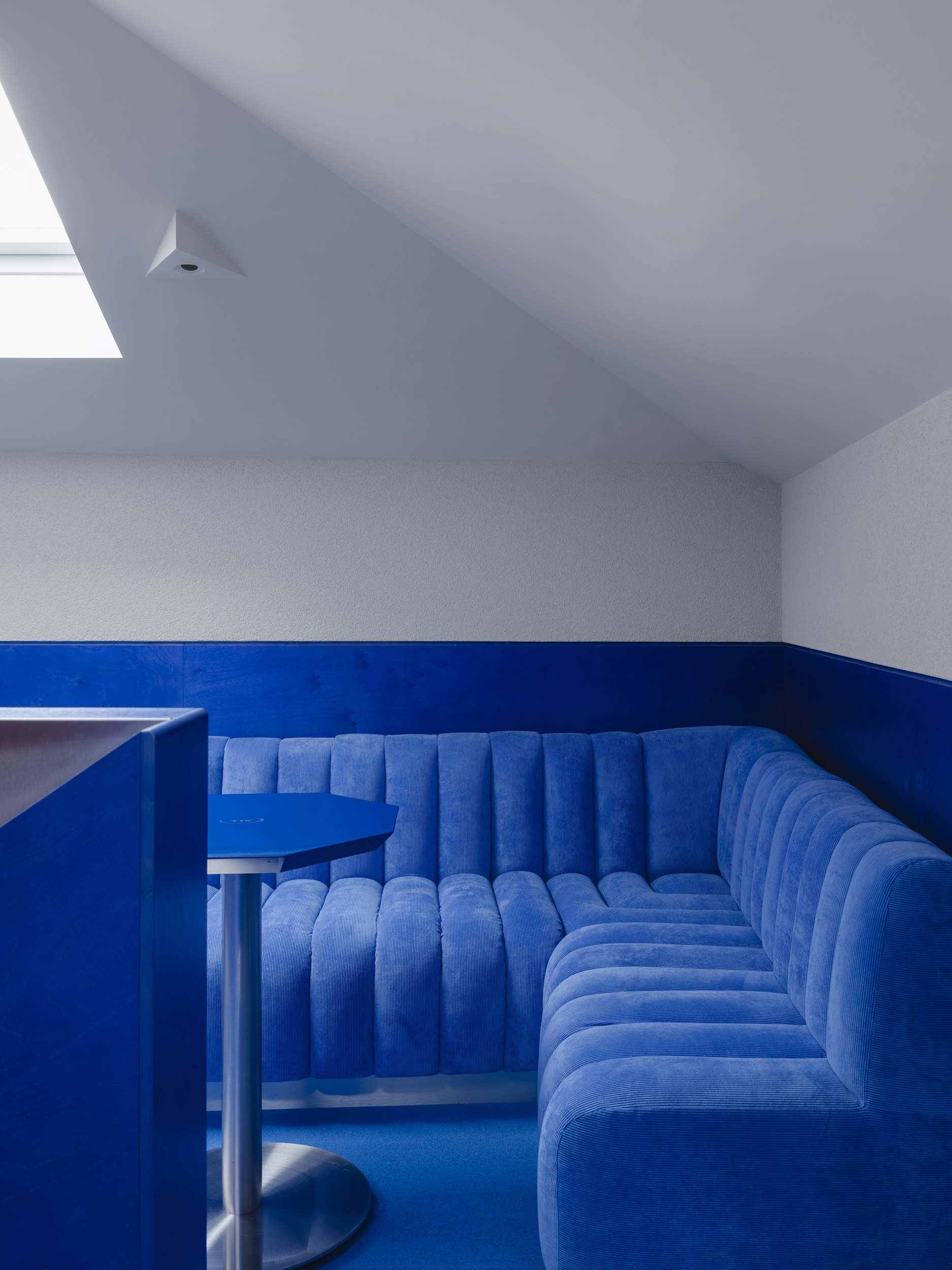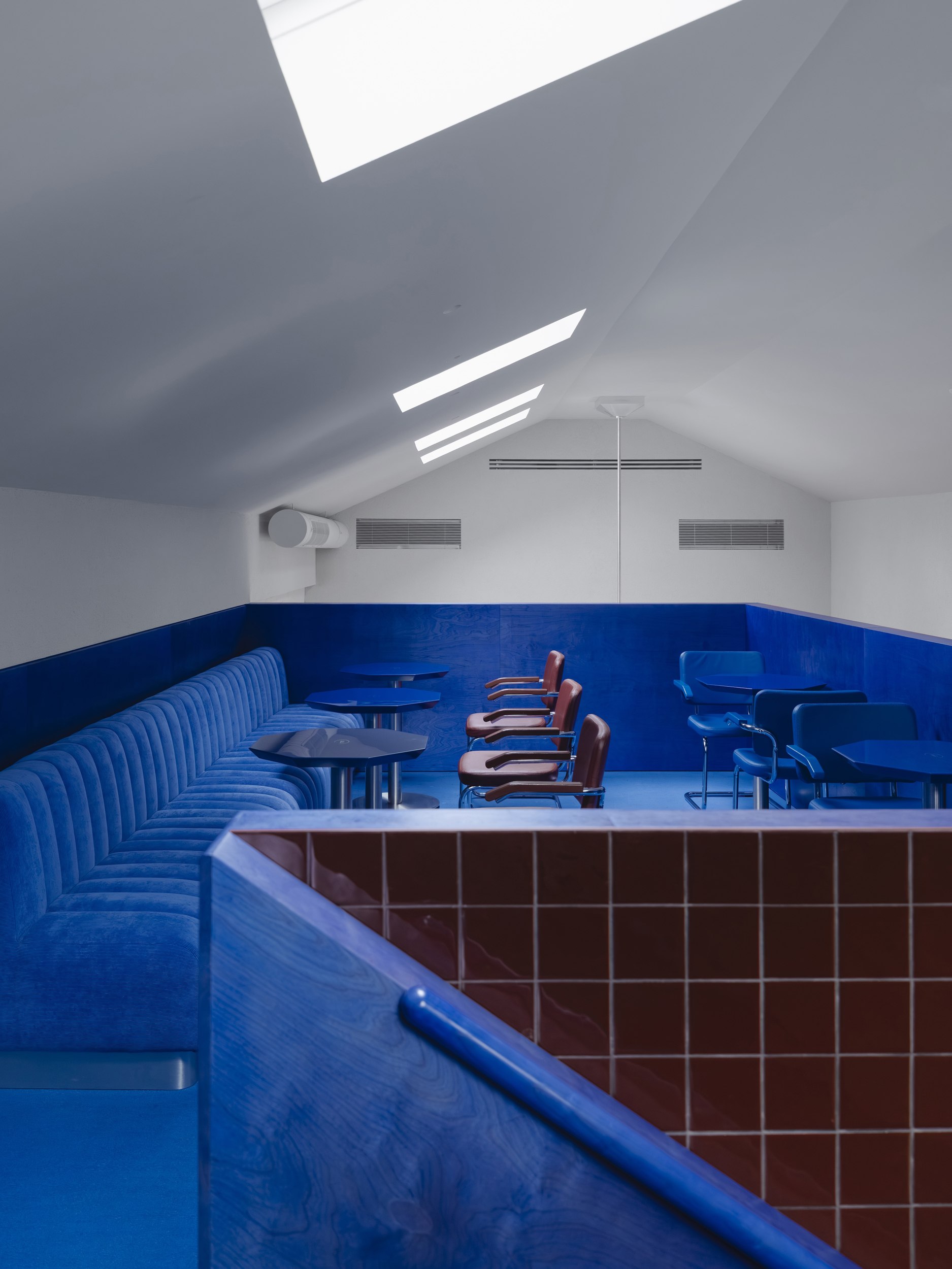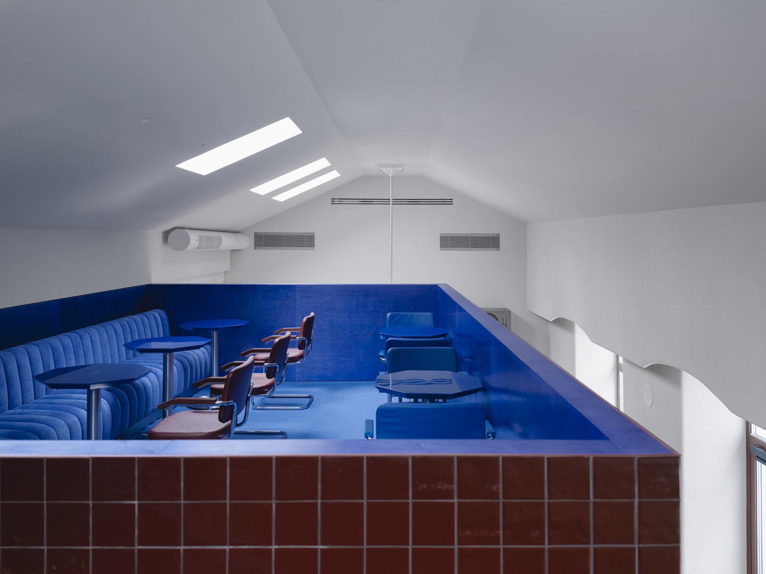 Архитектурный замысел пространства строится вокруг доминантного объема из глянцевой керамики. Он задуман массивным и брутальным – при этом опирается на одну колонну, а вокруг него оборачивается синяя лента лестницы, ведущая на второй уровень.