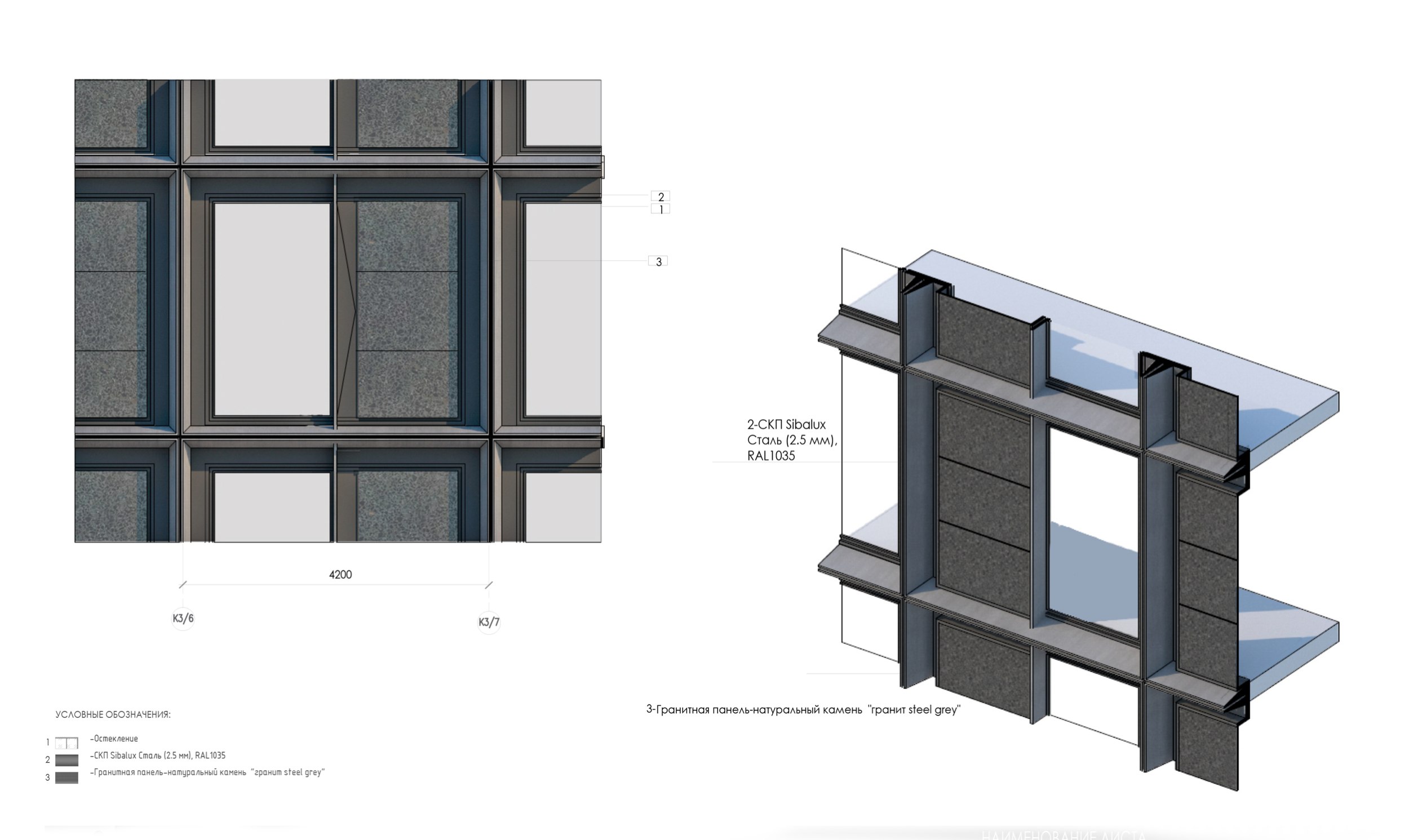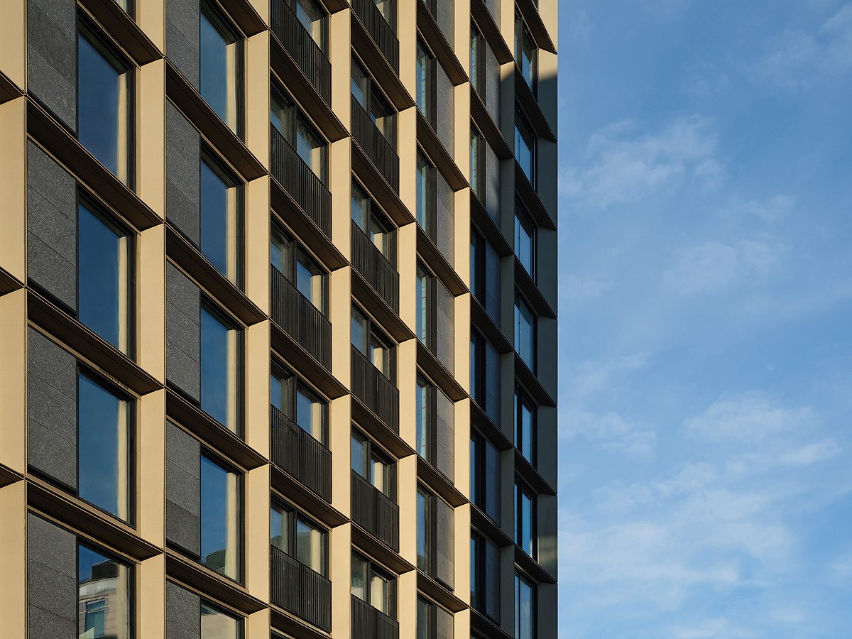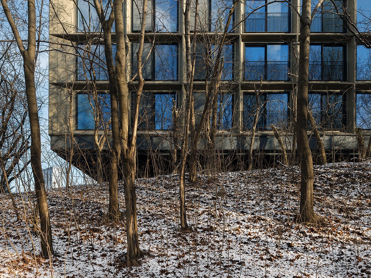 В отделке фасадов использованы металл и натуральный камень. Консоли входных групп и пикселированные террасы верхних этажей формируют эффект «вырезанных» из монолита объёмов. На верхних уровнях расположены просторные квартиры и пентхаусы с видами на парк и комплекс «Лужники».
