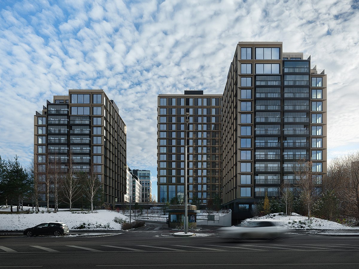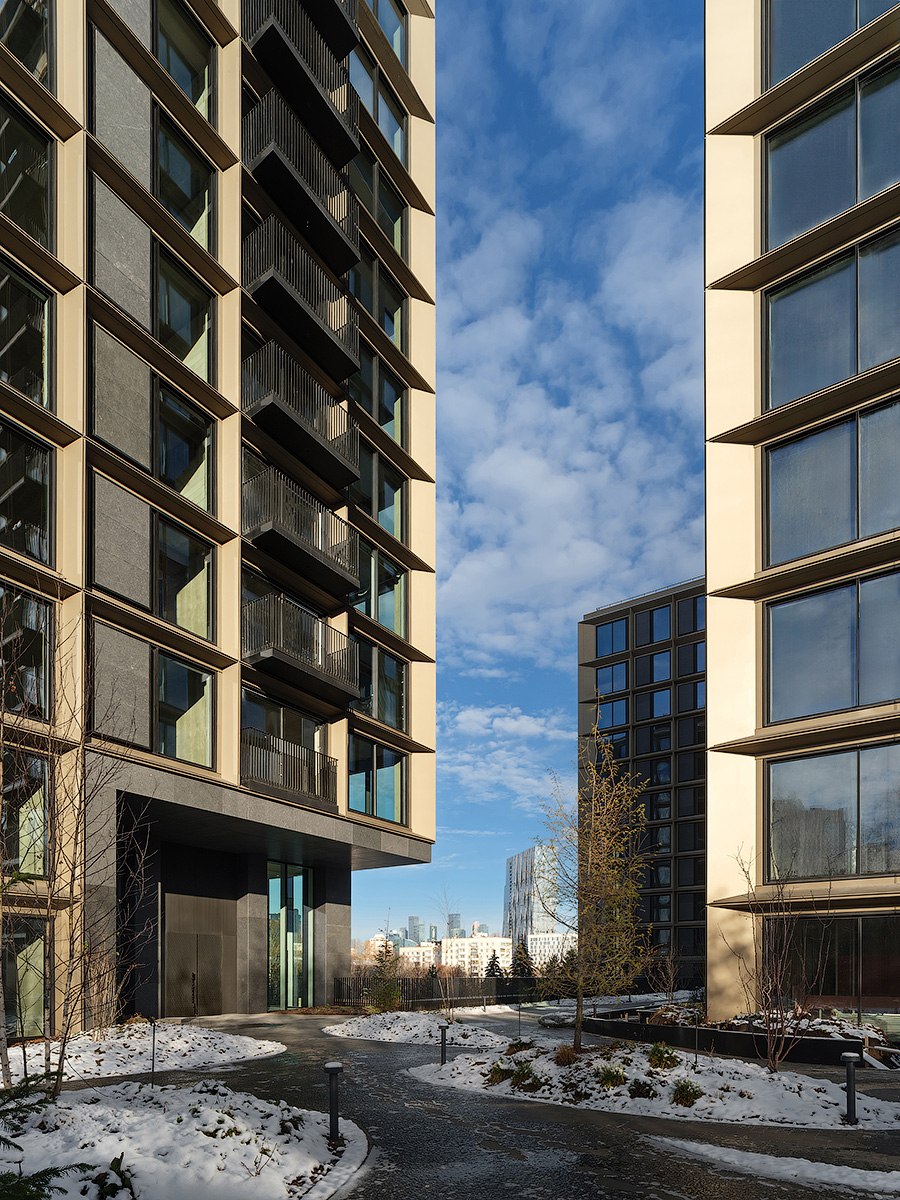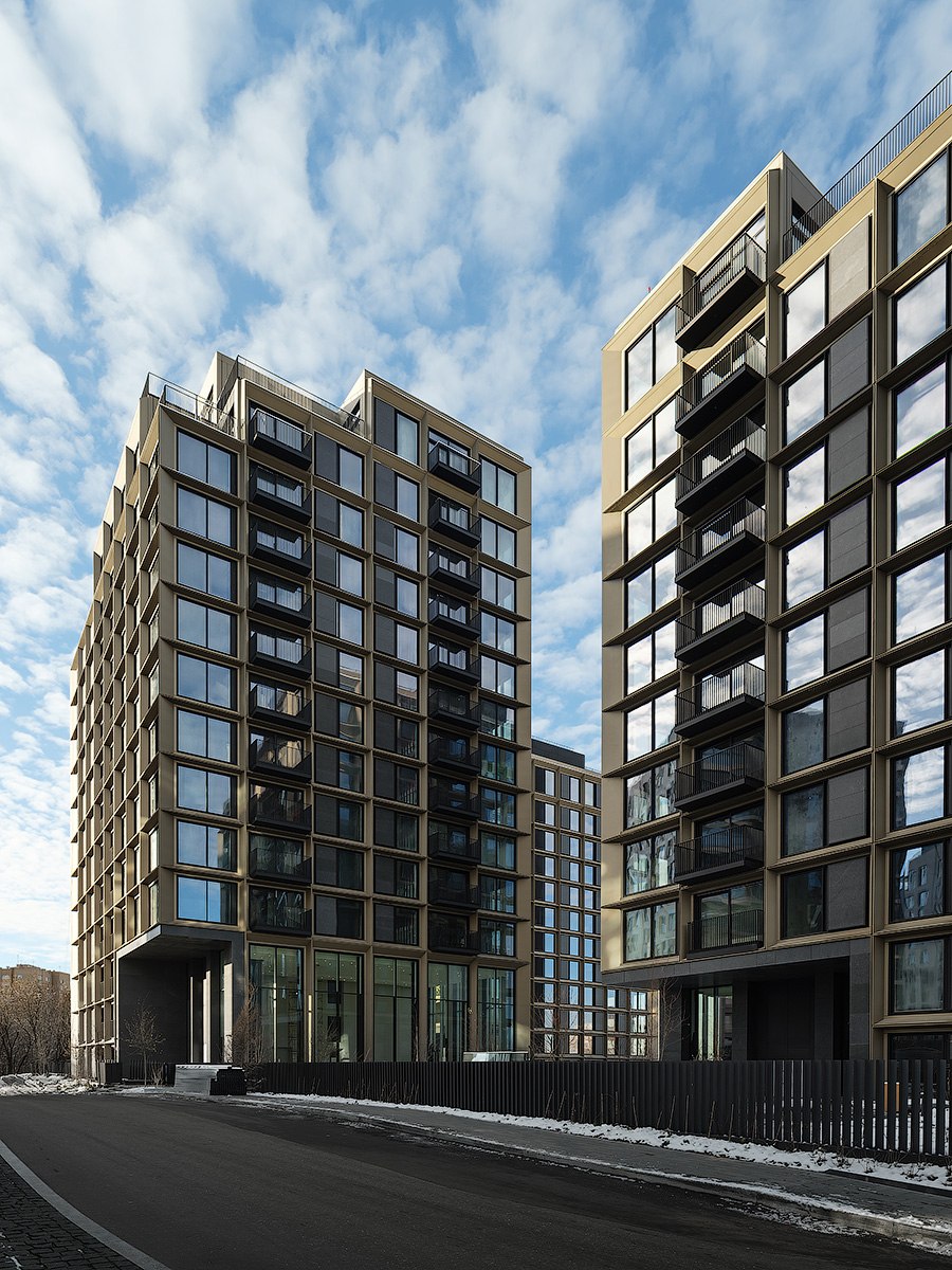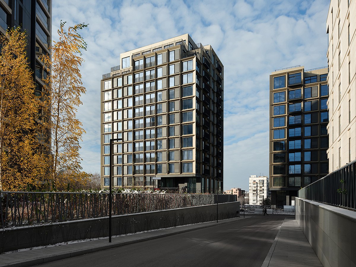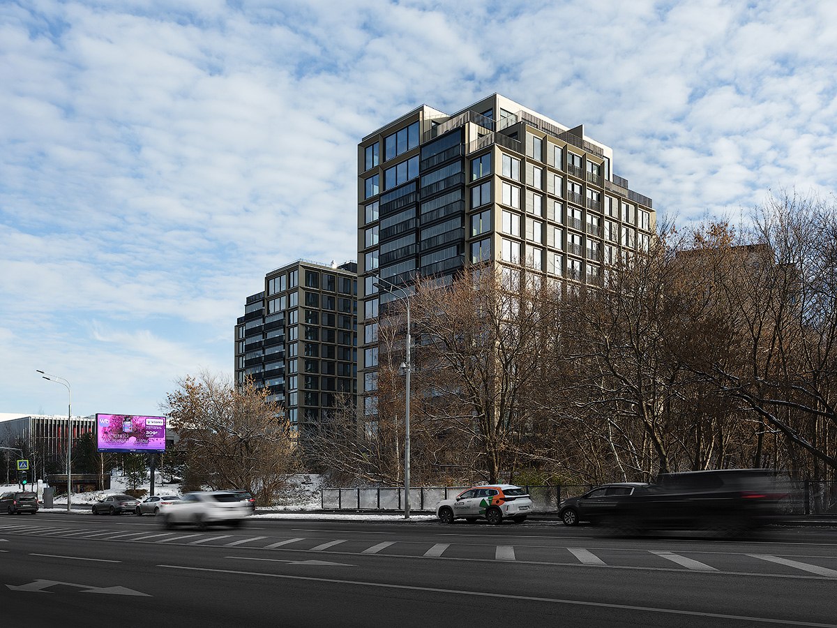 Композиционной основой застройки стали три объёма-куба высотой 11, 12 и 14 этажей. Такая градация учитывает рельеф участка и формирует плавный переход от фронта Мосфильмовской улицы к глубине территории, подчёркивая динамику силуэта и обеспечивая органичное включение комплекса в сложившуюся городскую среду.