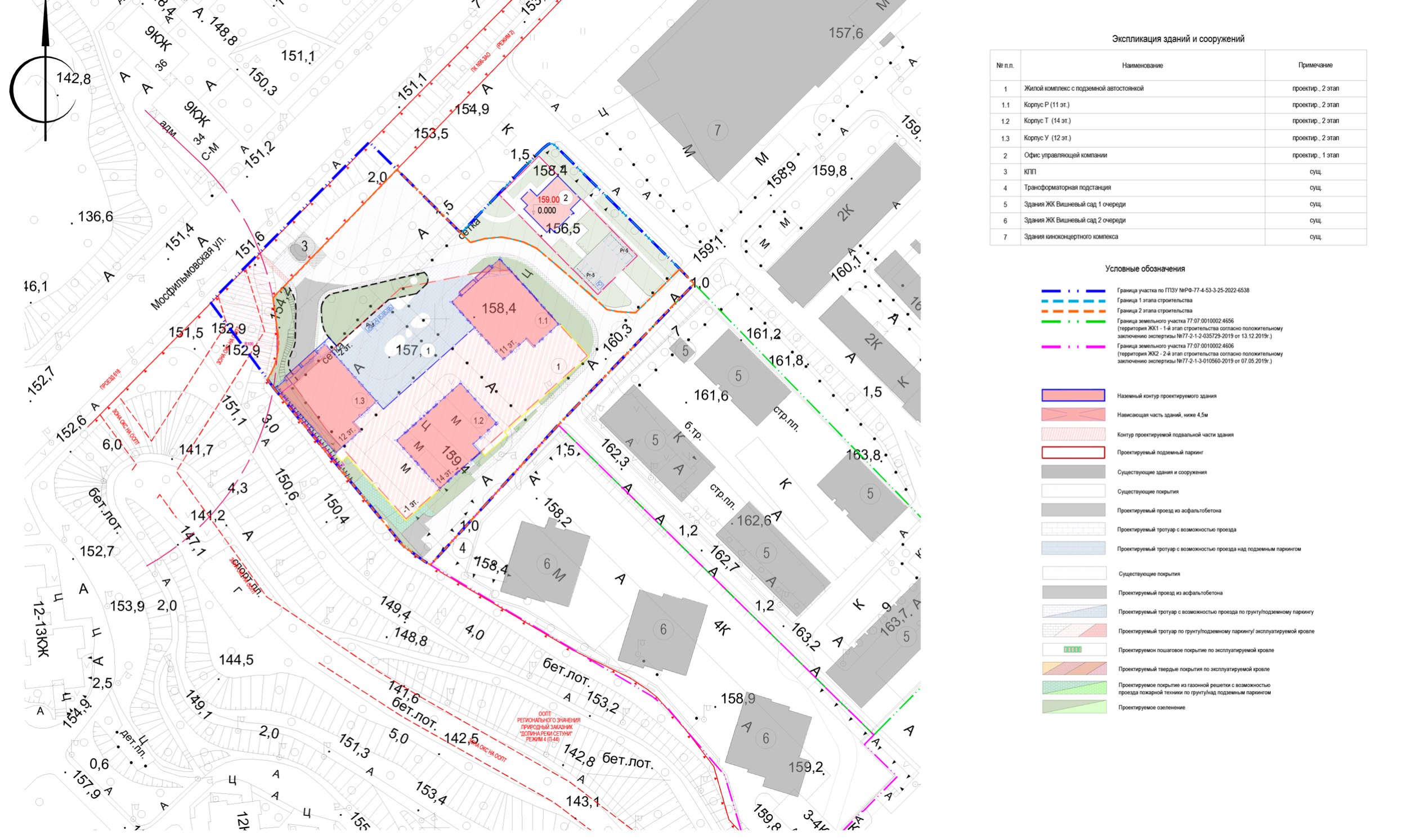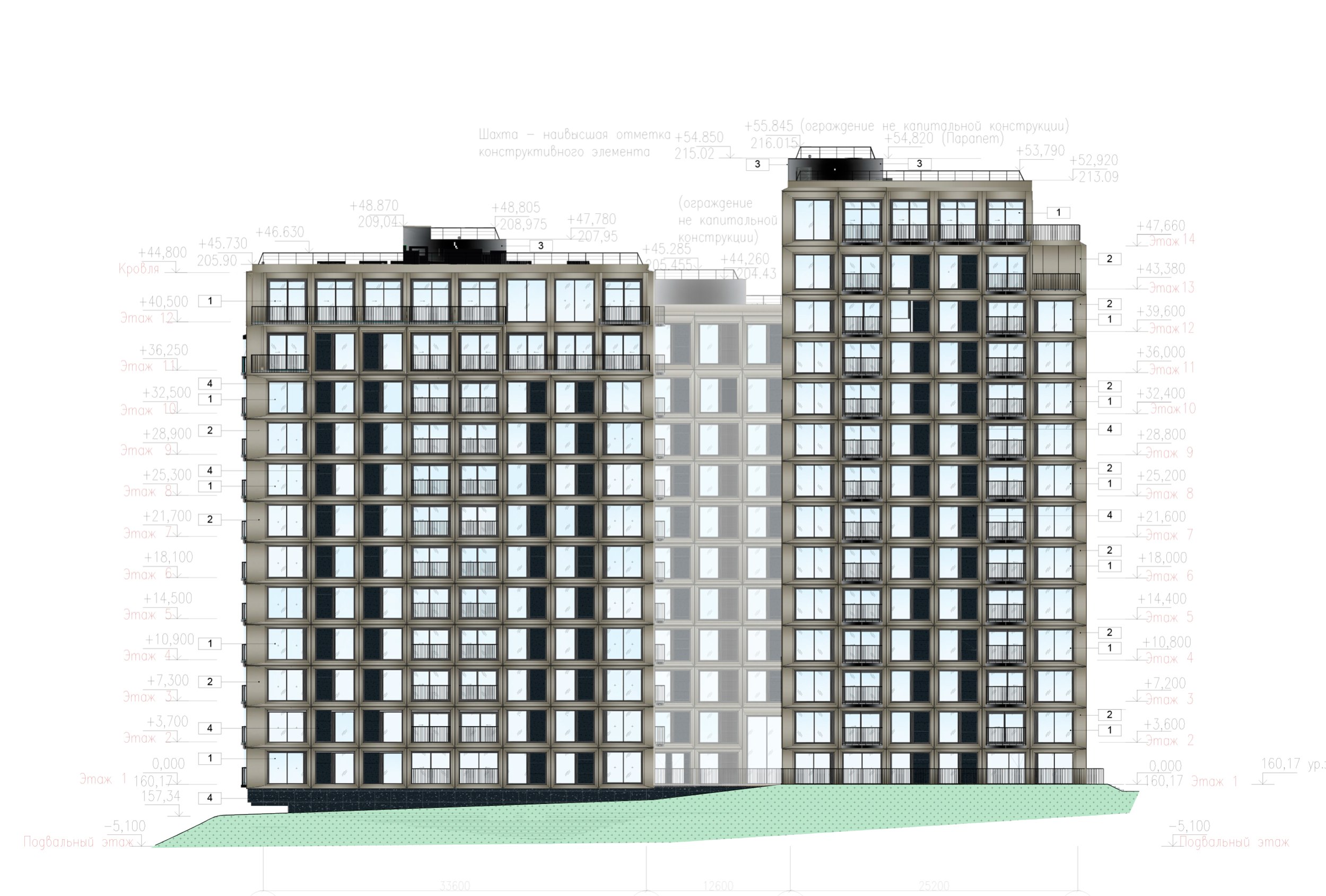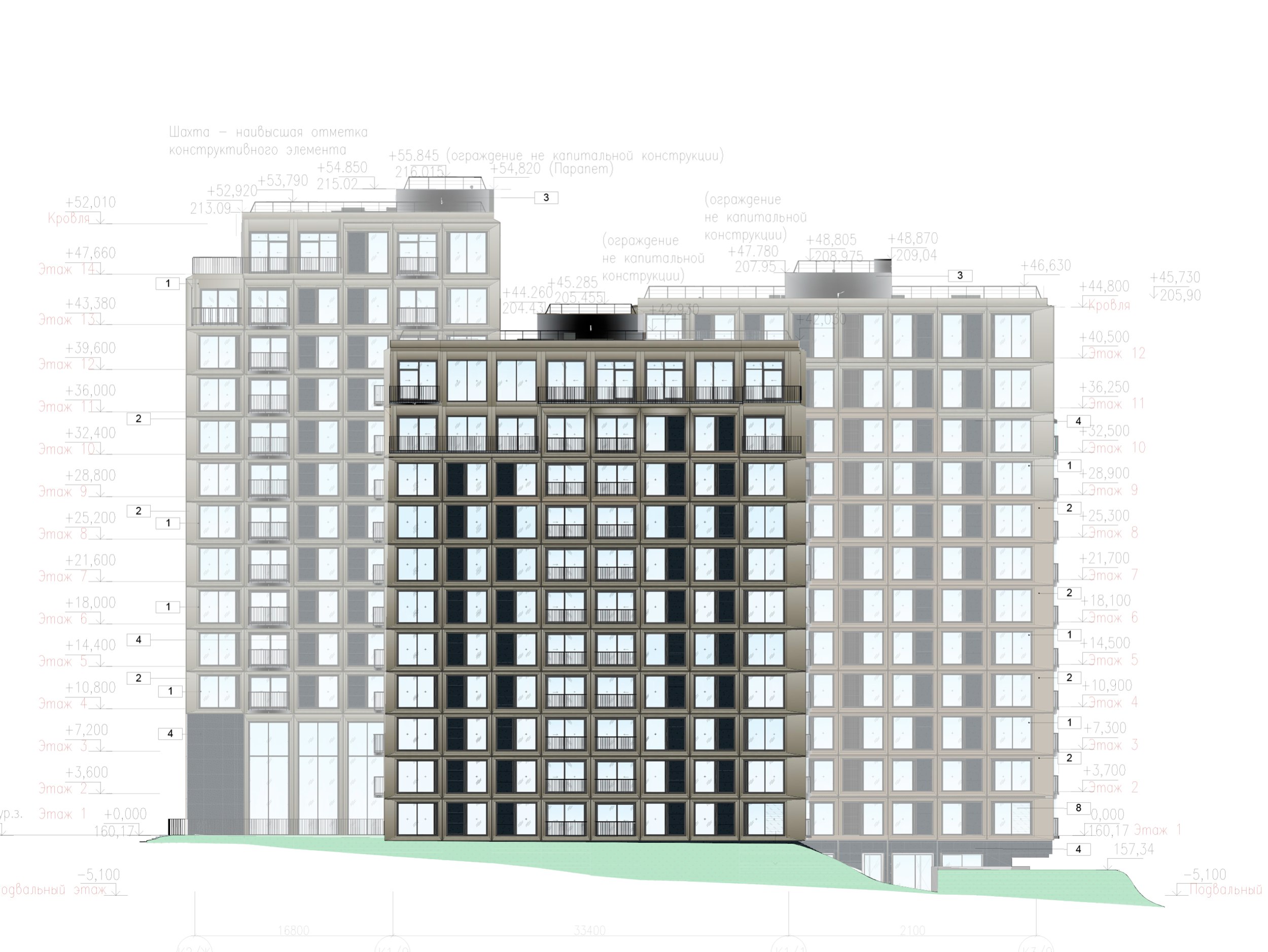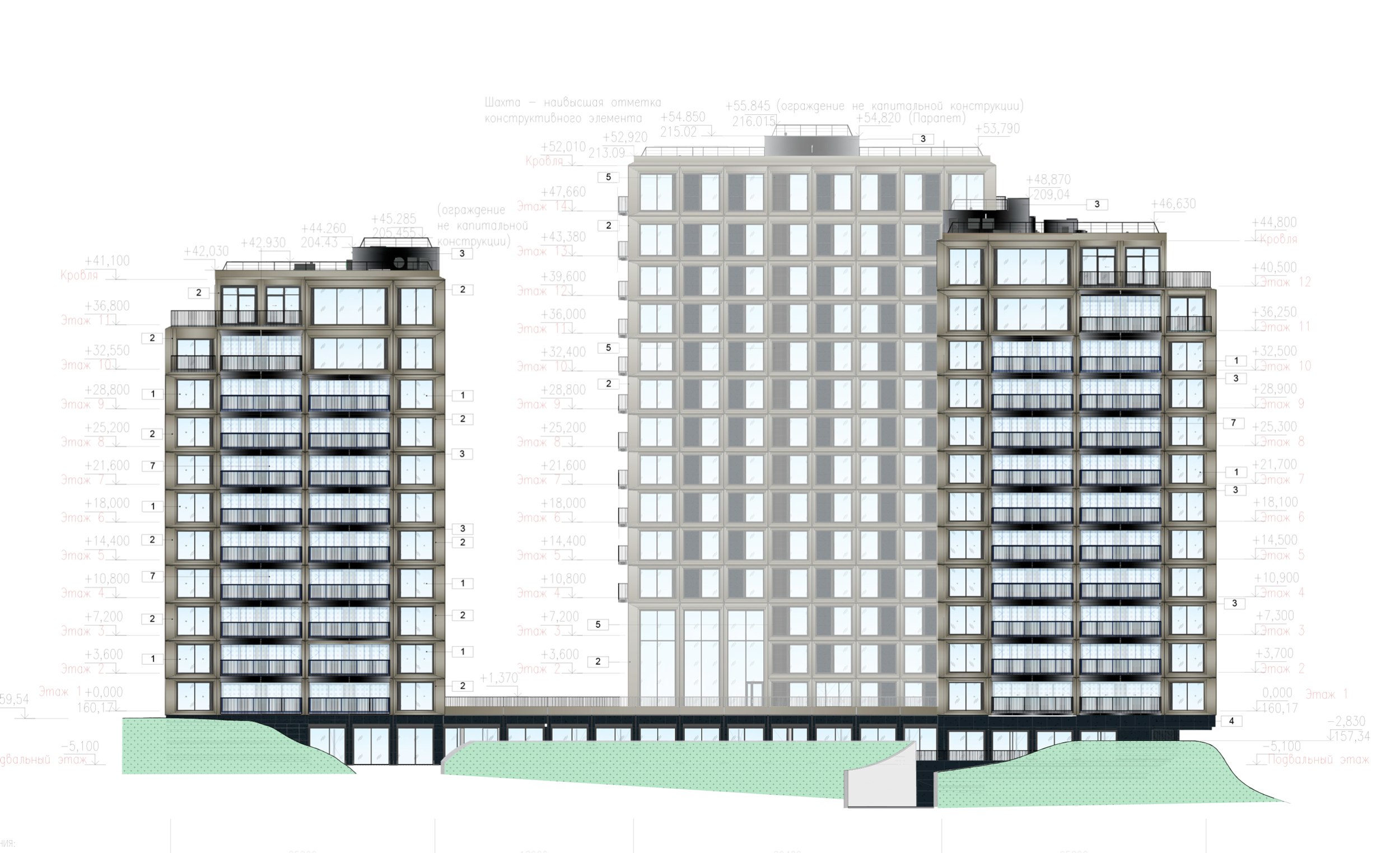 Композиционной основой застройки стали три объёма-куба высотой 11, 12 и 14 этажей. Такая градация учитывает рельеф участка и формирует плавный переход от фронта Мосфильмовской улицы к глубине территории, подчёркивая динамику силуэта и обеспечивая органичное включение комплекса в сложившуюся городскую среду.