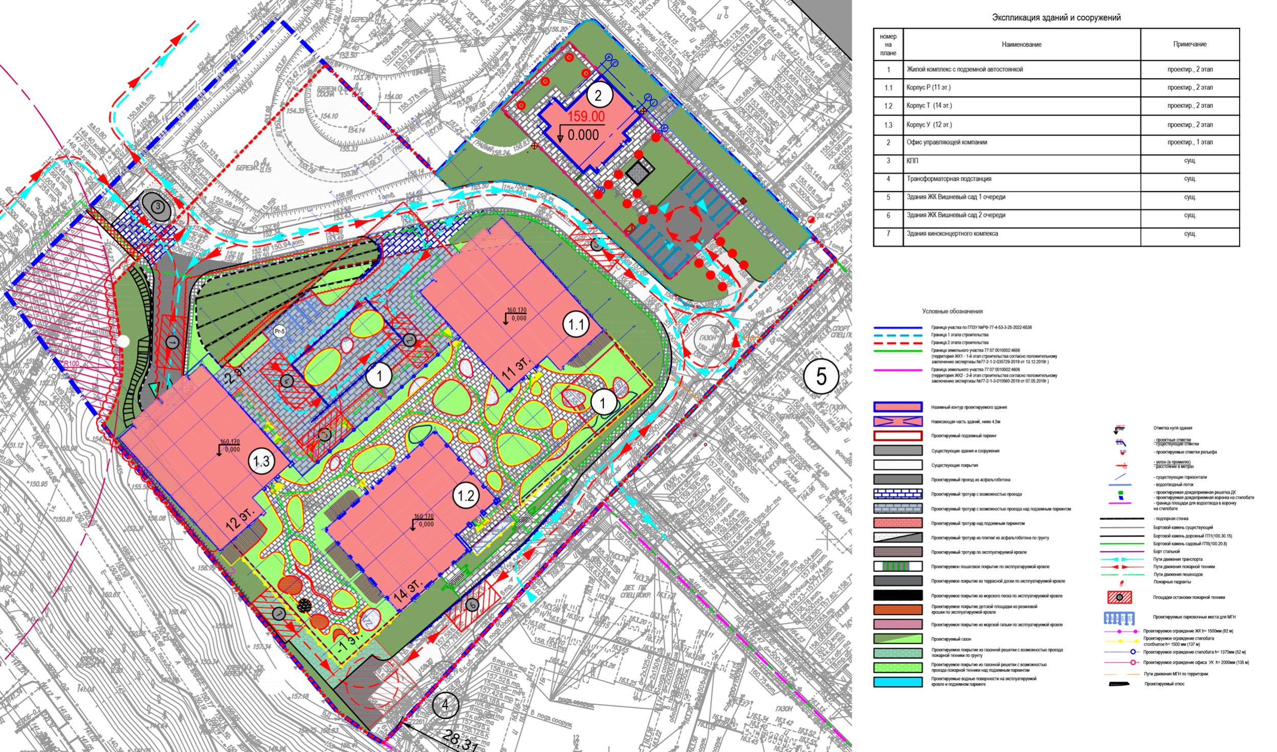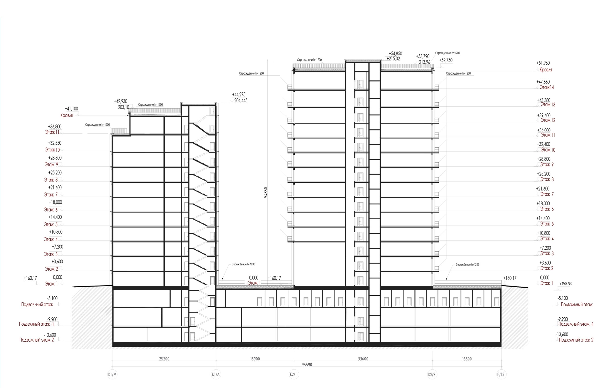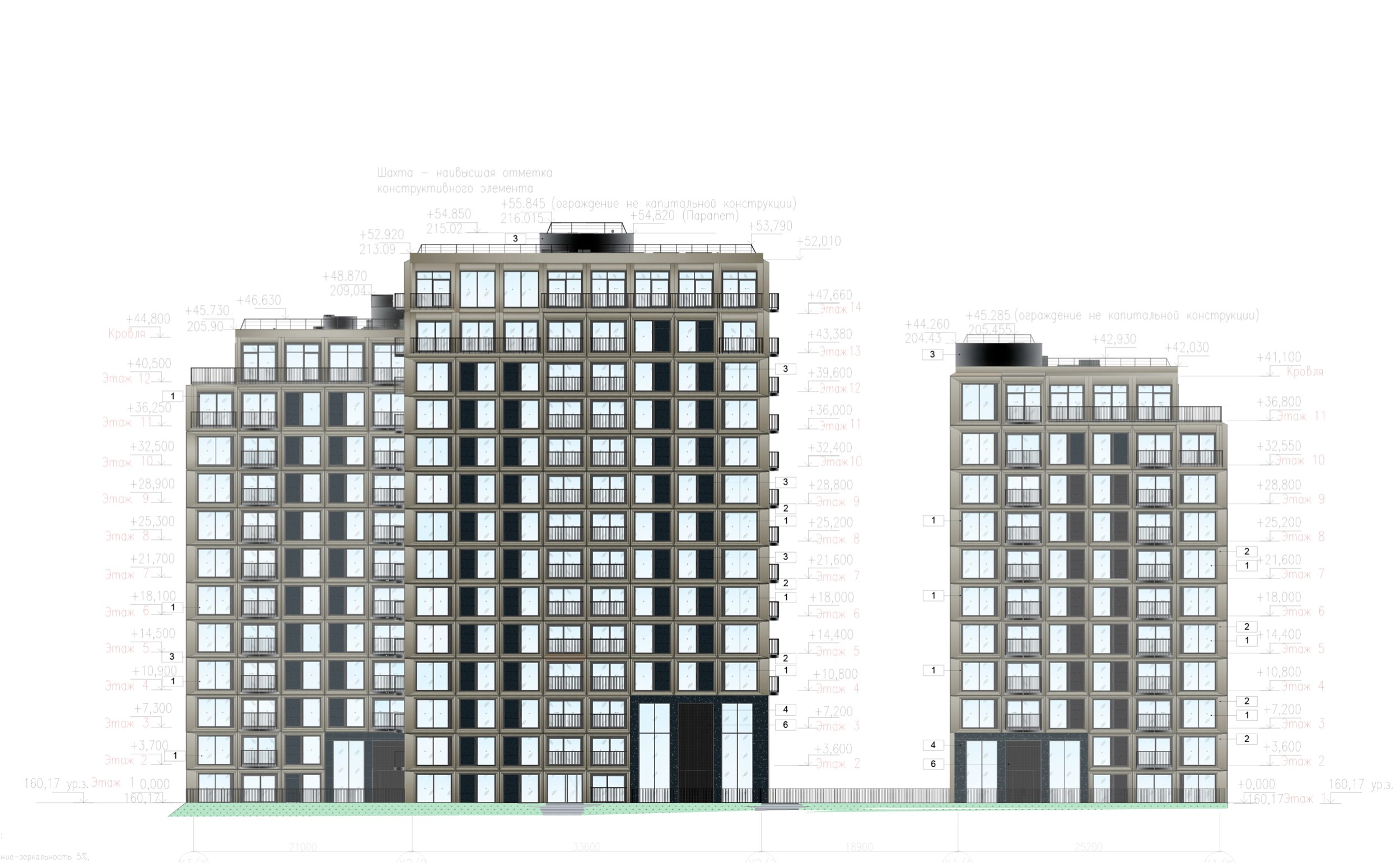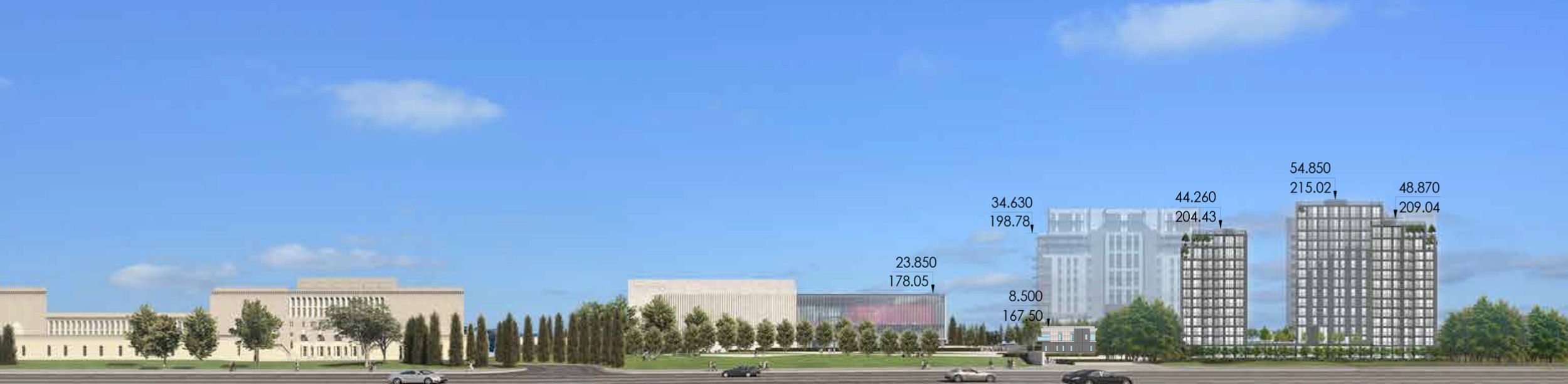 Композиционной основой застройки стали три объёма-куба высотой 11, 12 и 14 этажей. Такая градация учитывает рельеф участка и формирует плавный переход от фронта Мосфильмовской улицы к глубине территории, подчёркивая динамику силуэта и обеспечивая органичное включение комплекса в сложившуюся городскую среду.