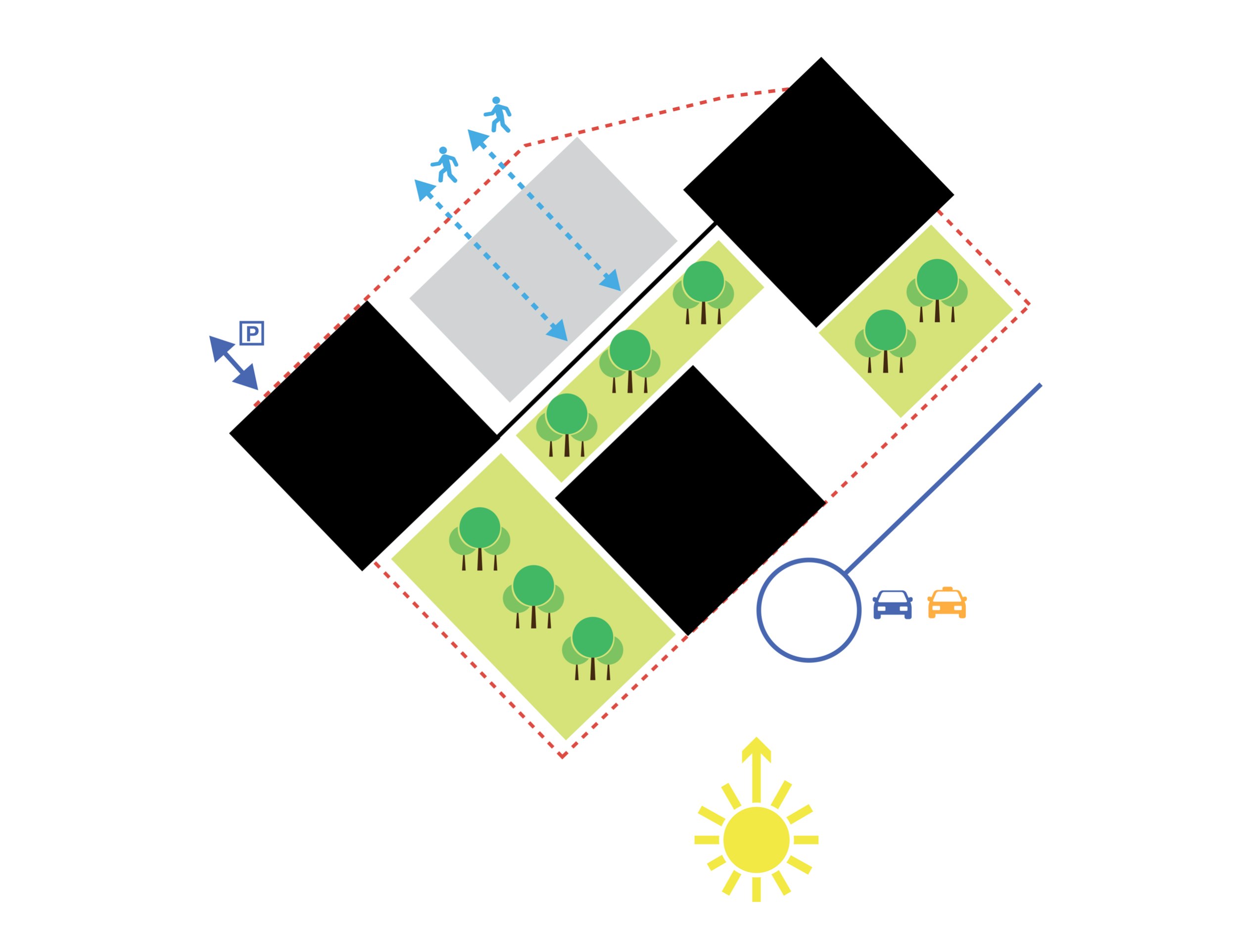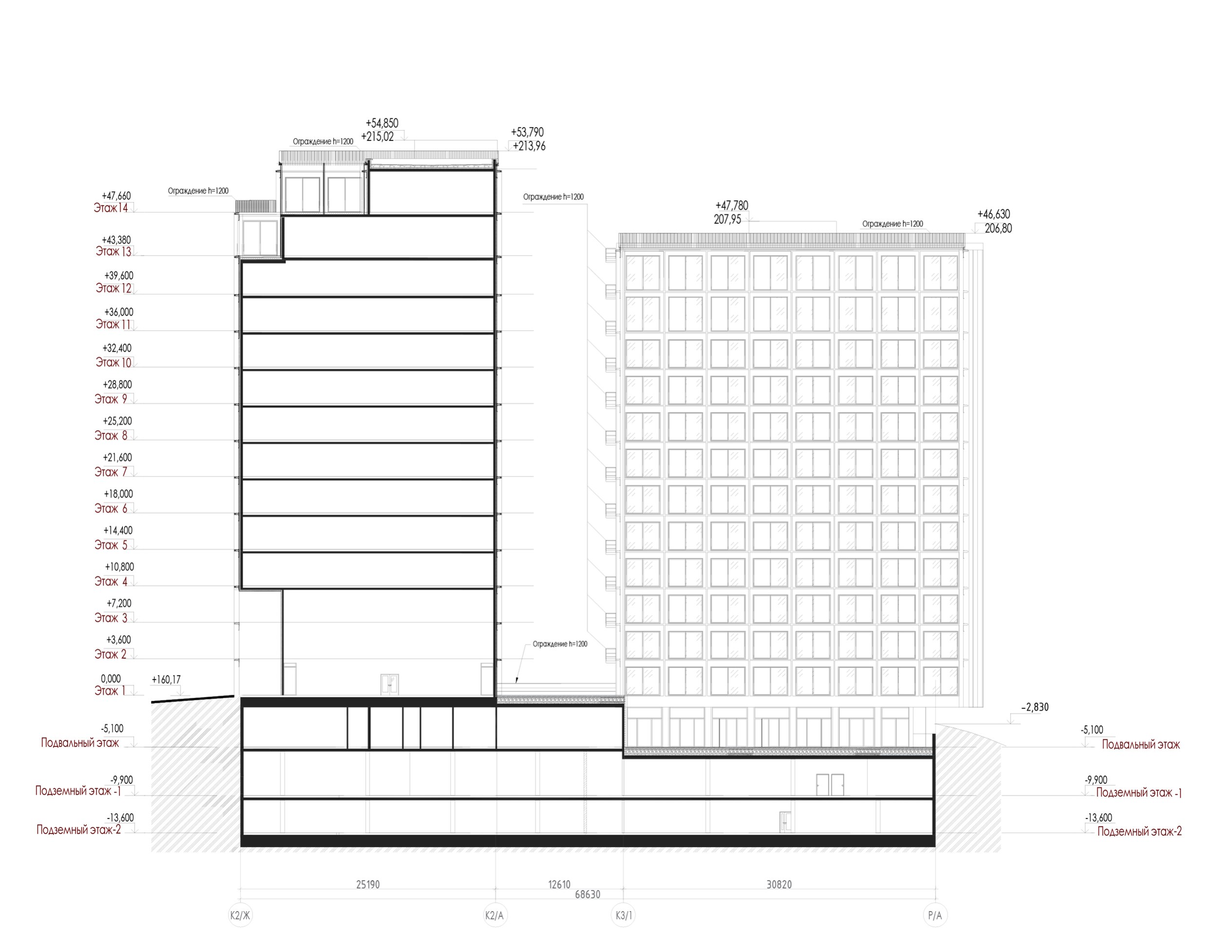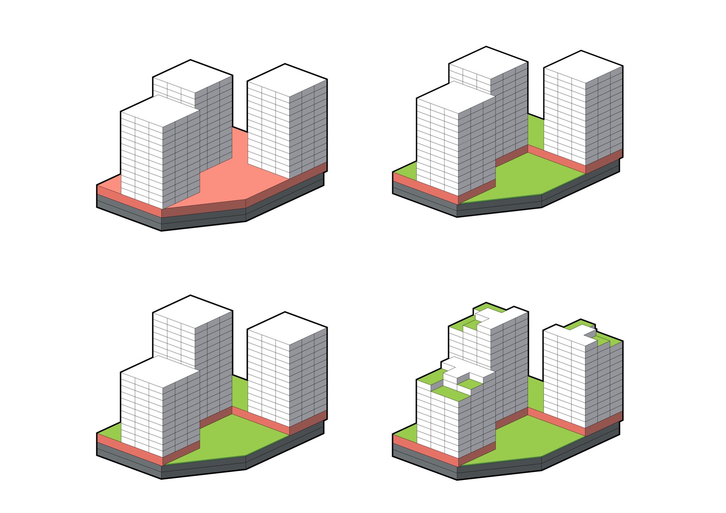 Общественные и приватные пространства разведены по вертикали. На уровне цоколя со стороны улицы сформирована открытая городская плаза с кафе, ресторанами и бутиками, продолжающая уличную активность. Приватный сад для жителей приподнят до уровня первого жилого этажа, создавая более камерную, защищённую и спокойную атмосферу.