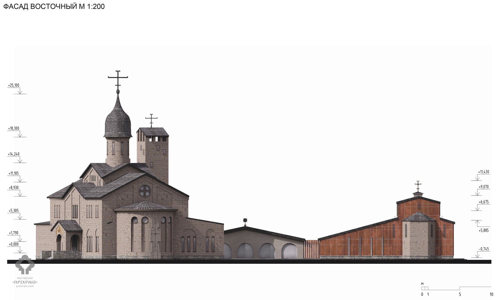 Базиликальный храм выполнен в византийской традиции и представляет собой базилику продольной планировки. Это каркасное строение; фасады – кортеновская сталь и натуральный камень. Световые проемы выдержаны в определенном ритме: снизу они более длинные, а к верхним ярусам становятся всё короче.