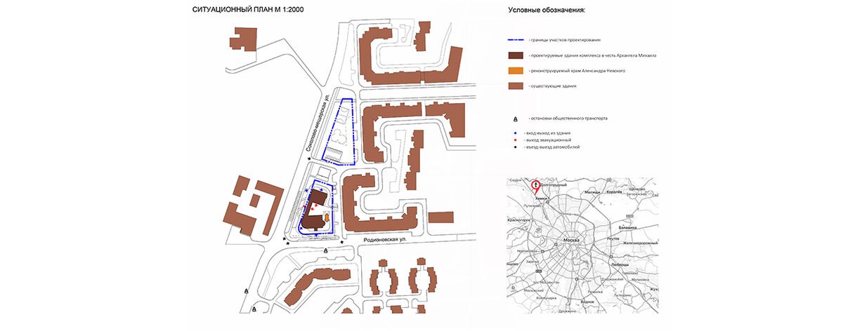 Участок проектирования Храмового комплекса в честь святого Архангела Михаила расположен в Северо-западном административном округе Москвы, на территории муниципального образования Куркино, по адресу: ул. Соколово-Мещерская, владения 8 и 10. Площадь земельных участков составляет 0,37 га и 0,39 га. На участке вл. 8 располагается действующий православный храм в честь святого Александра Невского.