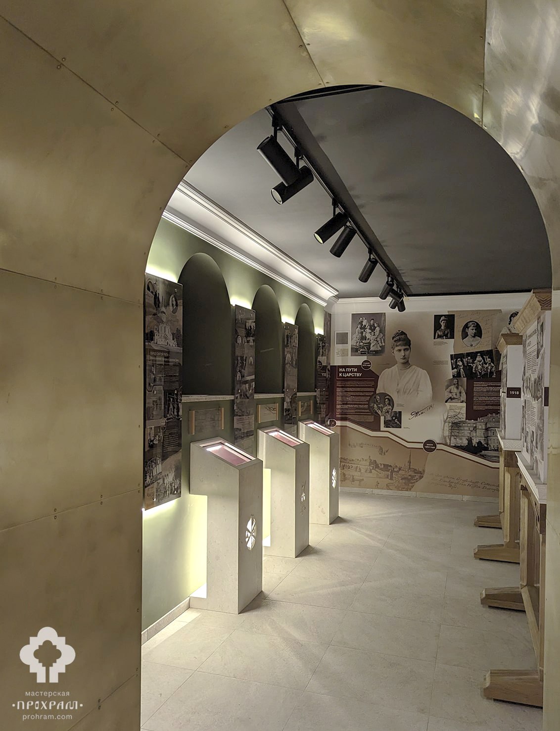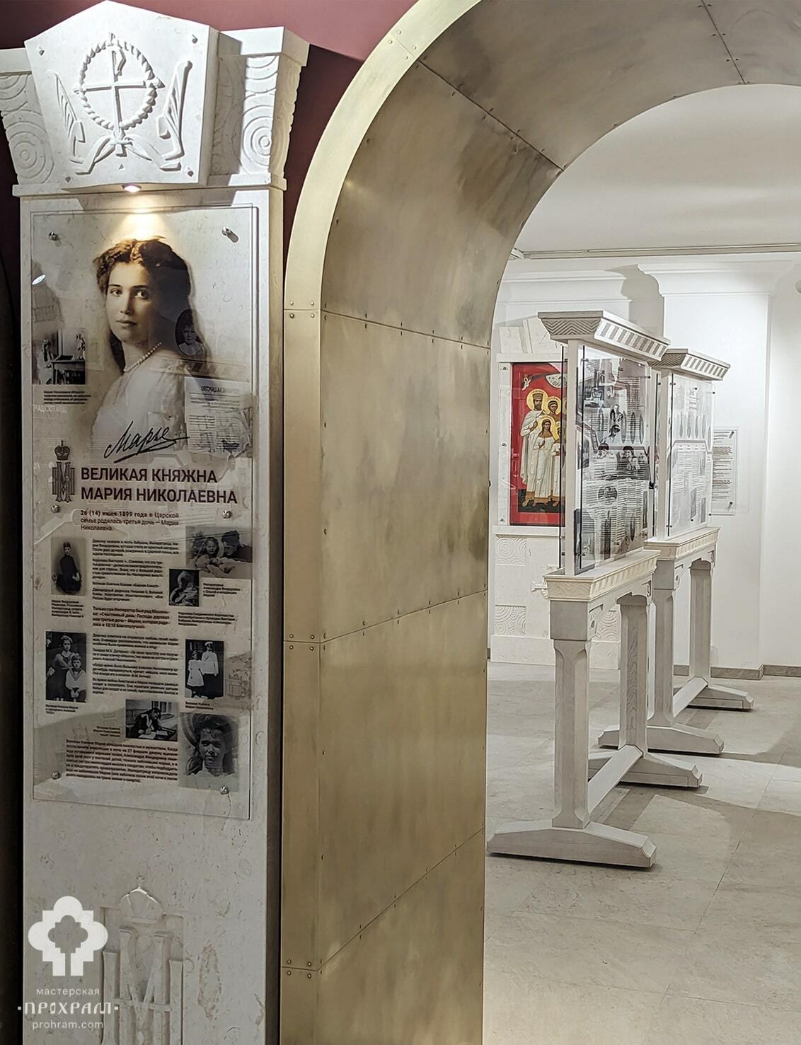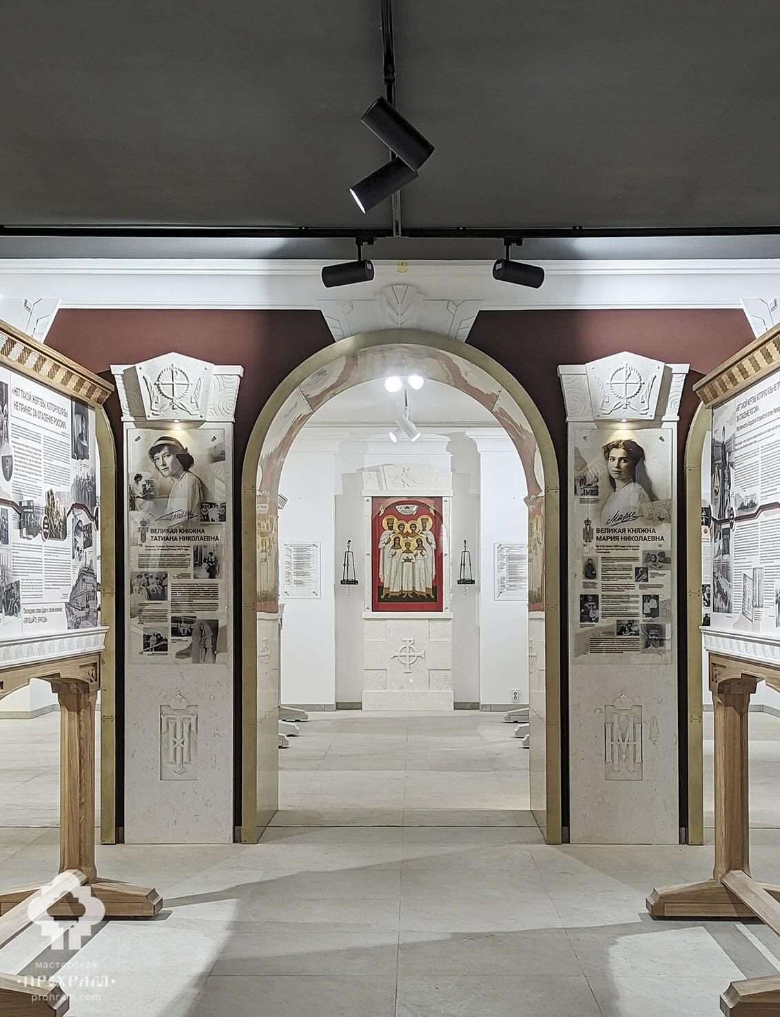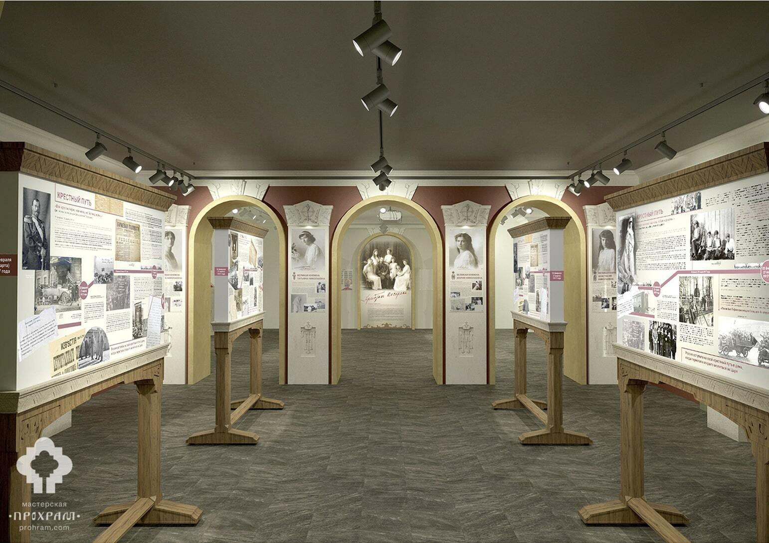 В экспозиции используются 4 двухсторонних передвижных стенда на маленьких колесах со стопорами. Стенды можно раздвигать для организации большого пространства зала. У северной и южной стен установлены резные белокаменные аналои с резьбой, работающей на просвет в нижней части и открывающимися крышками сверху, под которыми размещены реликвии времен Императора Николая II. Также по стенам расположены стенды (печать на стекле, печать на пластике) с подсветкой. В восточной части зала обустроен переход через три латунные декоративные арки в белый зал. Между арками спроектированы 4 стенда-киота из белого камня с резьбой (инициалы), стеклом, подсветкой и резным навершием, посвященные Великим Княжнам Ольге, Татиане, Марии, Анастасии. Потолок темный, с размещением на нем трековых светильников рассеянного и направленного света.