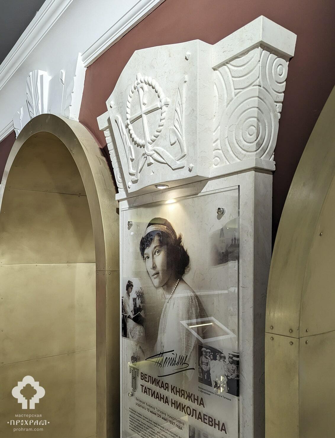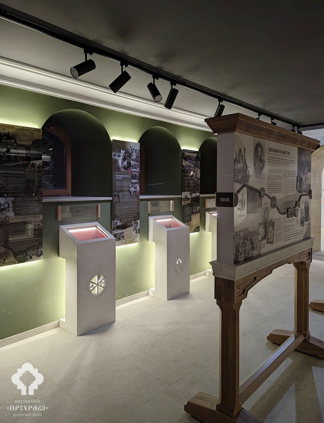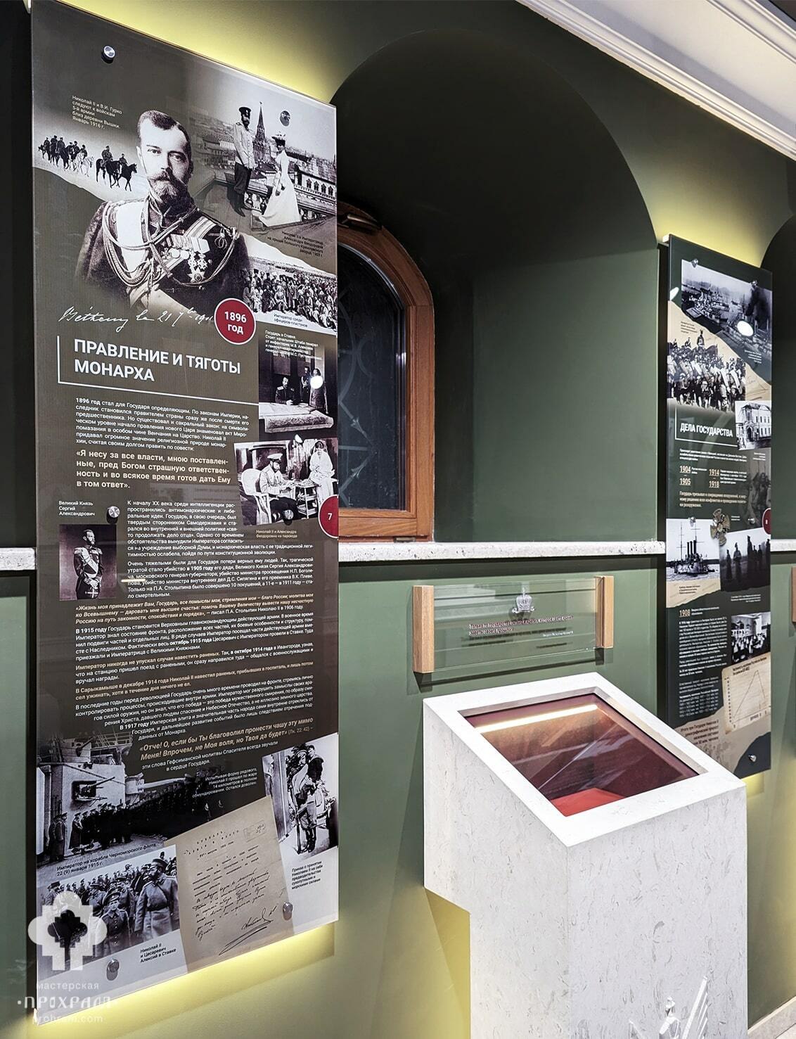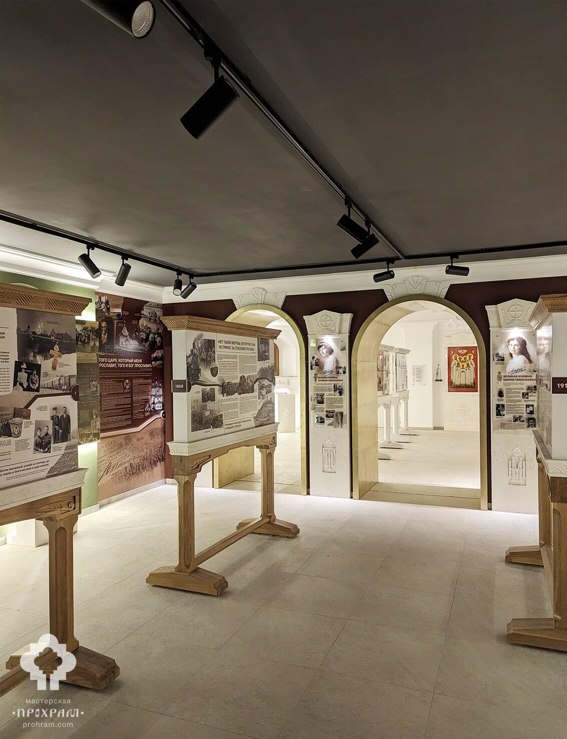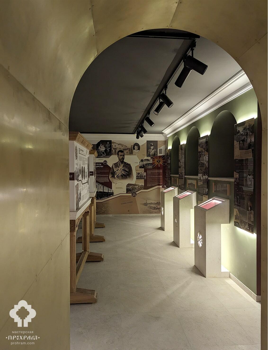 В экспозиции используются 4 двухсторонних передвижных стенда на маленьких колесах со стопорами. Стенды можно раздвигать для организации большого пространства зала. У северной и южной стен установлены резные белокаменные аналои с резьбой, работающей на просвет в нижней части и открывающимися крышками сверху, под которыми размещены реликвии времен Императора Николая II. Также по стенам расположены стенды (печать на стекле, печать на пластике) с подсветкой. В восточной части зала обустроен переход через три латунные декоративные арки в белый зал. Между арками спроектированы 4 стенда-киота из белого камня с резьбой (инициалы), стеклом, подсветкой и резным навершием, посвященные Великим Княжнам Ольге, Татиане, Марии, Анастасии. Потолок темный, с размещением на нем трековых светильников рассеянного и направленного света.