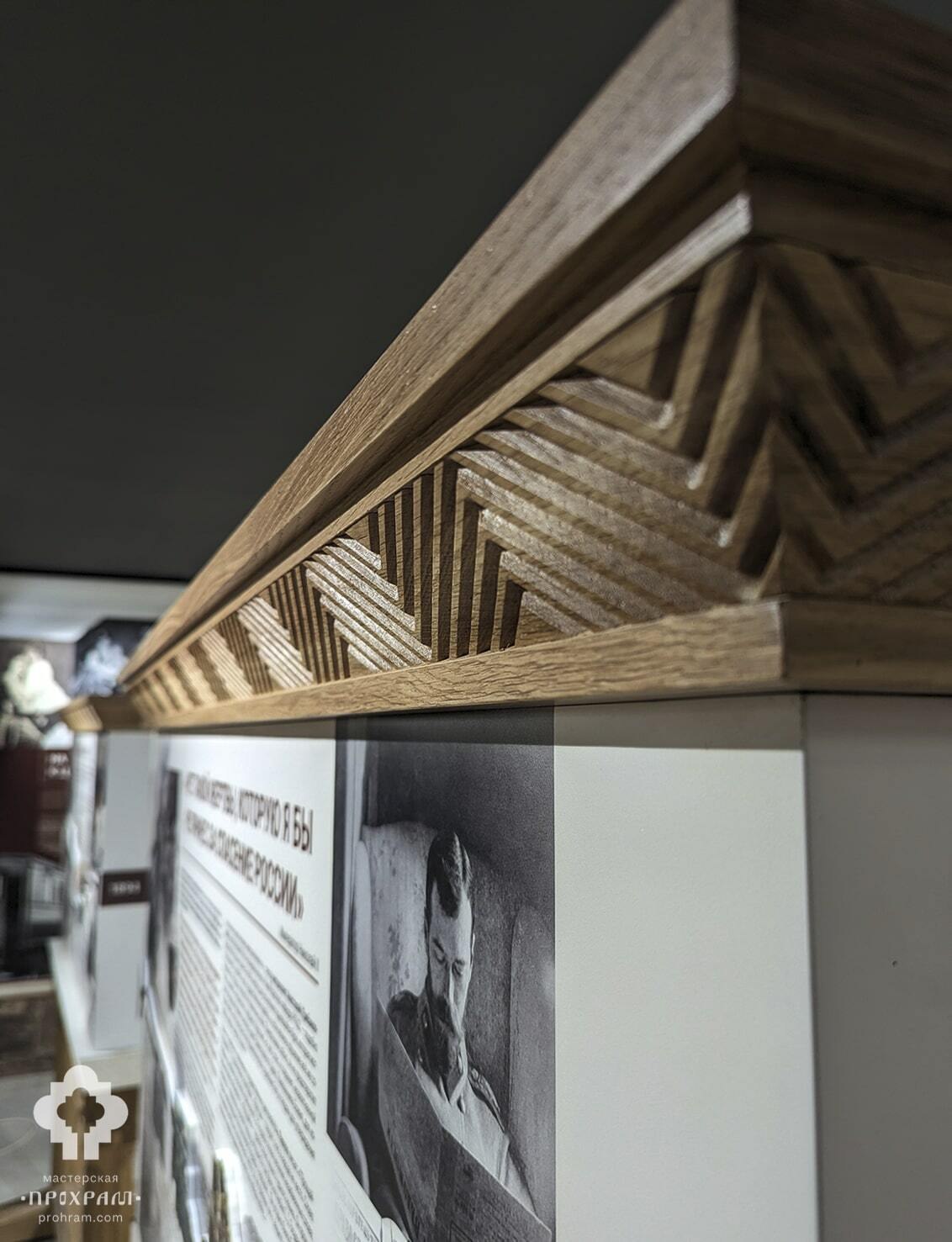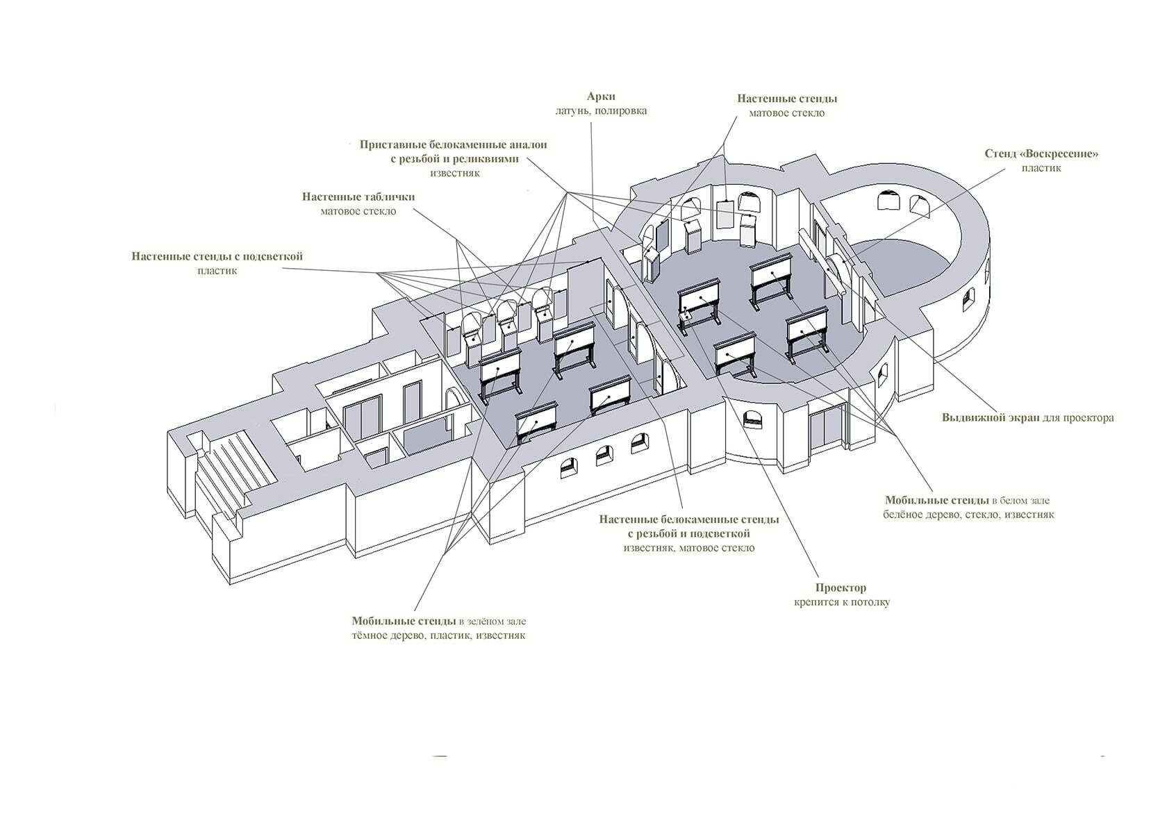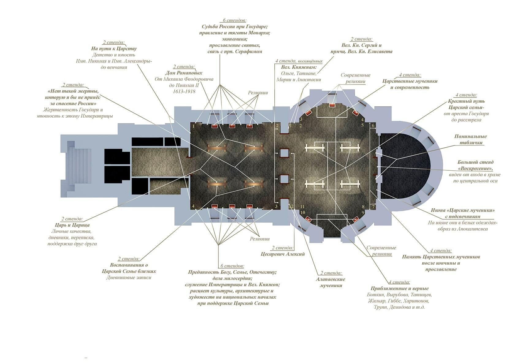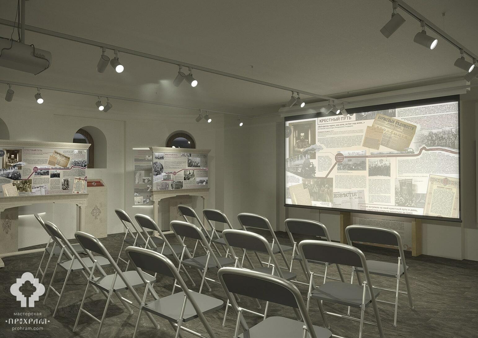 В экспозиции используются 4 двухсторонних передвижных стенда на маленьких колесах со стопорами. Стенды можно раздвигать для организации большого пространства зала. У северной и южной стен установлены резные белокаменные аналои с резьбой, работающей на просвет в нижней части и открывающимися крышками сверху, под которыми размещены реликвии времен Императора Николая II. Также по стенам расположены стенды (печать на стекле, печать на пластике) с подсветкой. В восточной части зала обустроен переход через три латунные декоративные арки в белый зал. Между арками спроектированы 4 стенда-киота из белого камня с резьбой (инициалы), стеклом, подсветкой и резным навершием, посвященные Великим Княжнам Ольге, Татиане, Марии, Анастасии. Потолок темный, с размещением на нем трековых светильников рассеянного и направленного света.