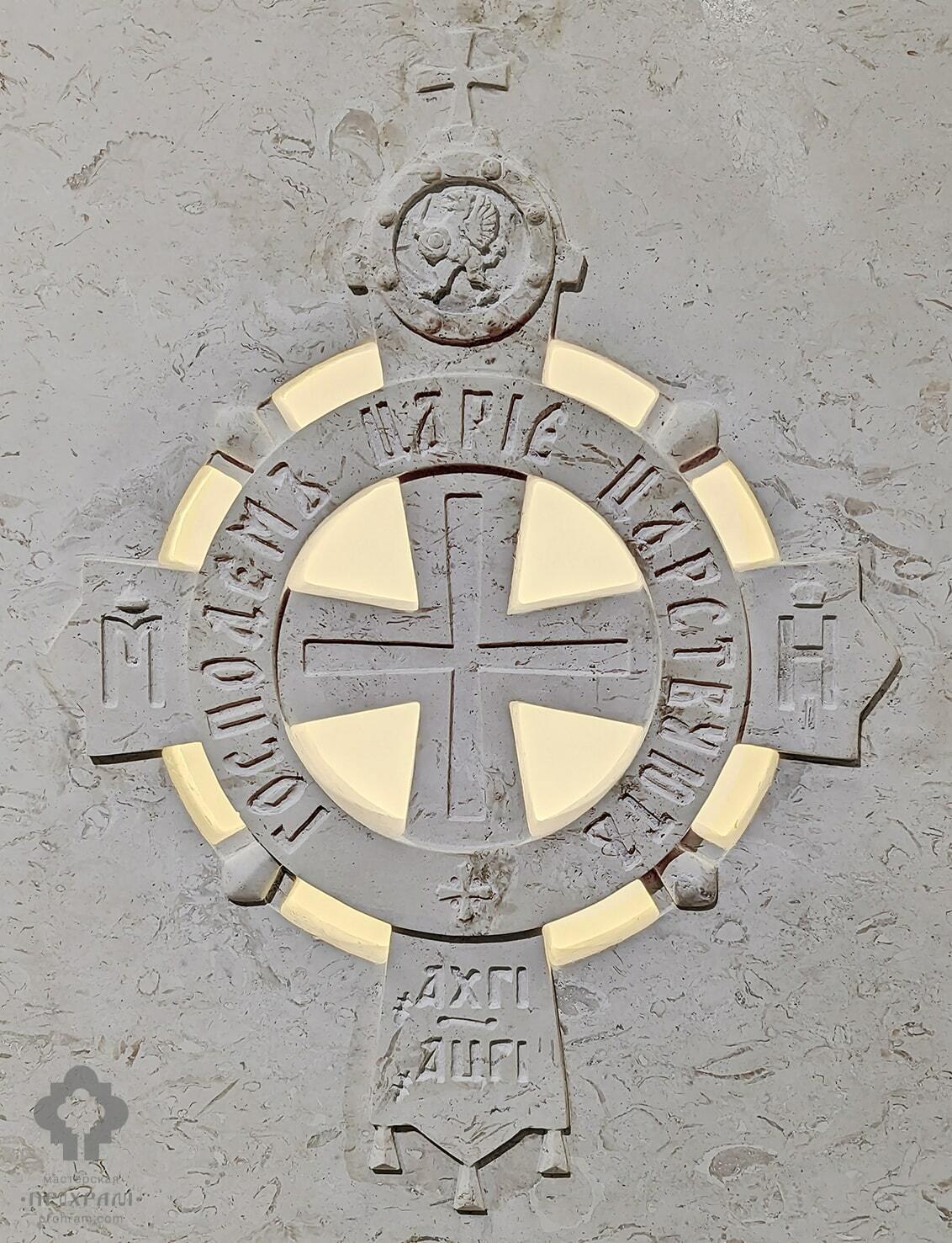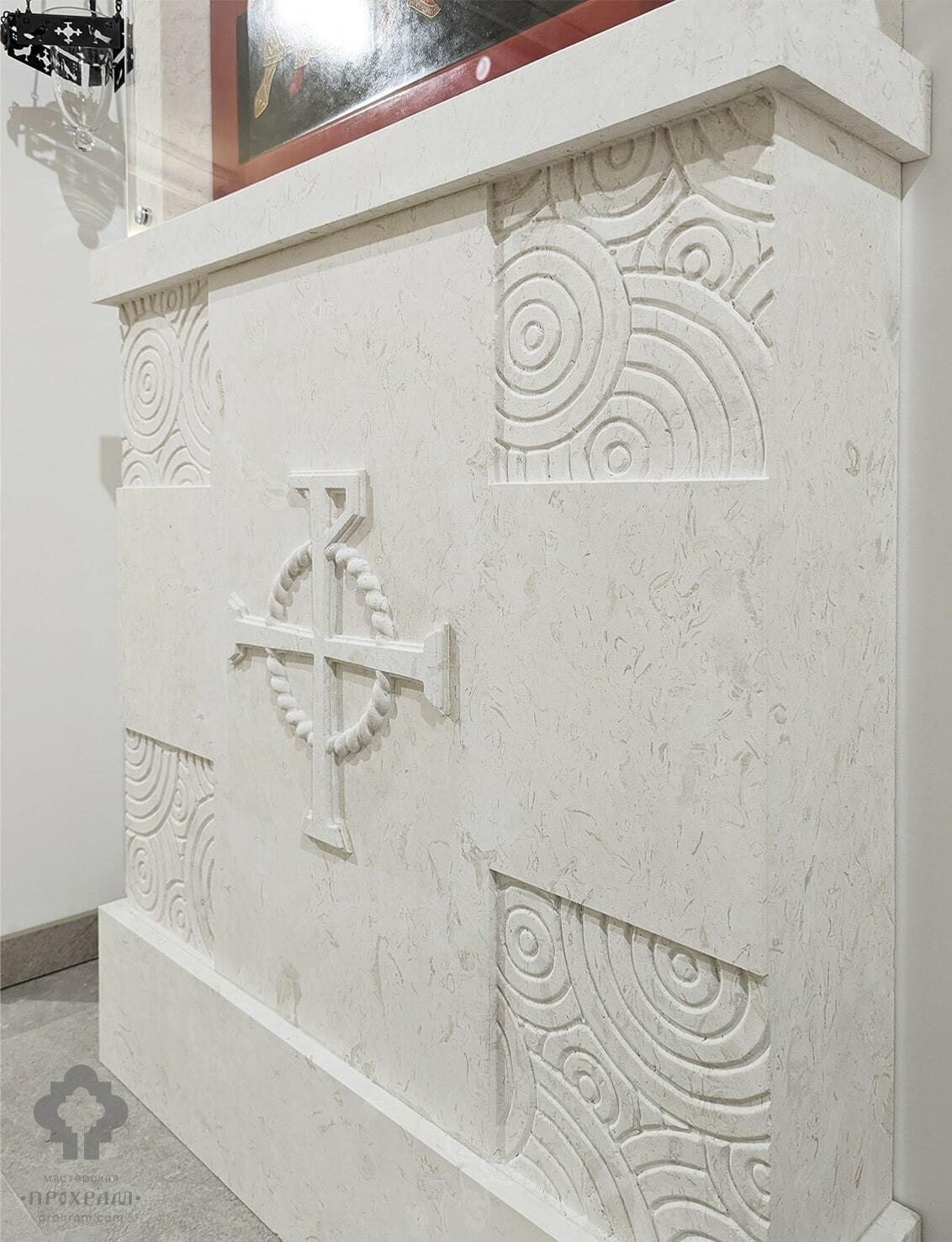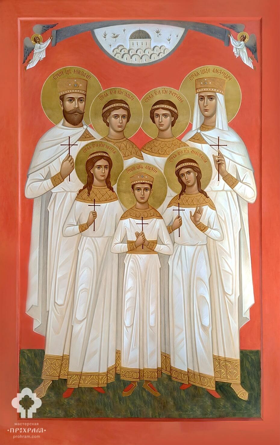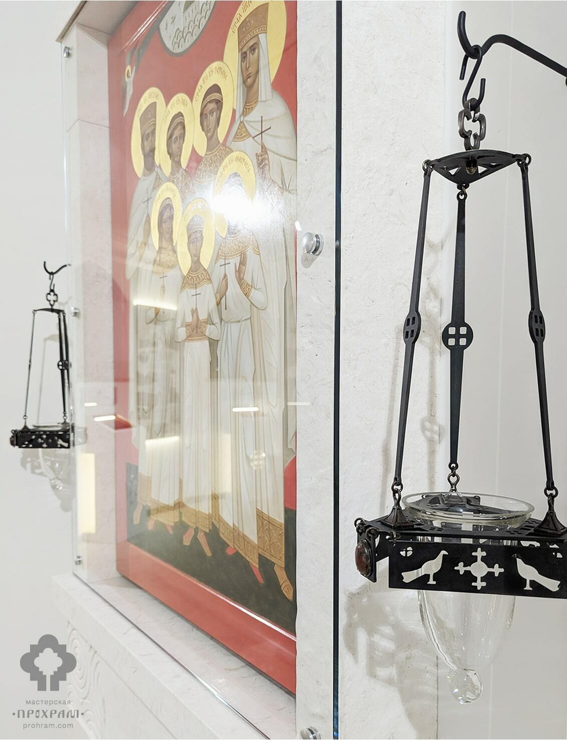 Венчает зал большой резной киот с иконой Царственных мучеников, видный от самого входа еще в бордово-зеленый зал. Святые изображены в белых одеждах с отсылкой к апокалиптическому образу побеждающих земные страдания и верных Христу мучеников (ср. Откр. 6: 9-12).