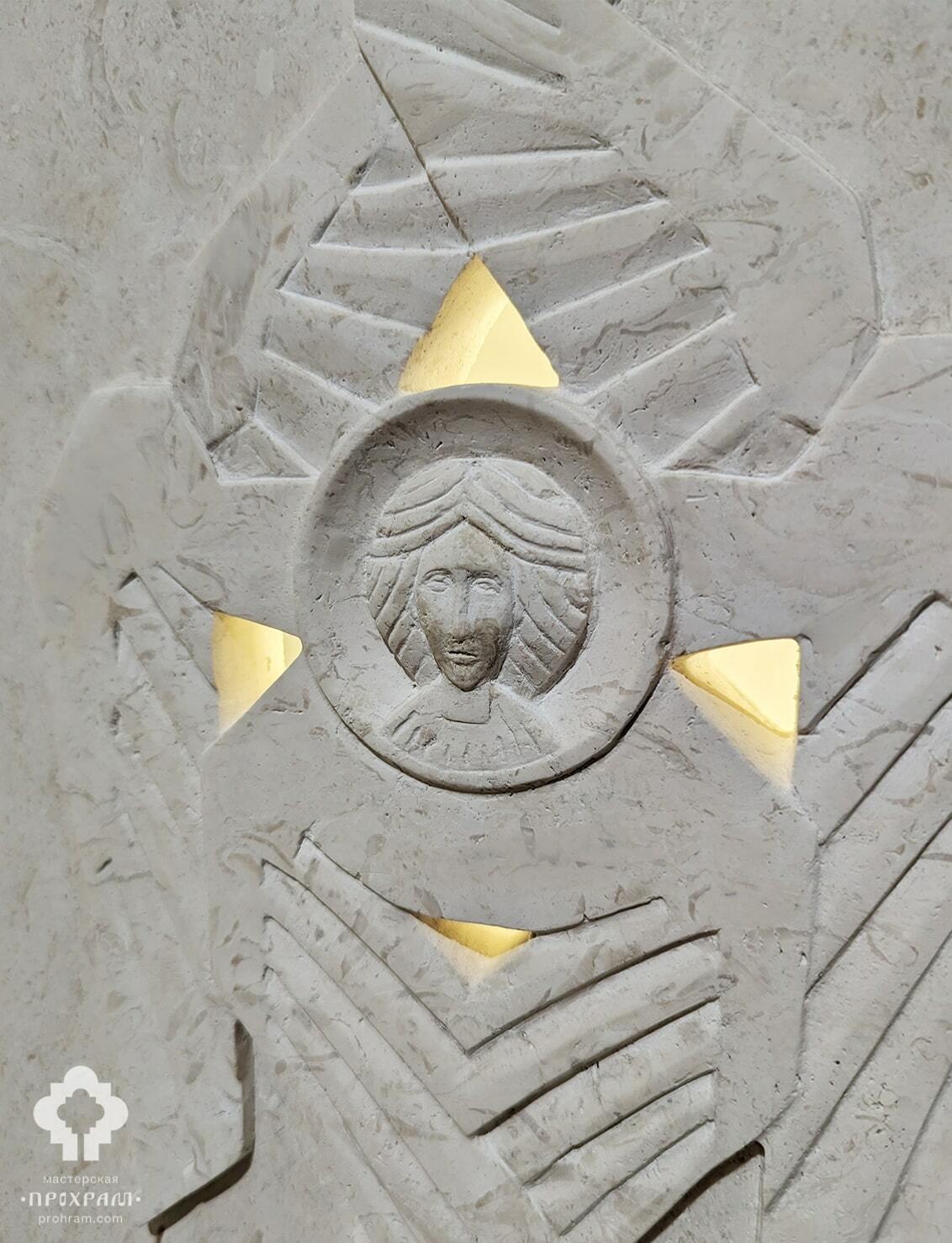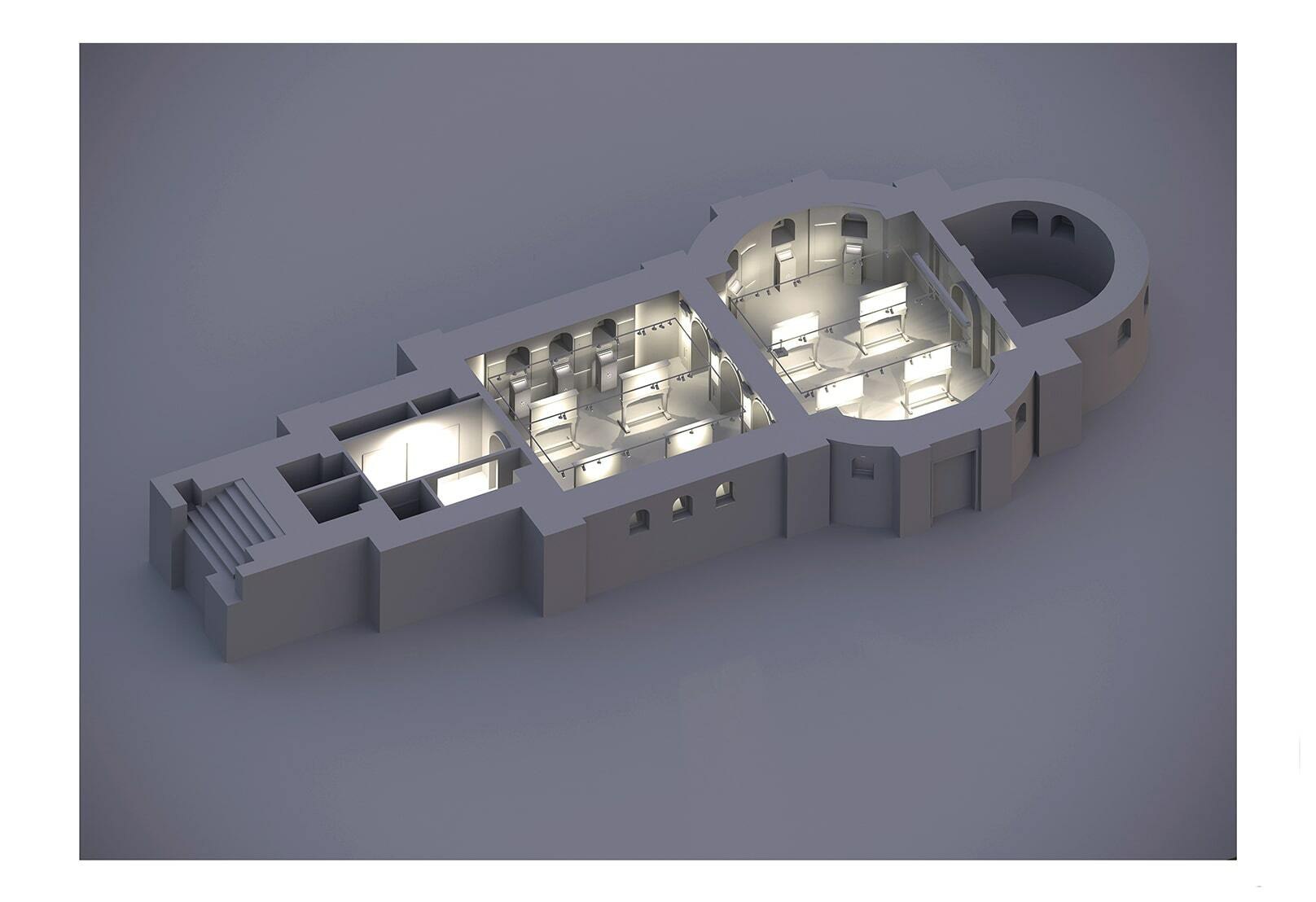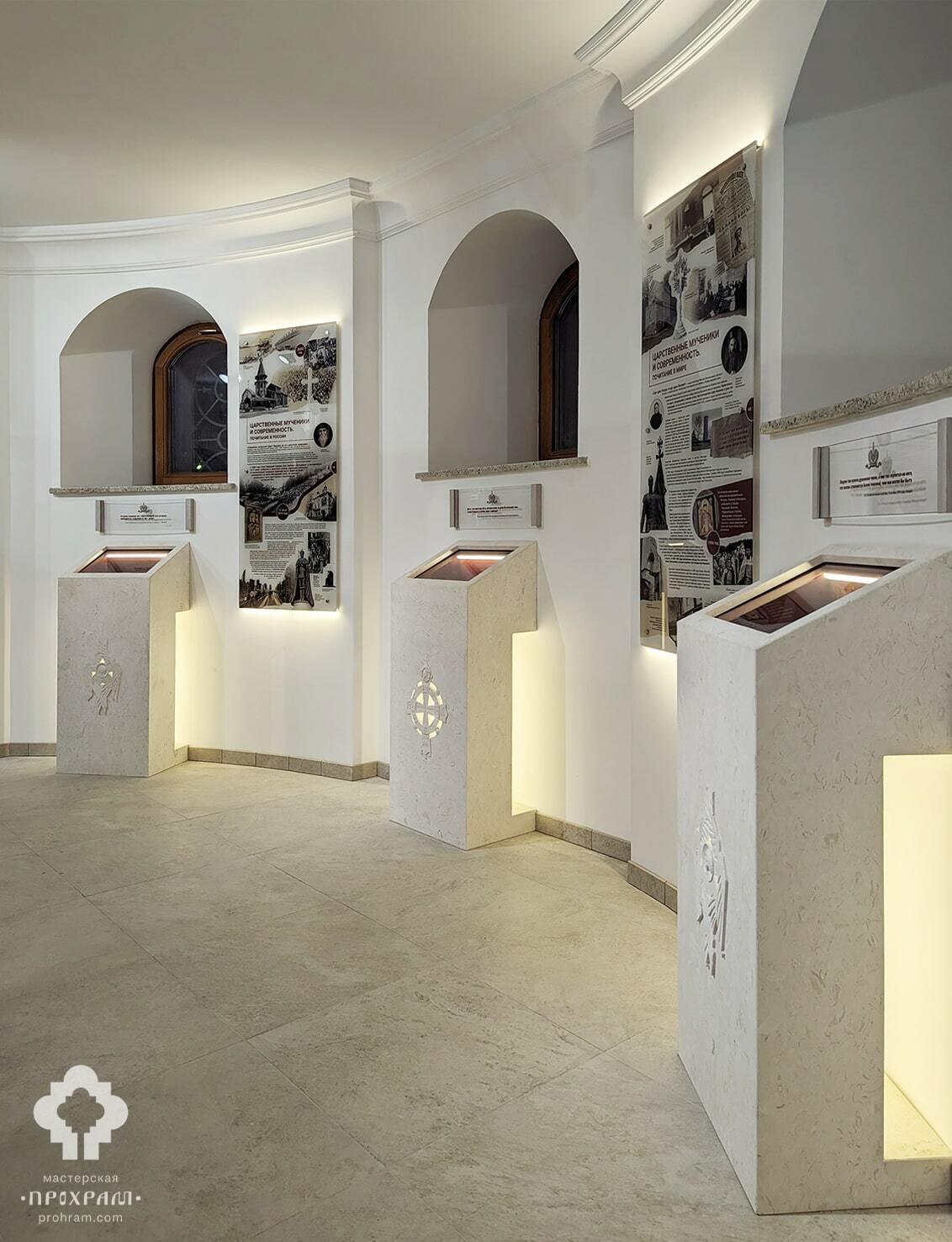Интерьеры нижнего уровня храма в честь святых Царственных мучеников в городе Дно Псковской области выполнены в синтезе решений организации современных экспозиционных пространств в сочетании с ориентацией на неорусский стиль, характерный для начала ХХ века.
