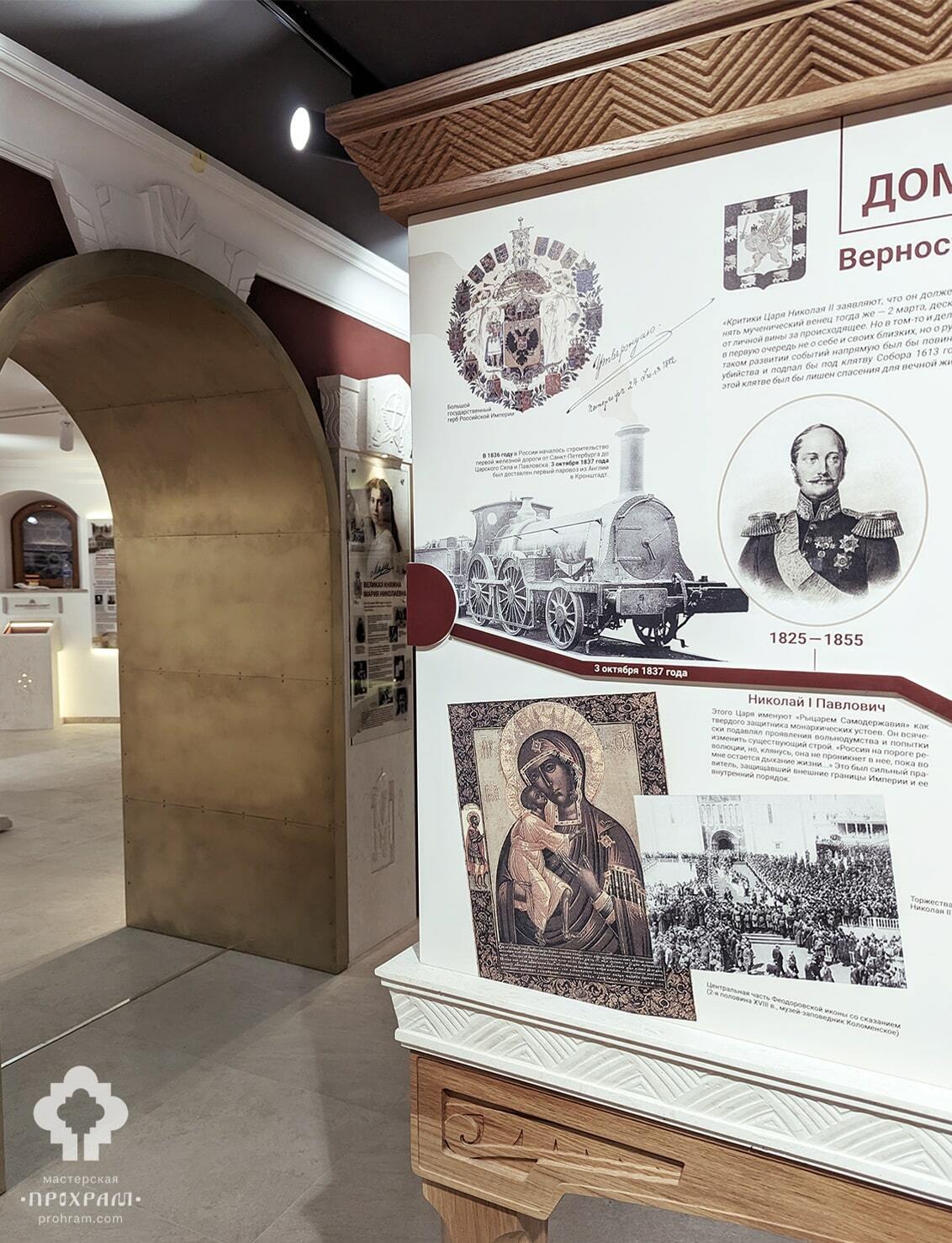 Экспозиция развивает содержание альбома «Крестный путь», выпущенного мастерской «Прохрам» в 2021 году (рекомендован к публикации Издательским советом Белорусской Православной Церкви ИС Б21-102-0008), при полностью новом дизайне. Лейтмотив экспозиции – образ жизненного пути как железной дороги, тем более что Романовы много путешествовали на поездах. Бордовая линия, переходящая от стенда к стенду, становится «линией жизни» со своими остановками и событиями.