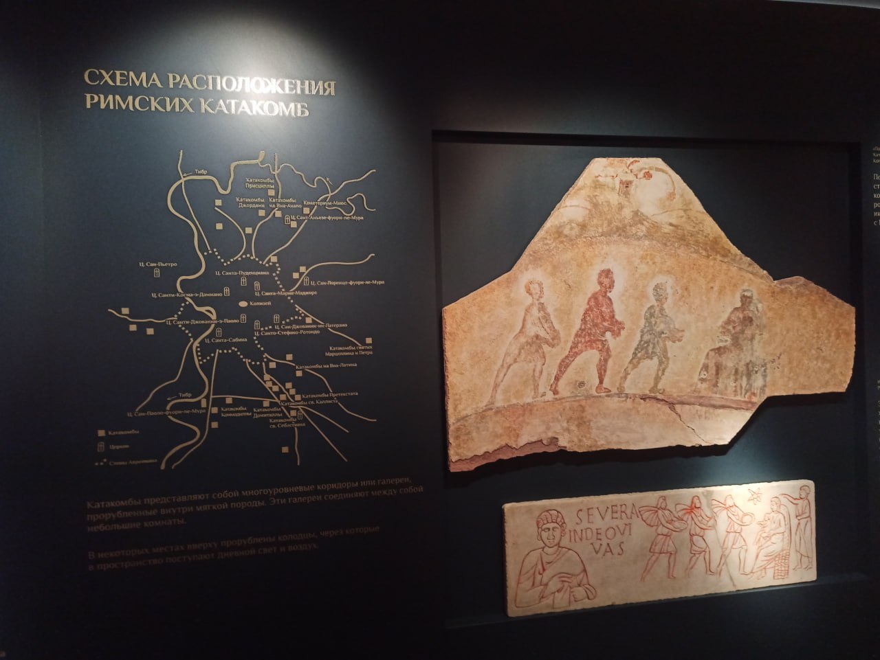 Пространство южного коридора посвящено самому понятию христианского искусства, символике и первому его периоду – до Миланского эдикта IV века, после которого христианство стало легальным. В витринах размещены копии фресок и надгробных плит из римских катакомб – одних из самых первых памятников раннехристианского искусства, когда новорожденное вероучение только обретало язык для своего материального выражения, иногда используя для этого нечто понятное и привычное, а иногда – нечто совершенно новое.